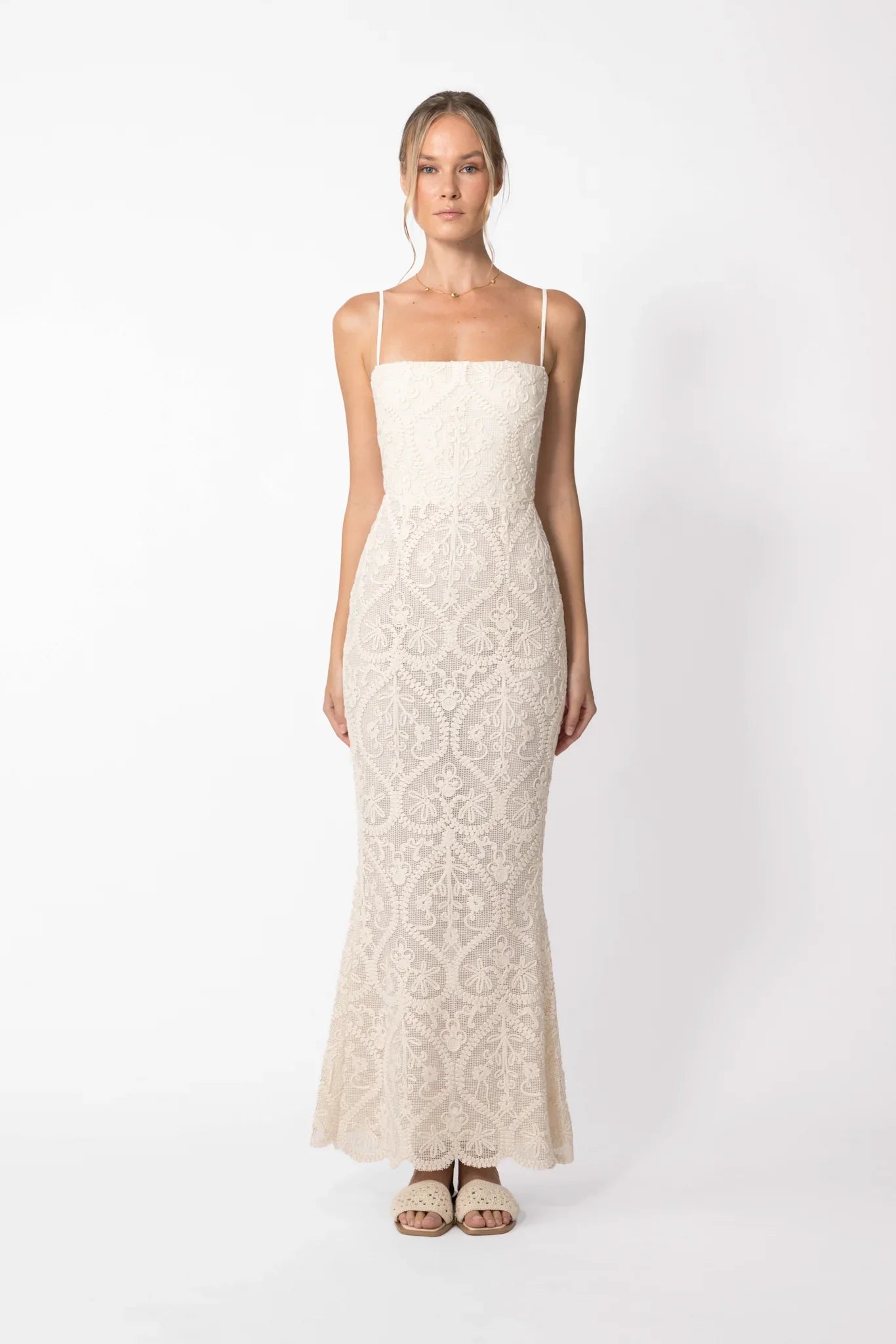 Soft crochet maxi sundress with scalloped hem featuring special heart-shaped pattern