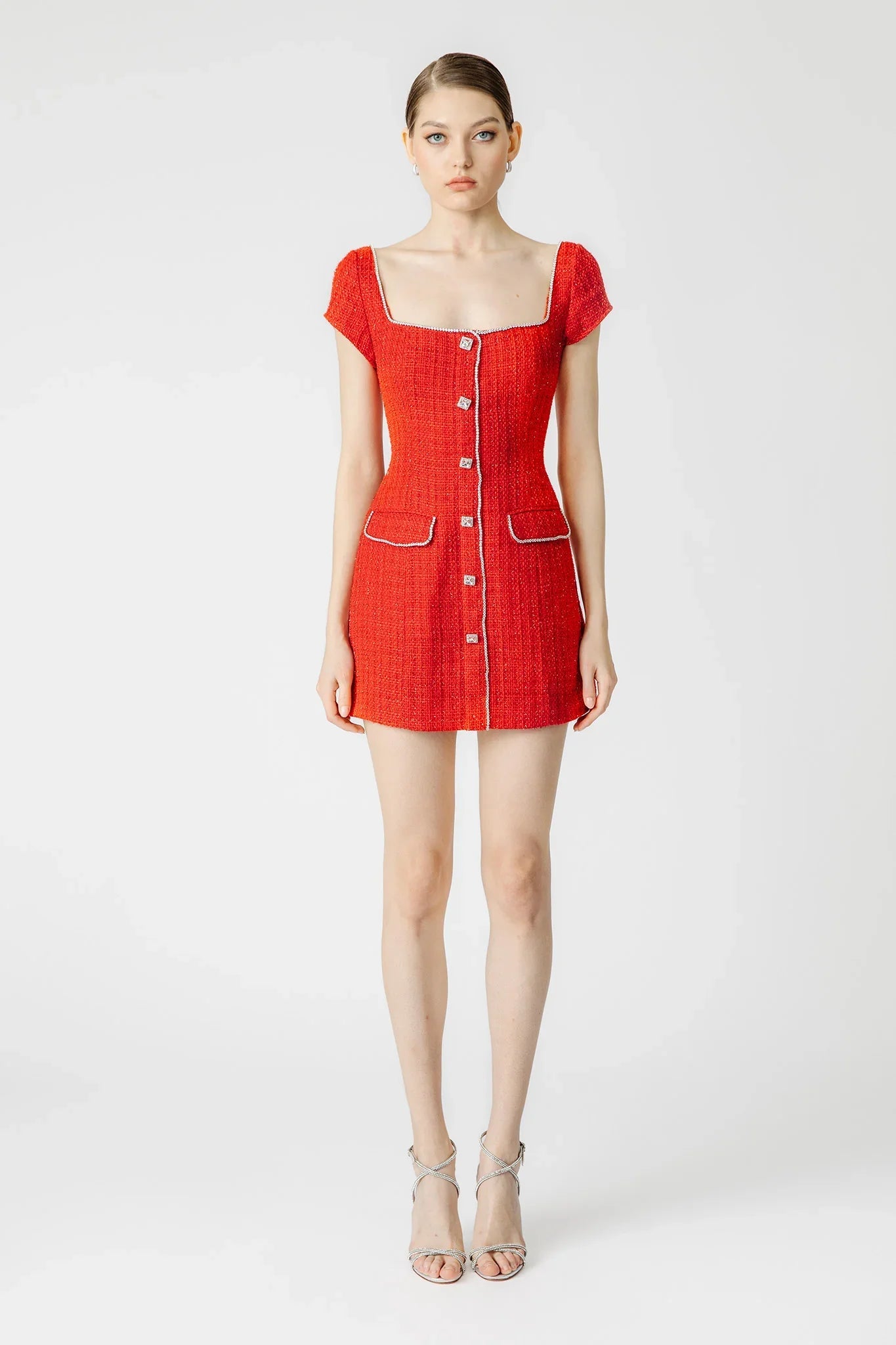 Annabelle is a fitted tweed mini dress with cap sleeves, traced with glittering crystals along the fitted square neckline and opening, and fastened by diamond-shaped buttons. Slip into this glamorous yet versatile piece that transitions seamlessly from day events to evenings out with fun flair.