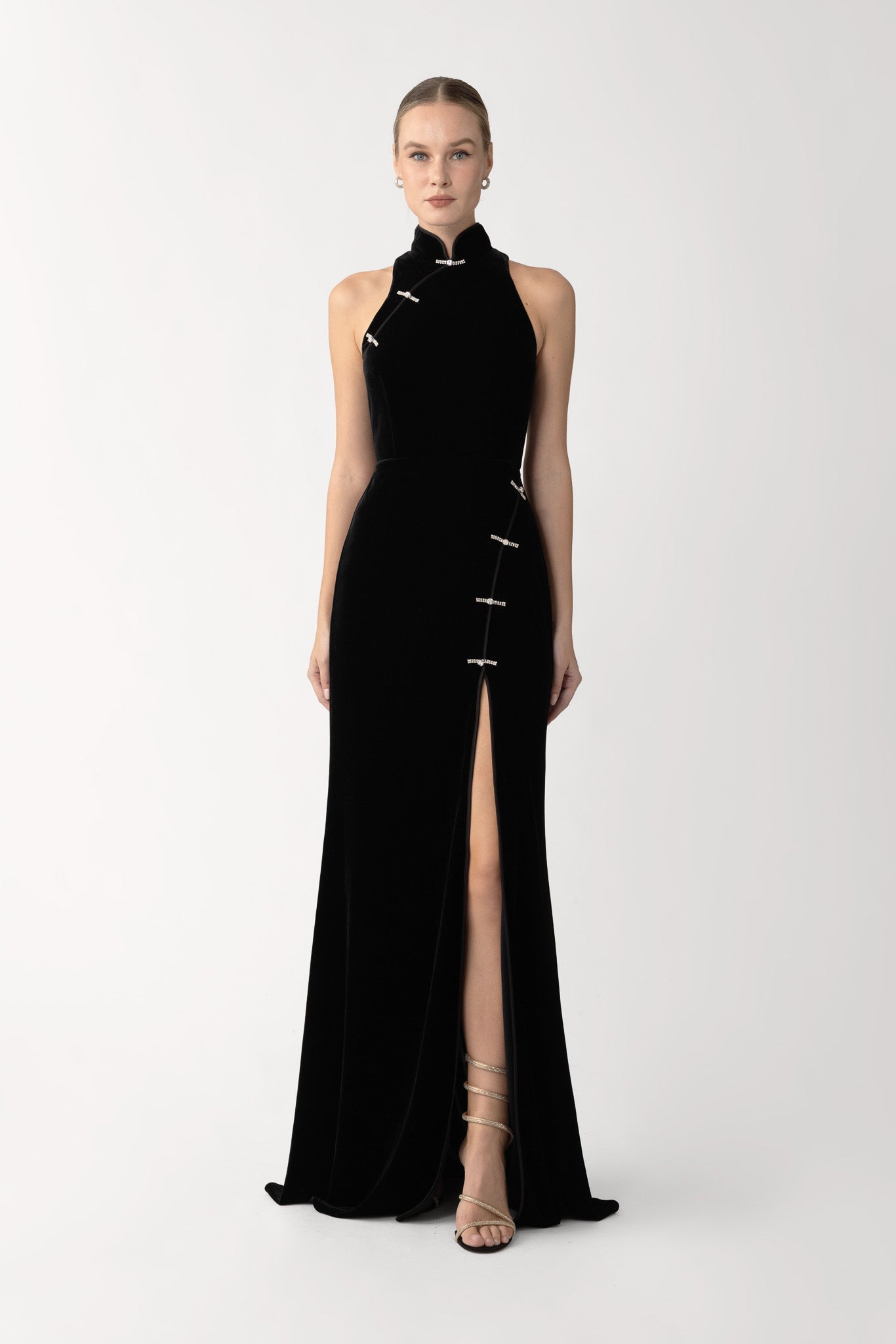 The Ariana Velvet Gown is cut from luxurious velvet in a modern cheongsam silhouette. Featuring a mandarin collar, crystal pankou buttons, and a thigh-high slit, it’s a bold expression of evening glamour.