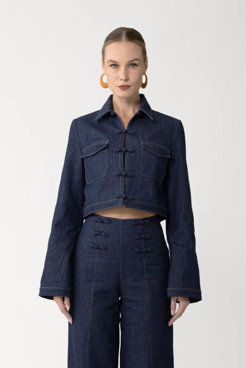 The Bambi Jacket is a cropped denim style with flared sleeves and signature hand-tied pipa knots along the front. An indispensable layer for cooler days.