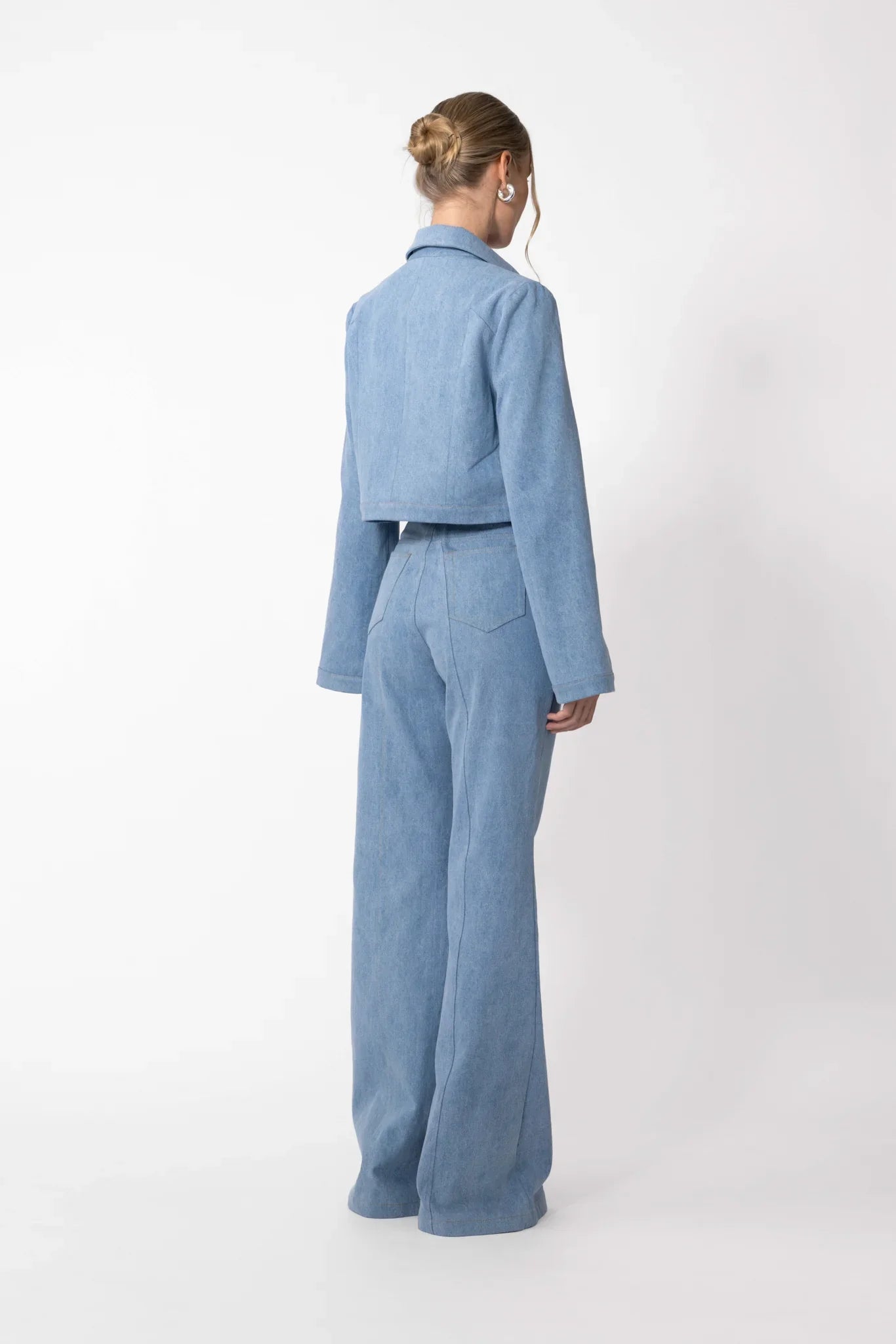 The Bambi Jacket is a cropped denim style with flared sleeves and signature hand-tied pipa knots along the front. An indispensable layer for cooler days.
