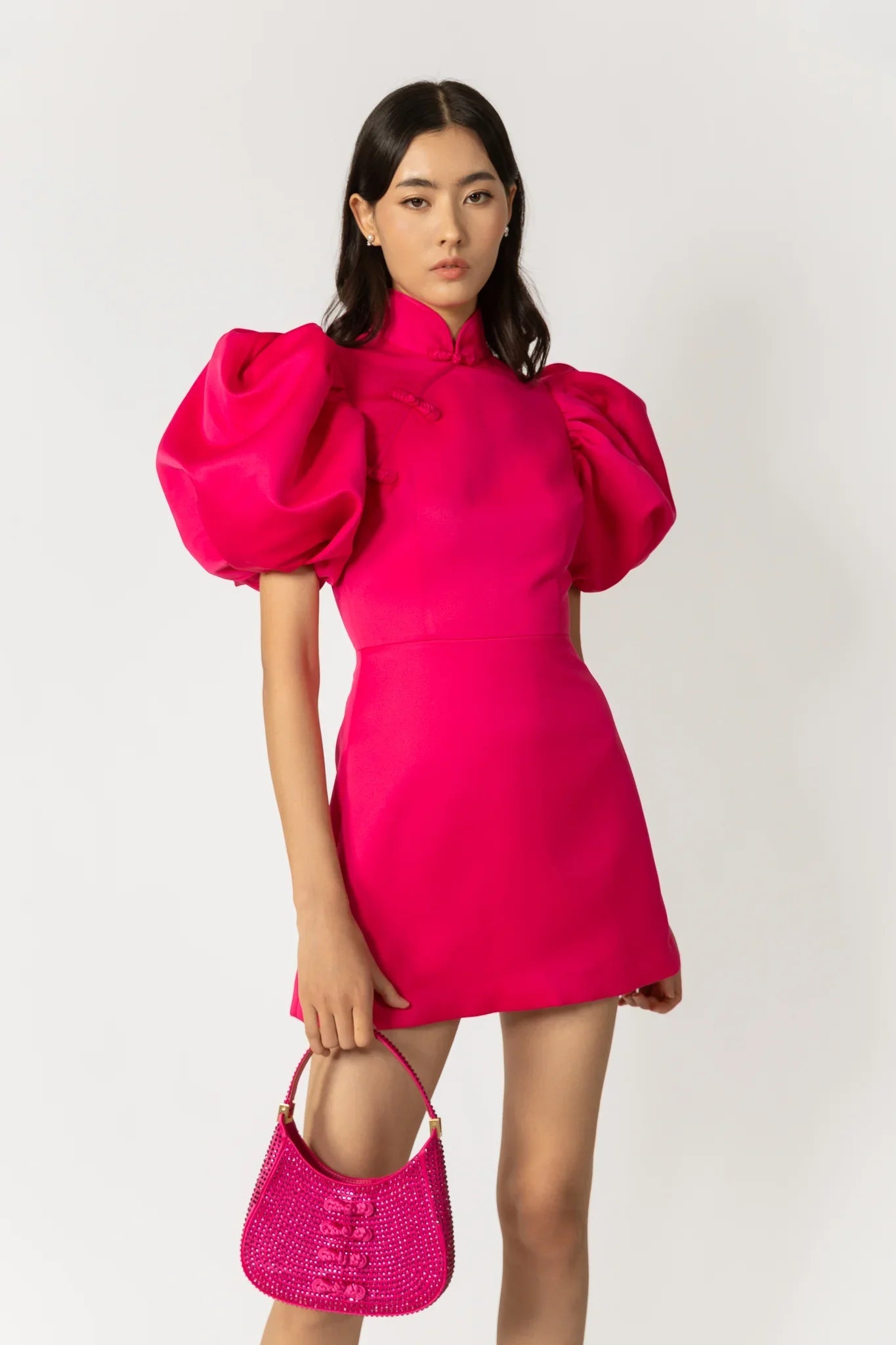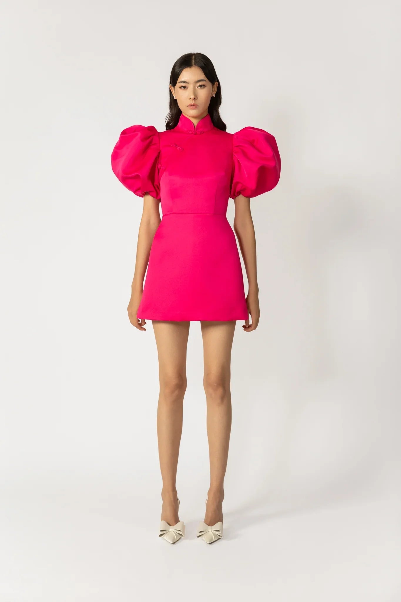 Beth is a Cheongsam-inspired mini dress encapsulating modern Eastern flair. Made from lush duchesse satin, it spotlights oversized puff sleeves, a Mandarin collar decorated with Chinese button accents, and a fitted upper half that tapers out into a flared skirt.
