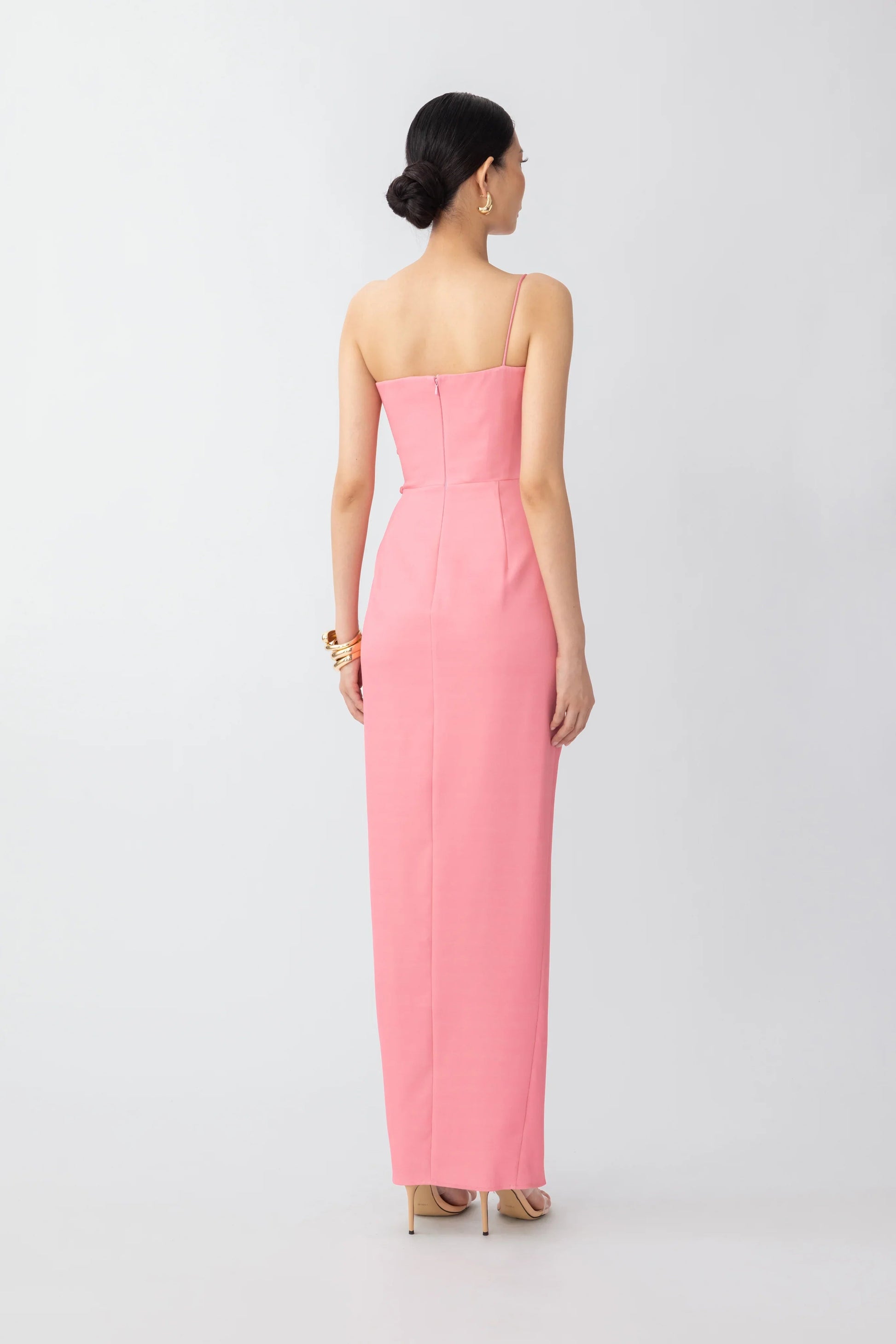 One-strap crepe maxi dress with a thigh-high slit featuring our signature hand-tied pipa knot button detail