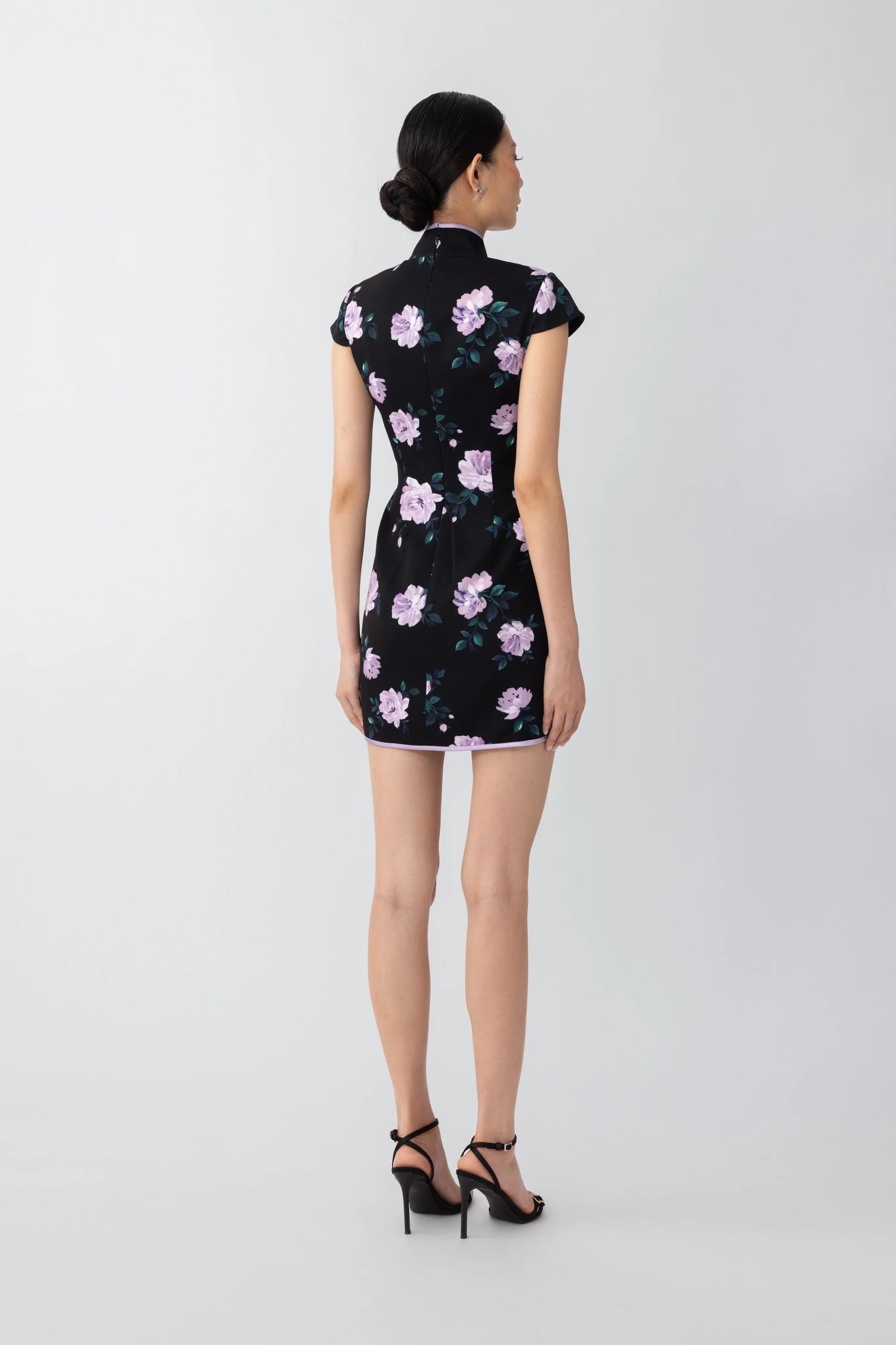 Crepe Cheongsam mini dress with a keyhole cutout featuring bow details and a lavender flower print