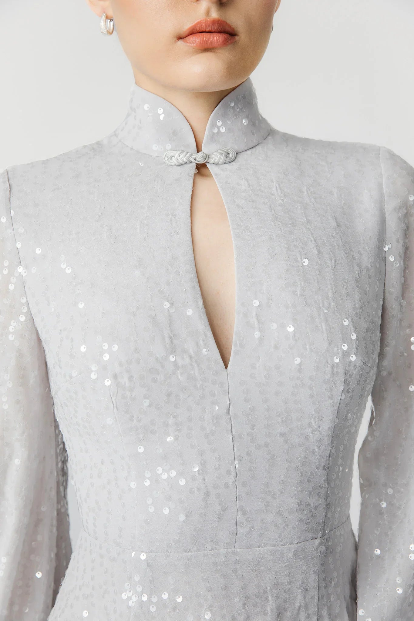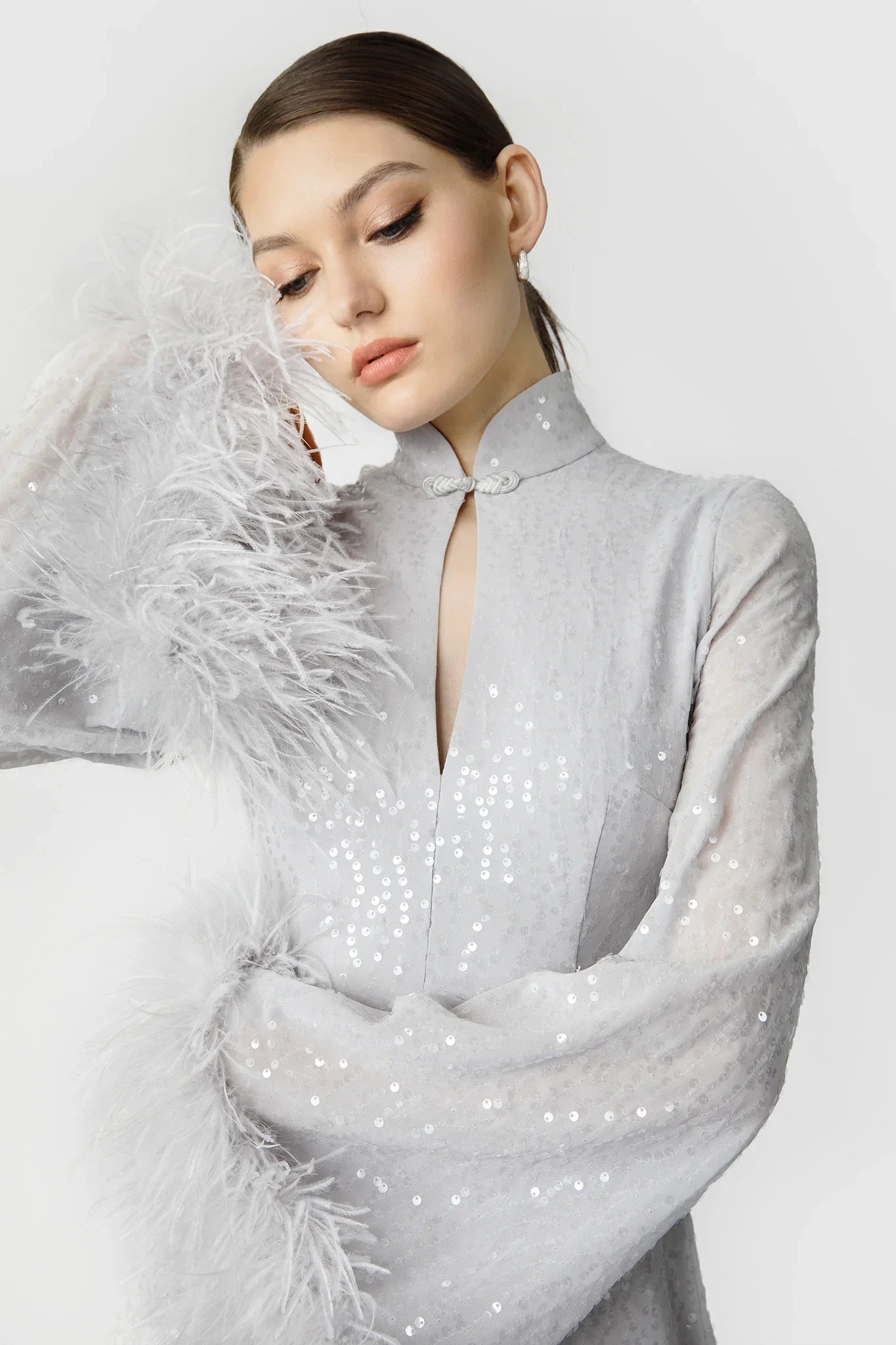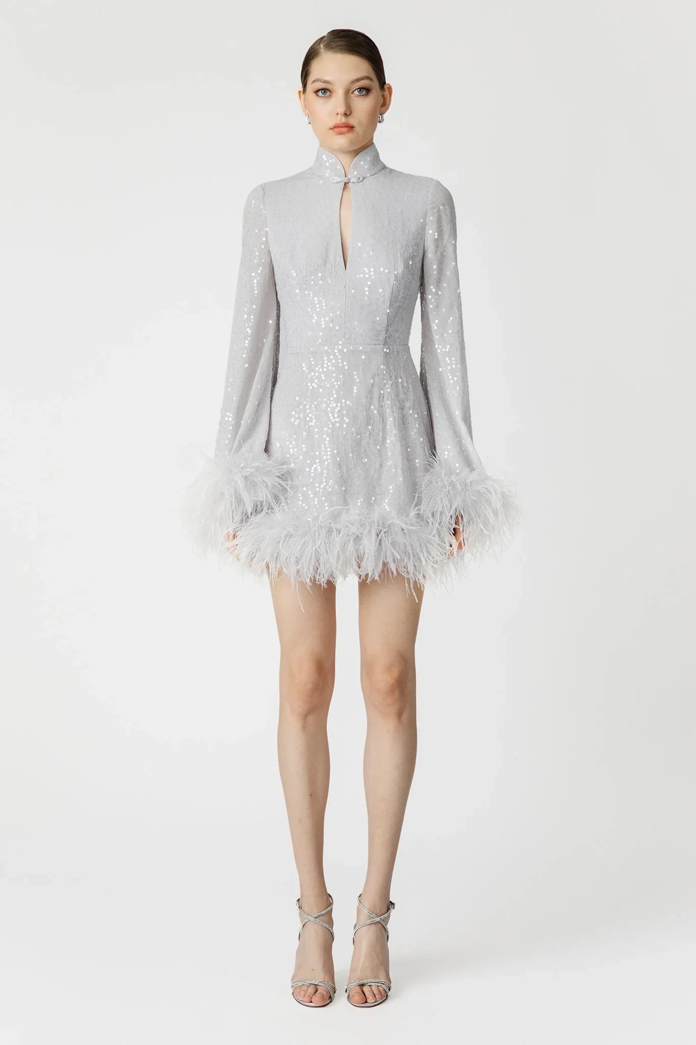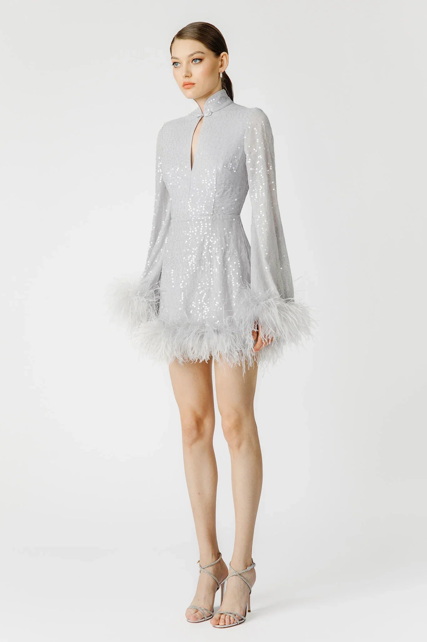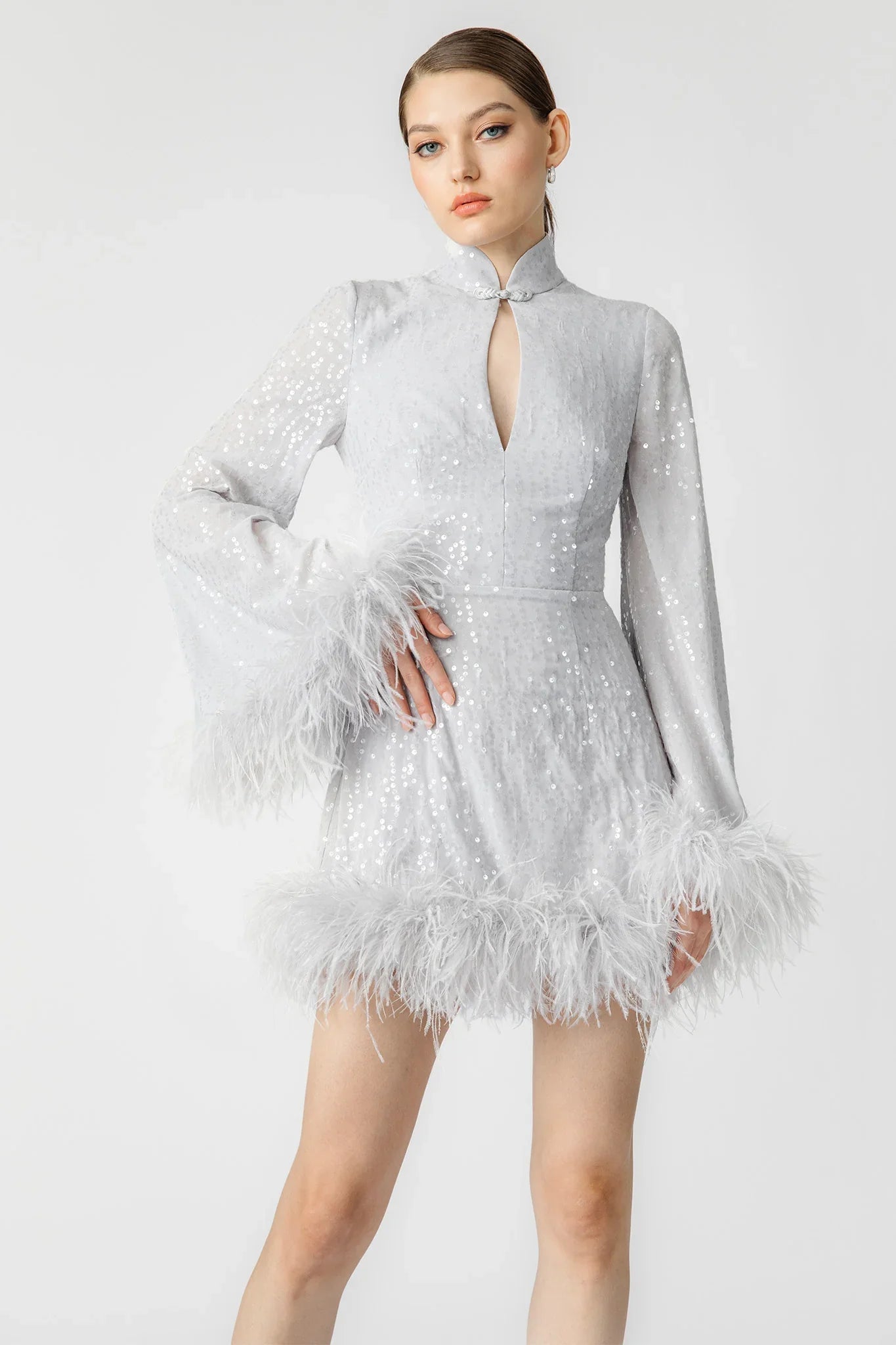 Bianca is a a scintillating party dress that sparkles in sequined chiffon trimmed with ostrich feathers. Featuring extra-wide bell sleeves and a Mandarin collar with a keyhole cut-out, feel radiant in this lustrous mini dress as you glimmer through each motion.