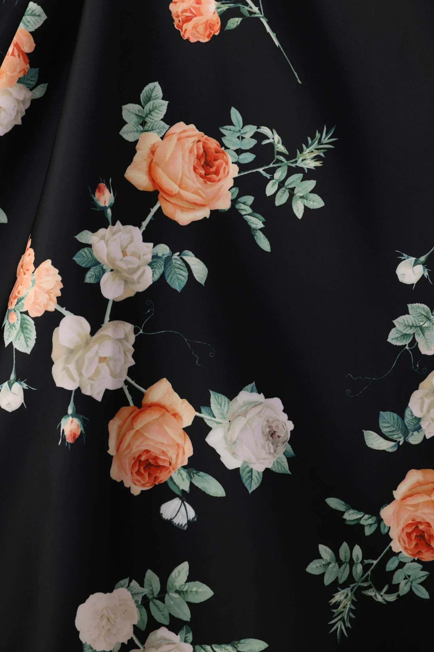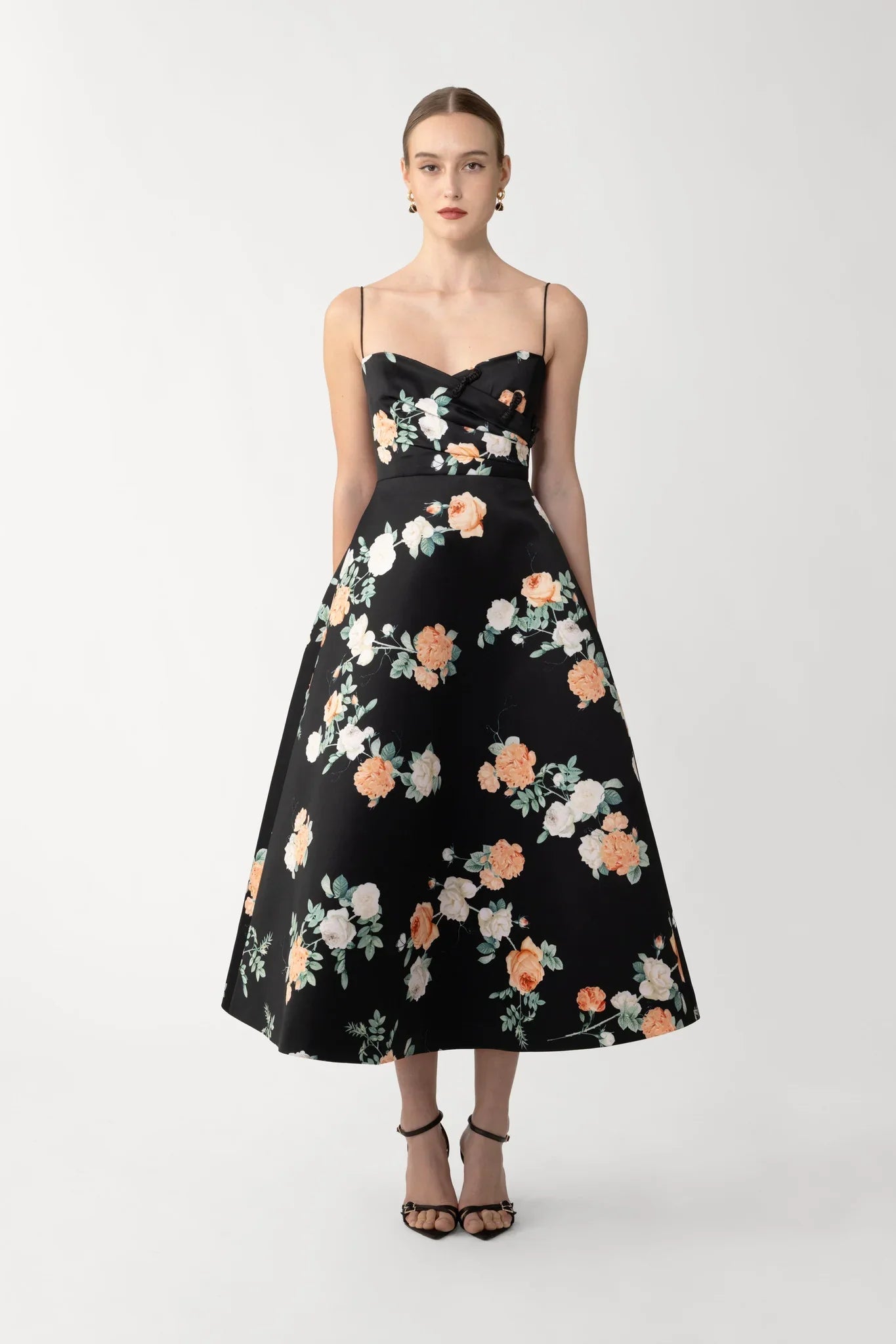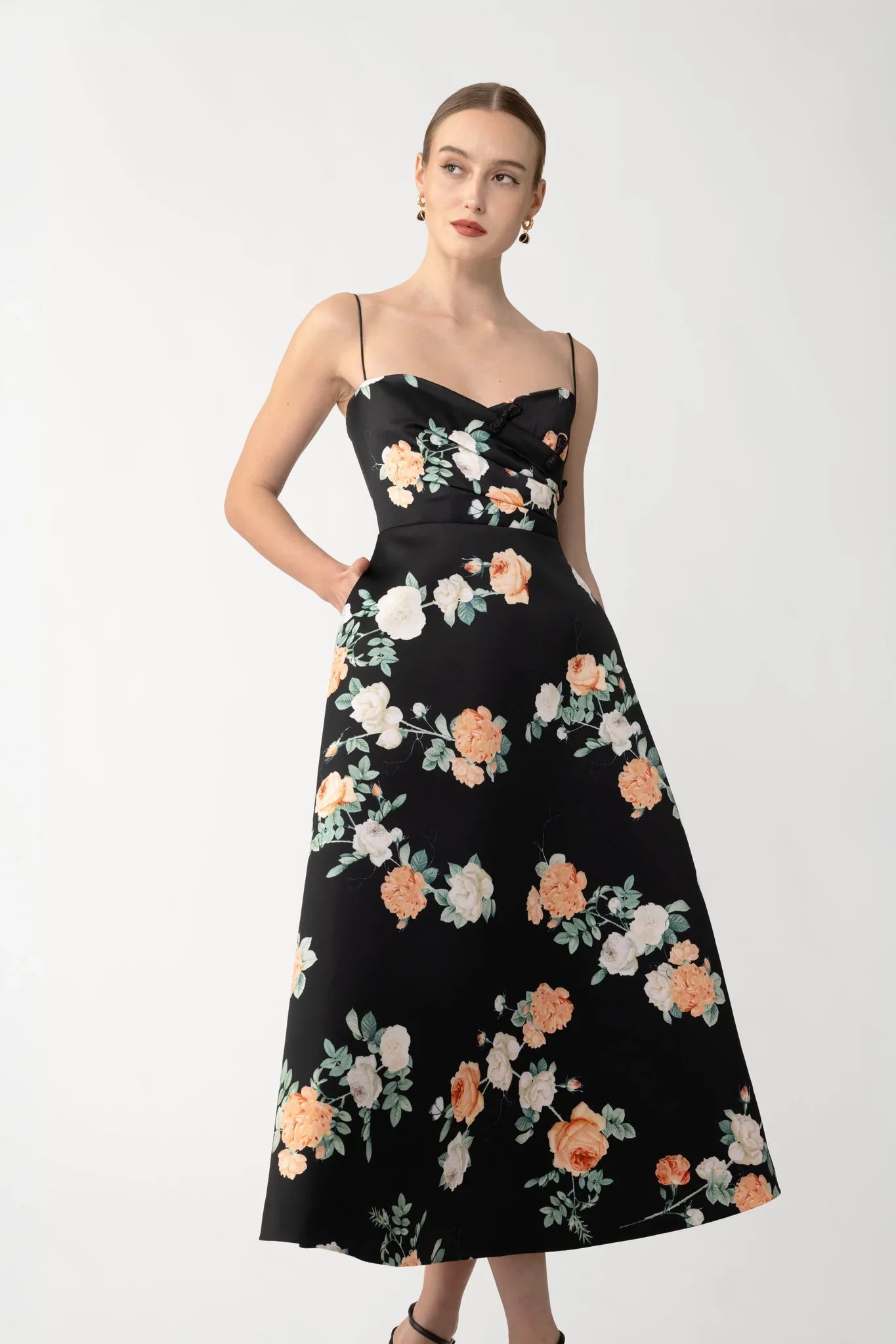 The Bo Dress is cut from luxurious satin with a sweetheart neckline, thin rope straps, and features hand-tied pipa knots over the bodice. The A-line skirt falls to mid-calf and is finished in our original peach and ivory rose print.