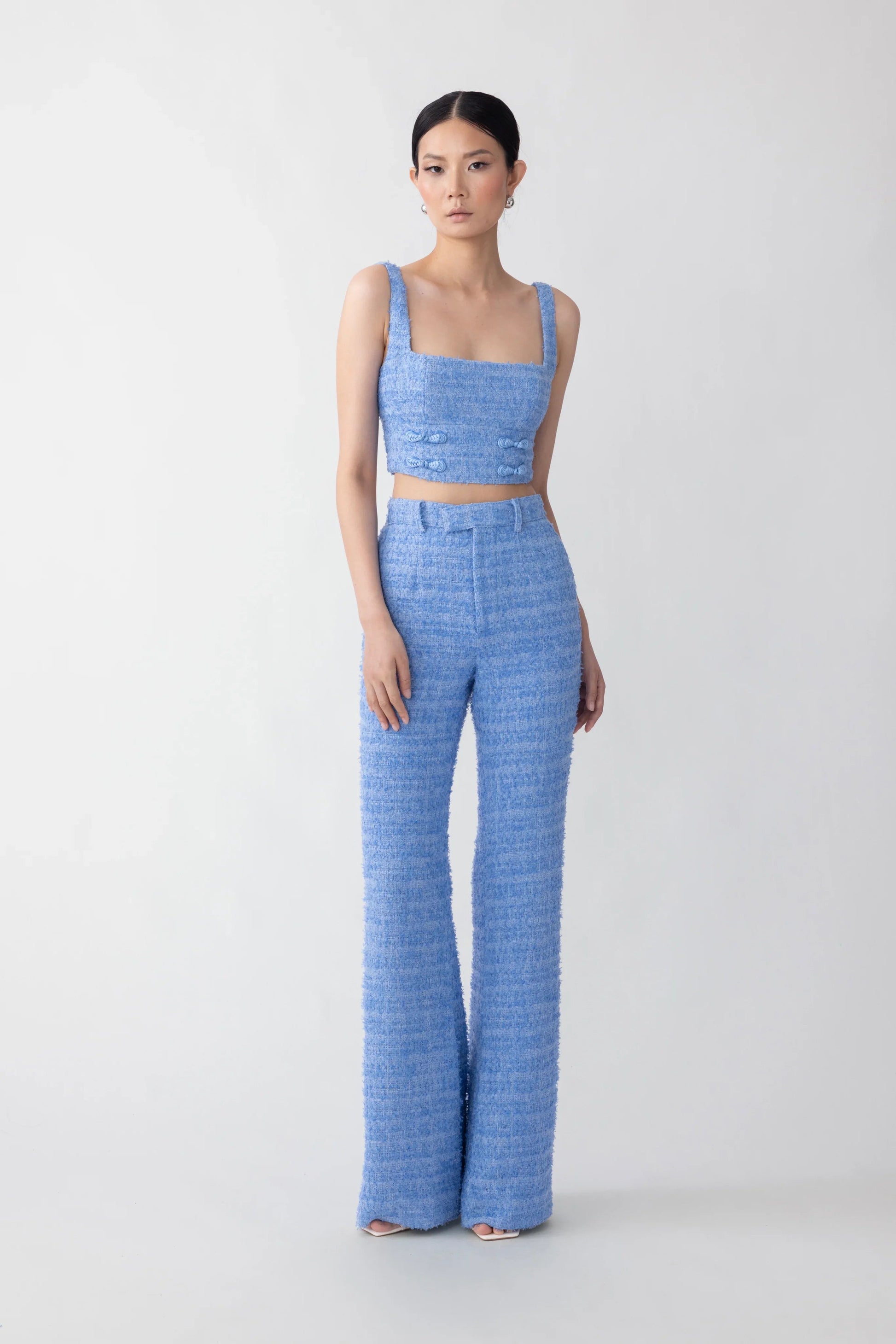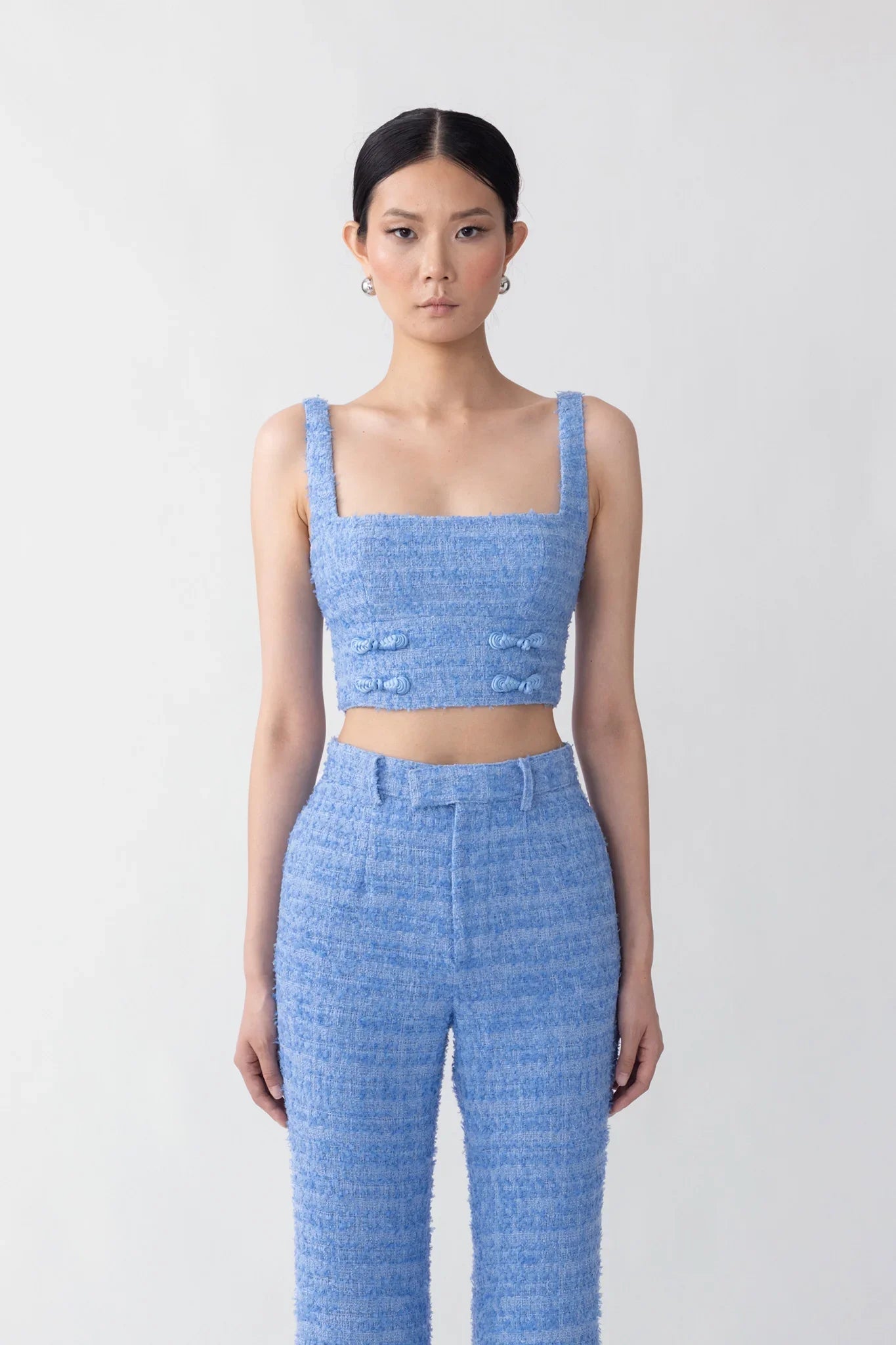 Tweed top with a square neckline featuring our signature hand-tied pipa knot detail