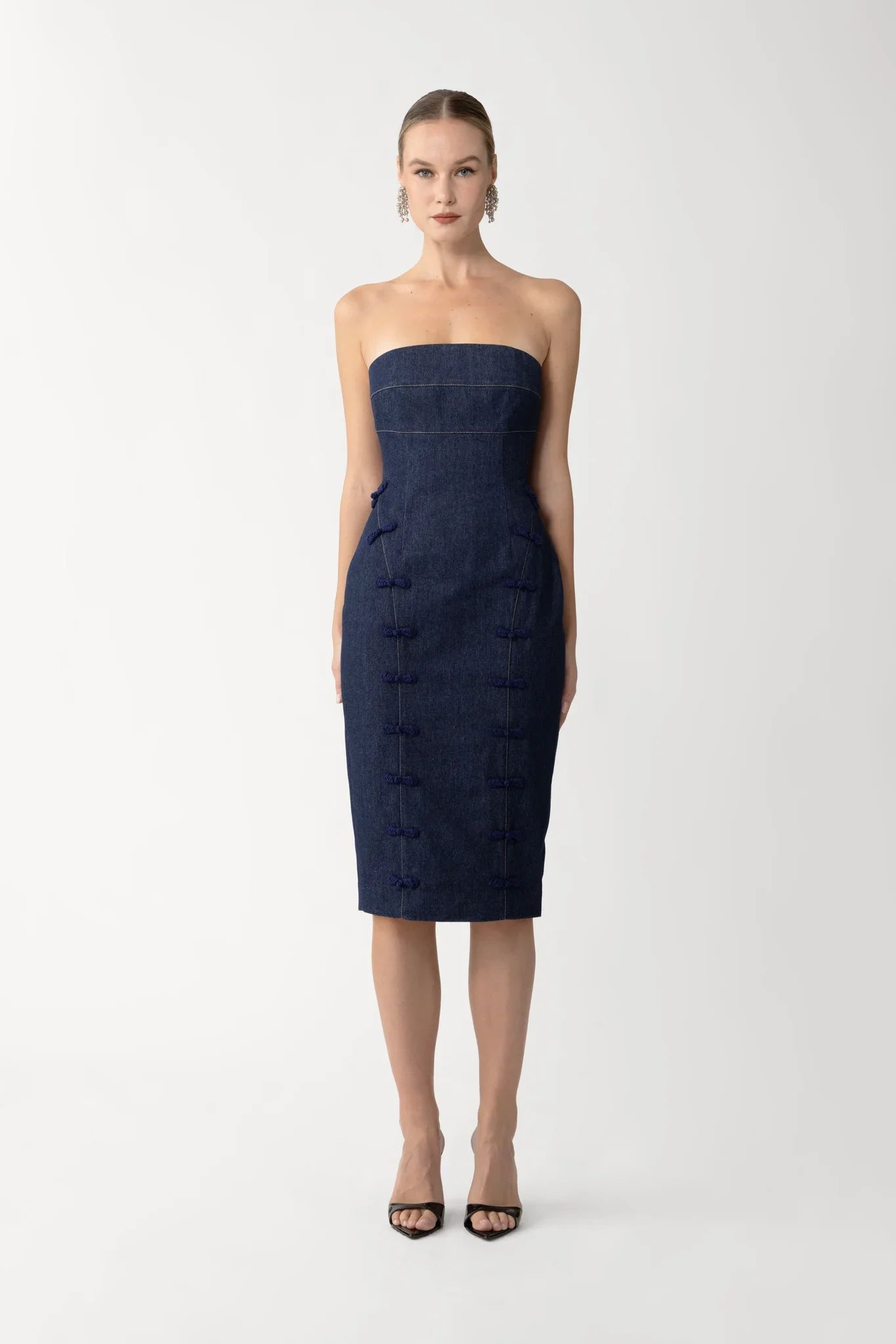 The Brooklyn Dress is a strapless, fitted denim midi style with a fully boned corset bodice. Featuring hand-tied pipa knots that trace the front from the waist down, it’s a signature silhouette with sculpted support.