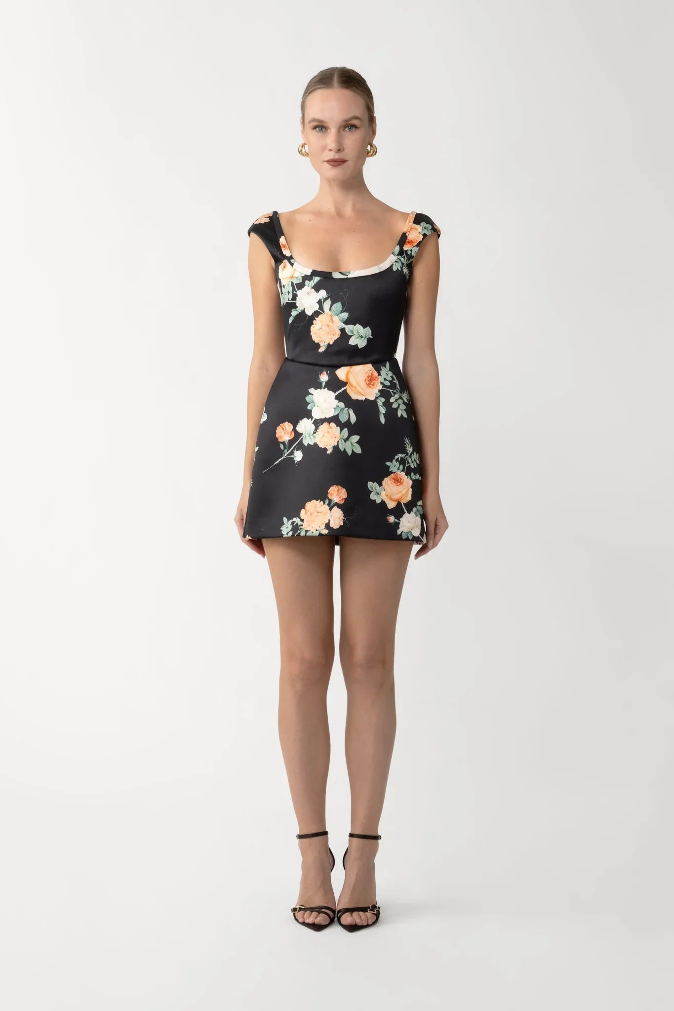 A playful mini dress in luxurious satin, the Bryn Dress features a fully boned bodice and an A-line skirt. Printed in an original peach and ivory rose motif for a romantic touch.