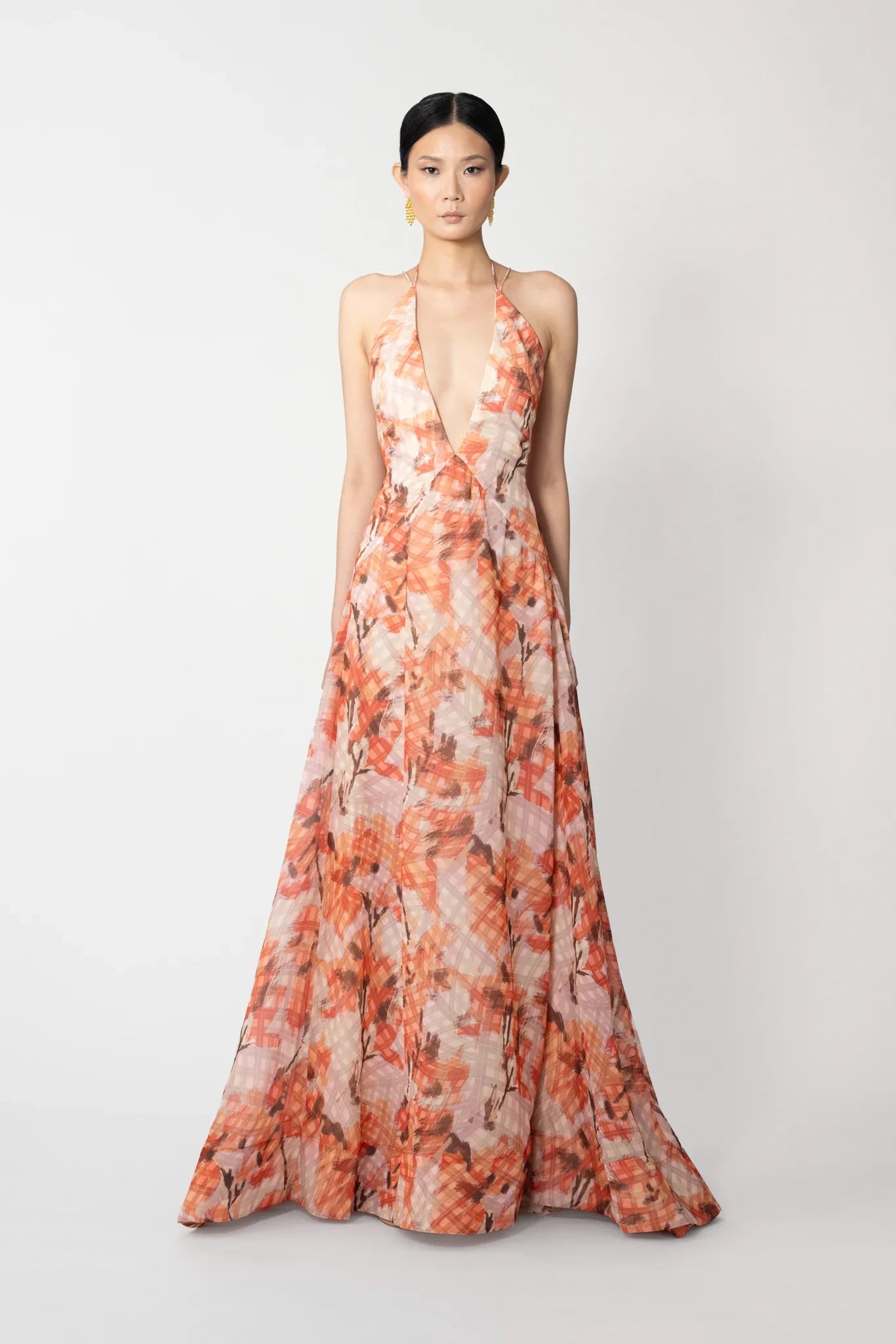 Backless maxi dress with plunging neckline with full skirt in original printed chiffon