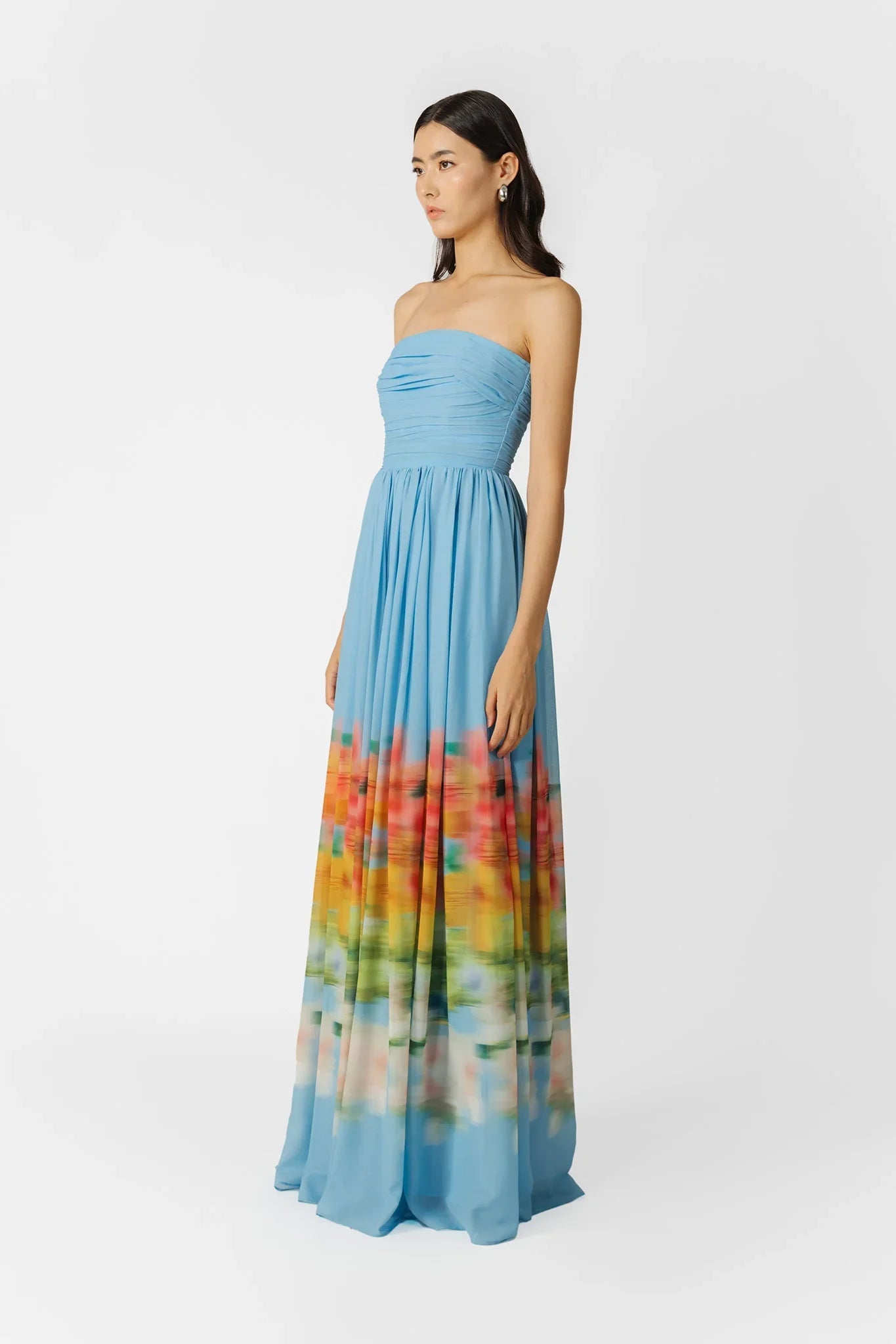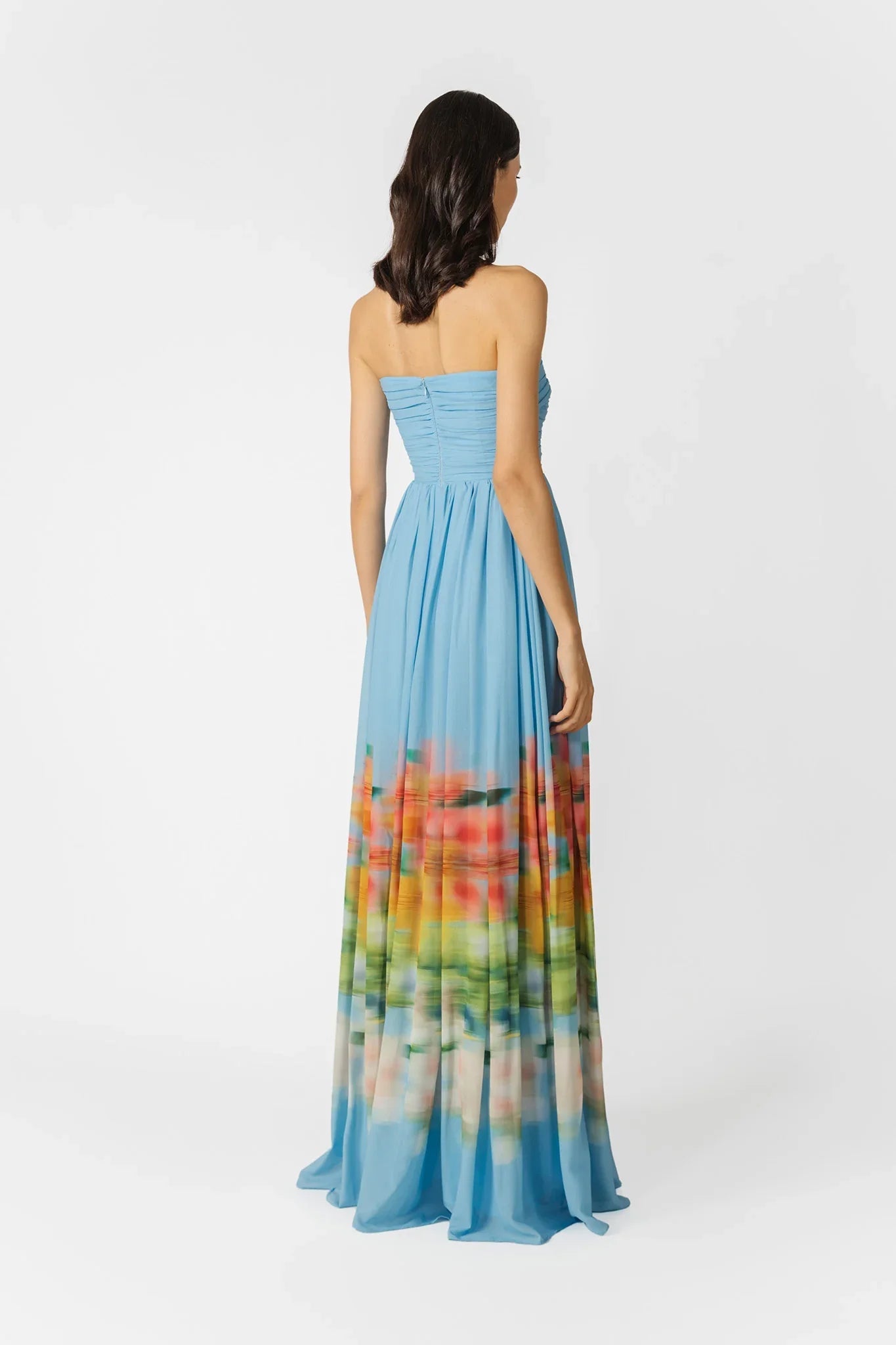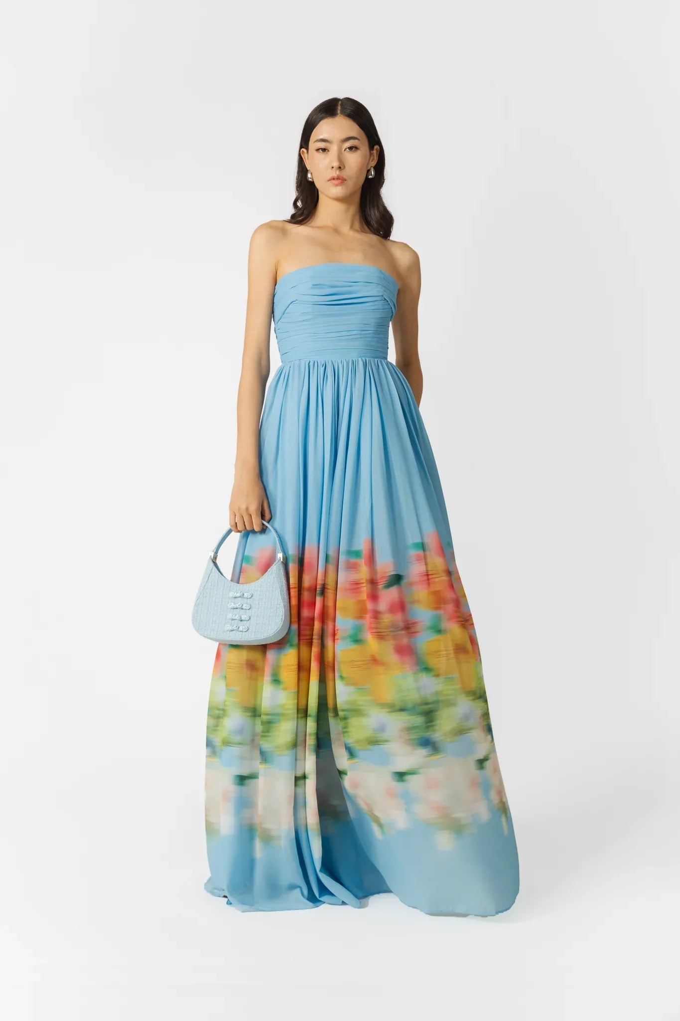 The Camille Dress is a strapless chiffon maxi featuring a pleated bodice and a beautiful original print. Designed for a tailored hem length, it moves effortlessly with you — perfect for outdoor occasions.