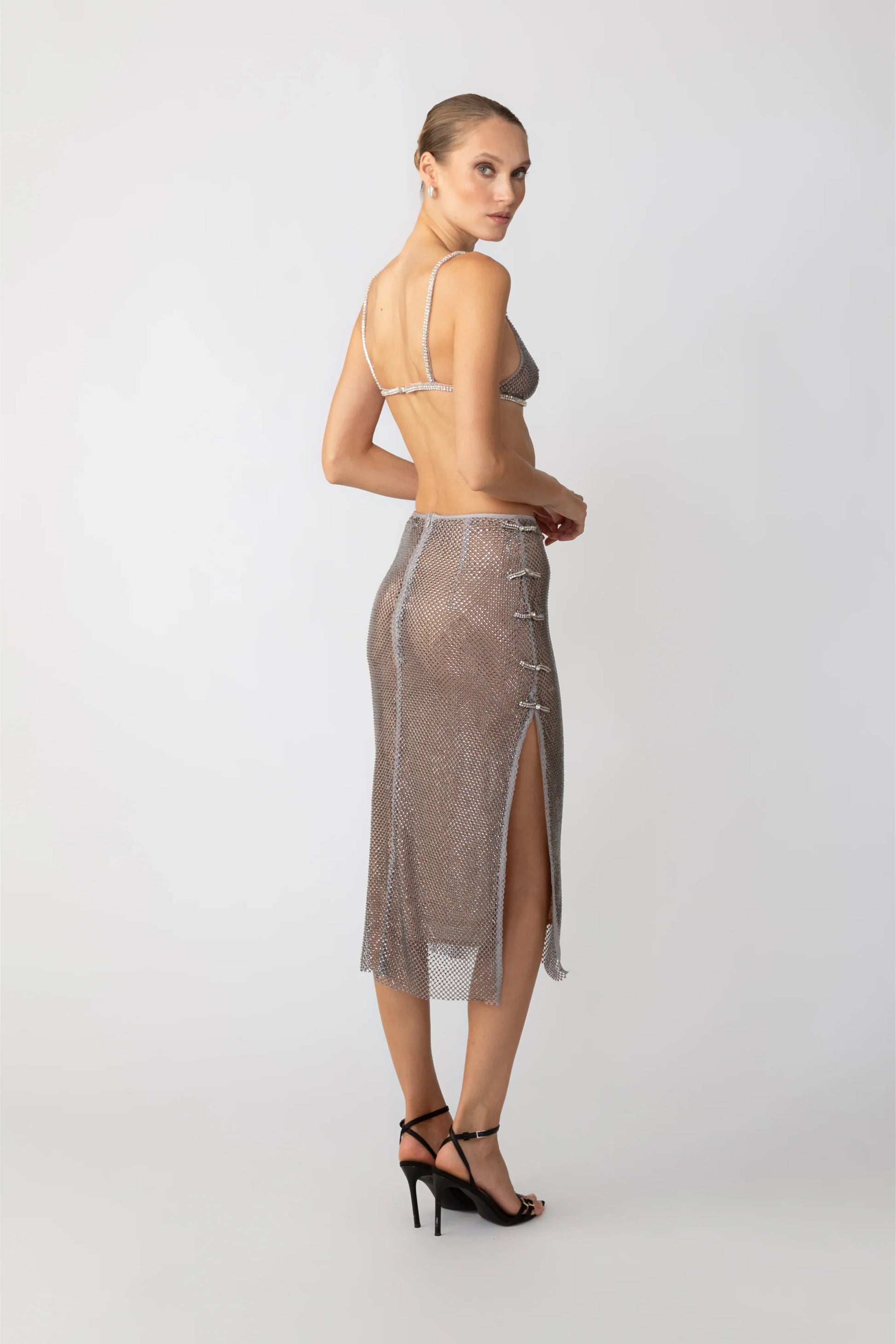 Crystal embellished midi skirt featuring crystal pipa knot detail at the slits on the sides
