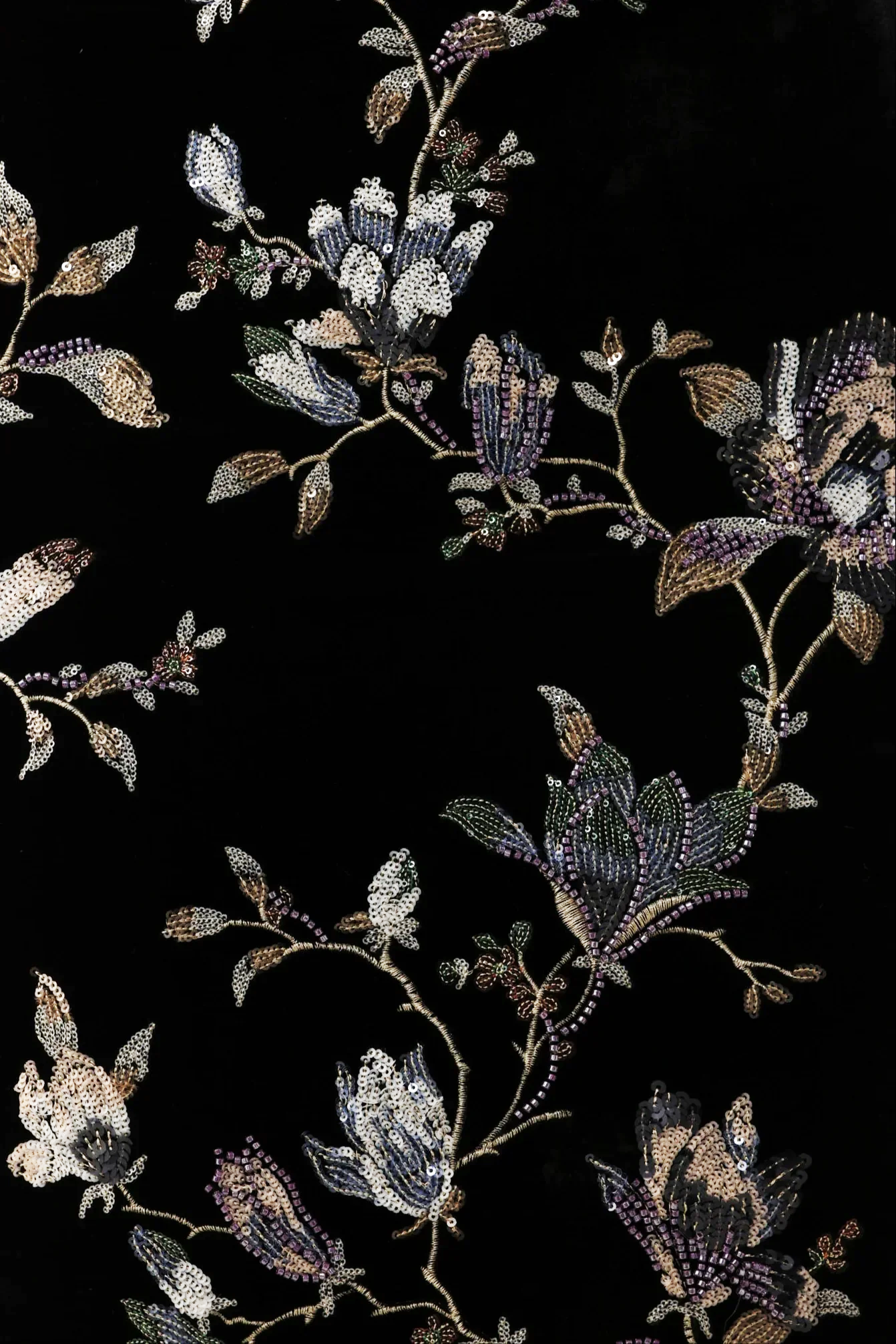The Devon Velvet Dress is a cheongsam-inspired silhouette crafted from silk velvet adorned with tonal embroidered florals.