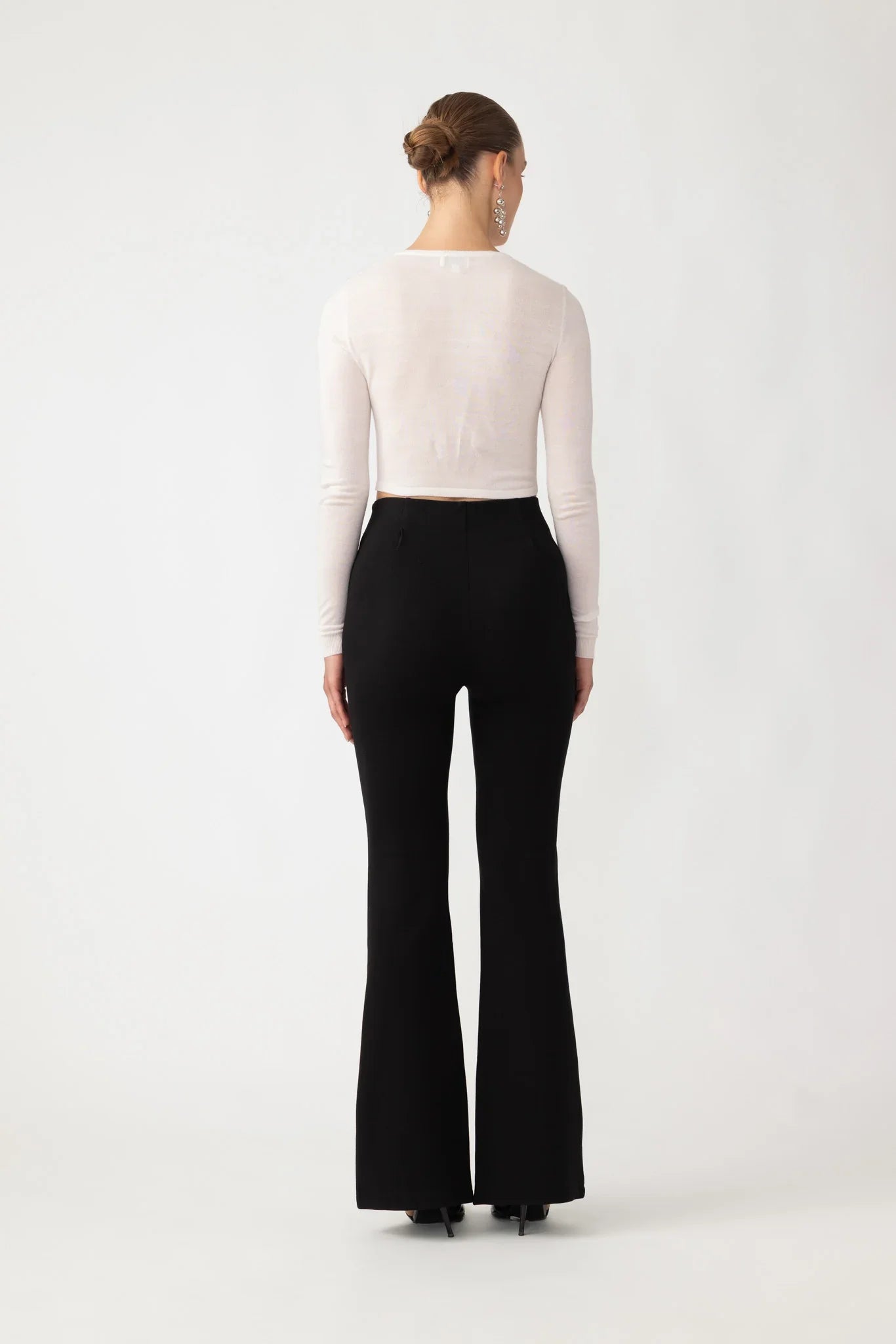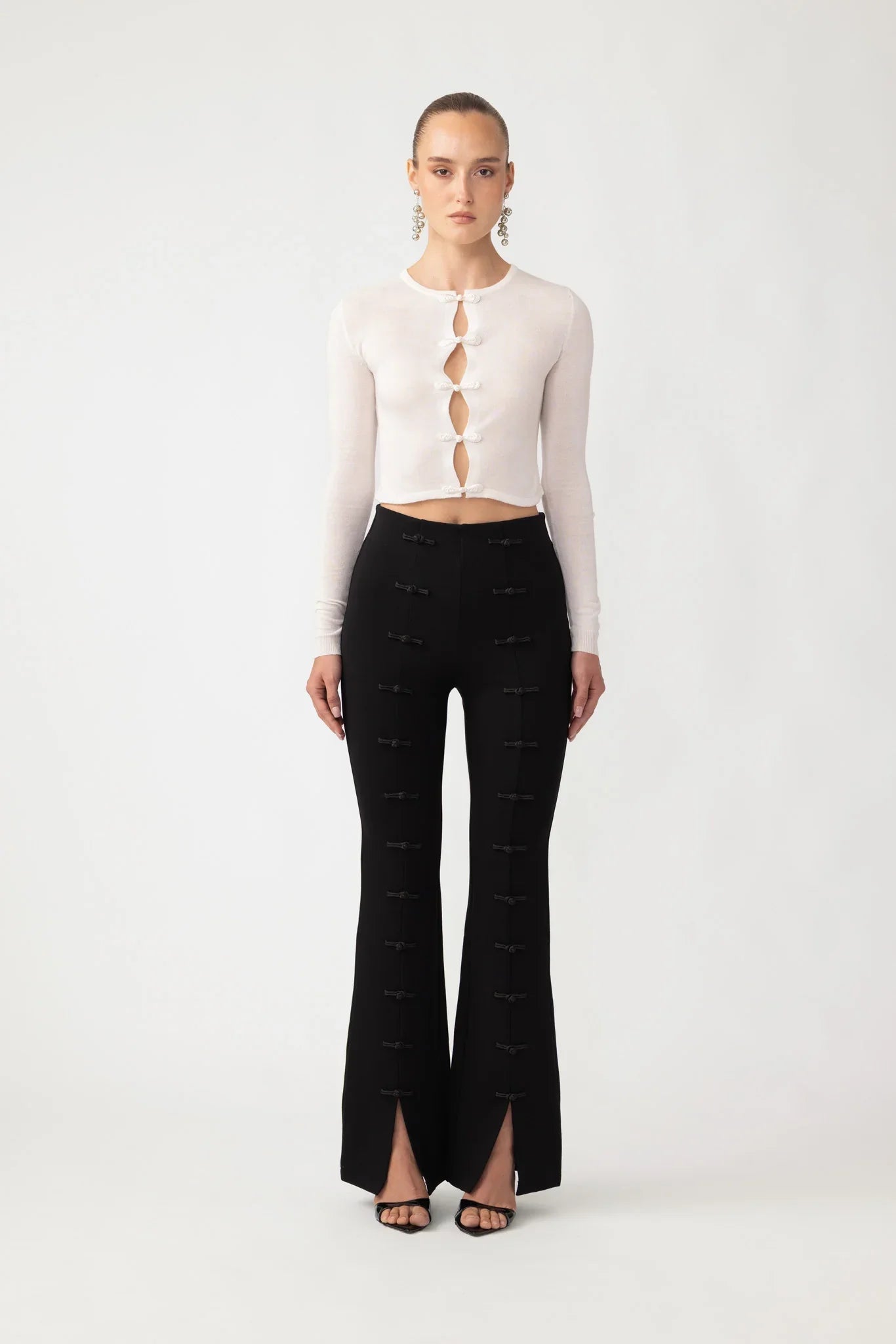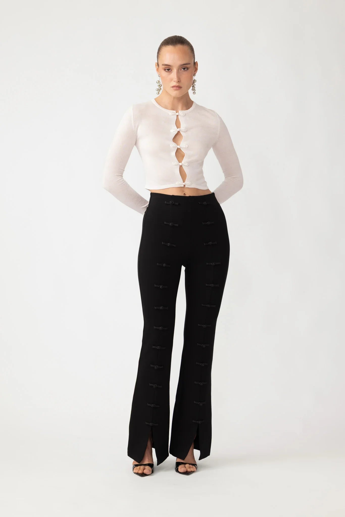 The Drew Pant is a mid-rise, flared-leg pant featuring signature hand-tied pipa knots that trace the front seam of each leg and lead to a bottom open slit. A modern twist on a vintage silhouette, perfect for styling into a versatile everyday look or casual occasion.