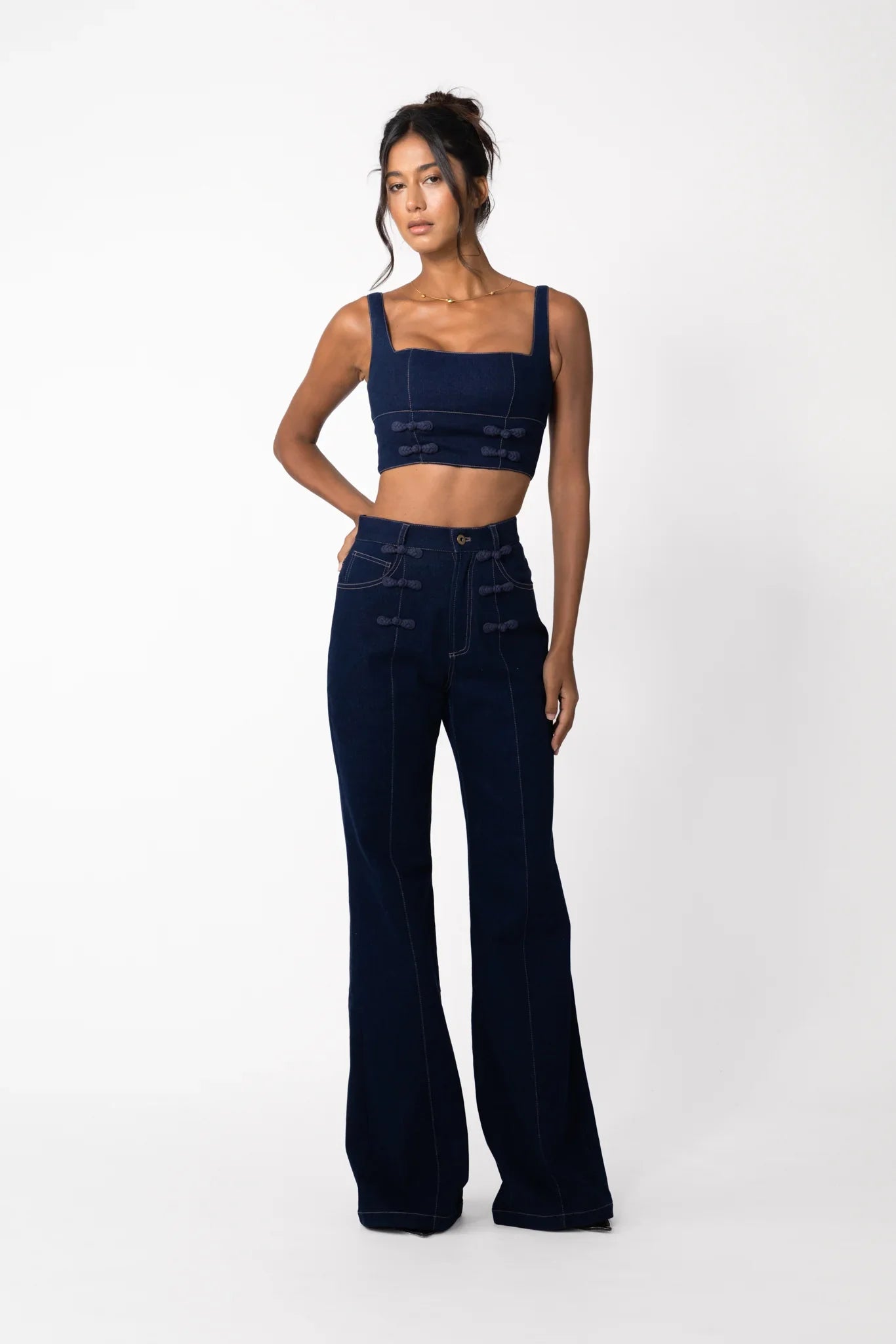 Tailored high-waisted, wide-leg denim pant with slight stretch featuring signature pipa knot detail