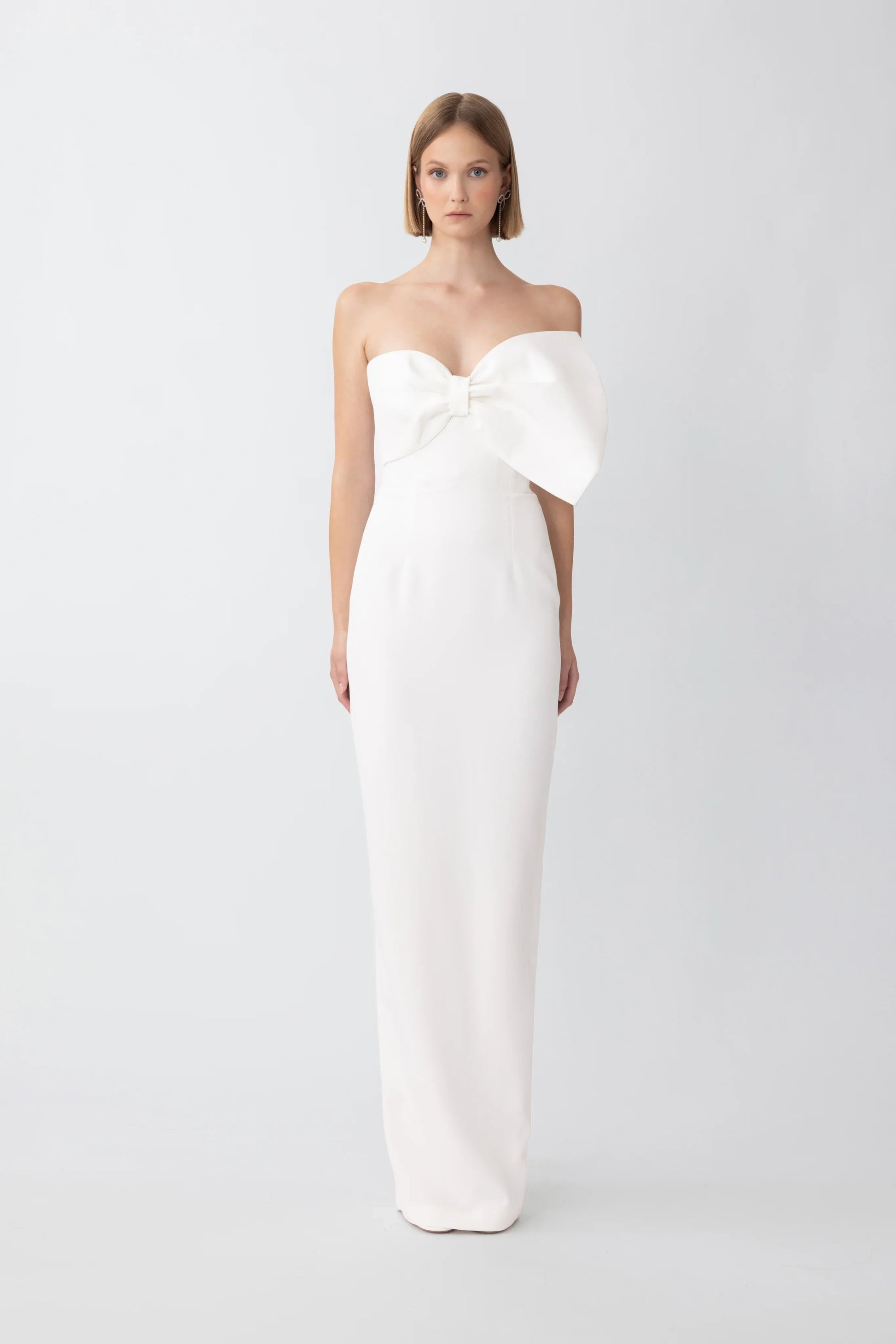 Strapless crepe fitted gown featuring an asymmetrical bow design