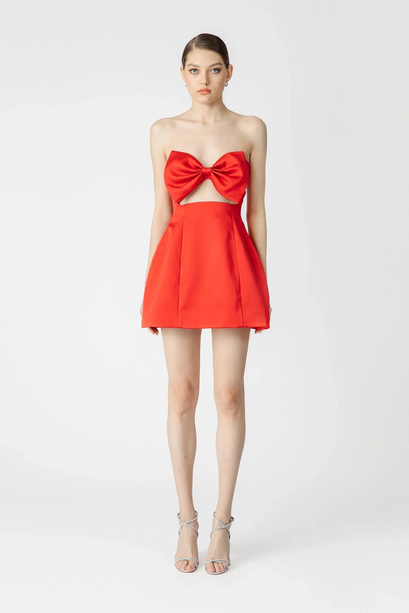 Estelle is a captivating satin mini dress crafted with a strapless bodice, voluminous bow above the chestpiece, teasing peekaboo element below, and flared silhouette. Wherever music and fun await, Estelle's spirited charm inspires dancing through evenings with buoyant ease.
