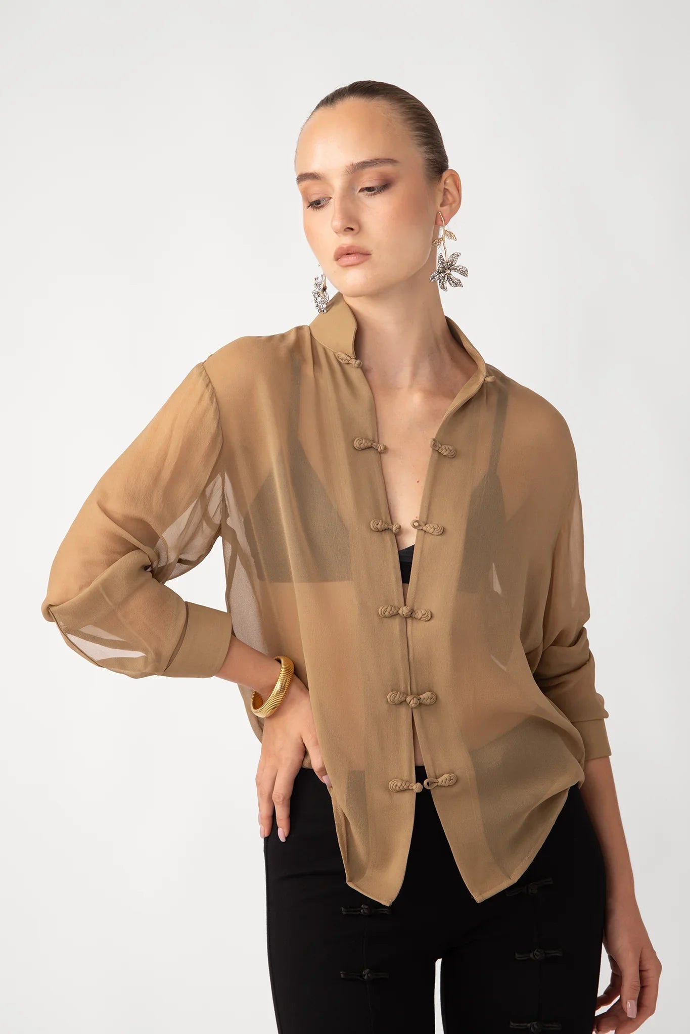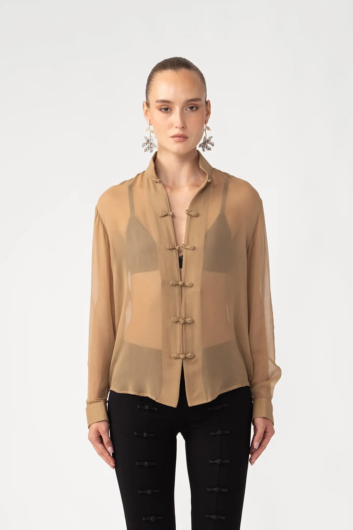 The Fallon Shirt is crafted from lightweight silk chiffon, featuring a mandarin collar and hand-tied pipa knots along the front. Finished with a sheer texture, it offers an elegant layer—a refined twist on the everyday shirt.