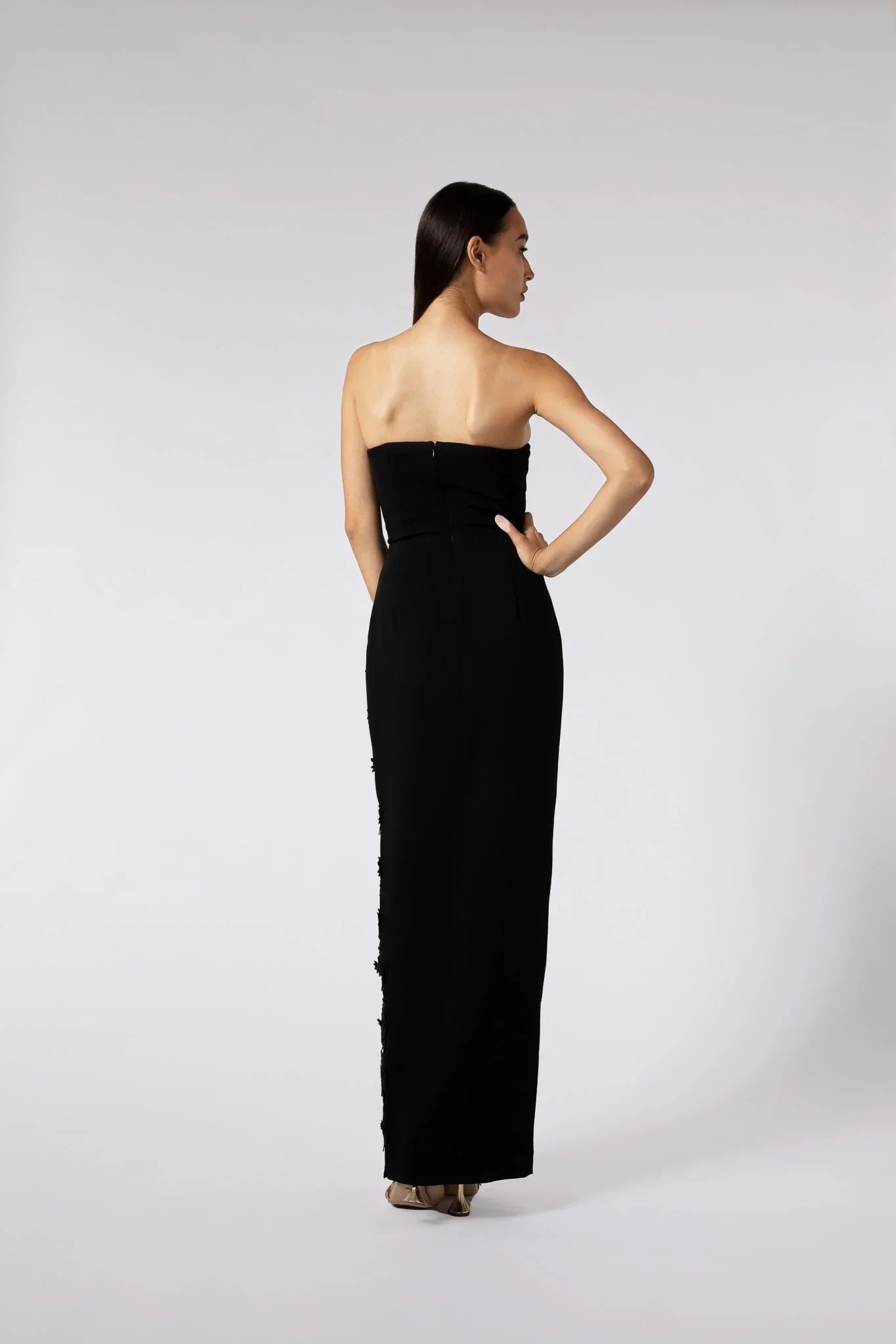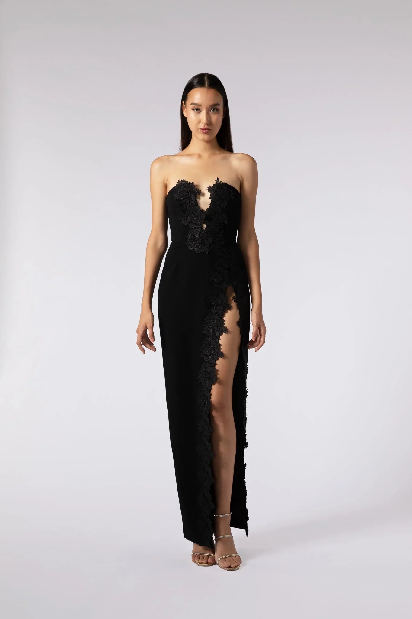Florence is a romantic gown that combines elegance and sensuality. A strapless wired bodice lined with floral lace applique at the front, featuring a plunging V neckline with sheer mesh panel and a thigh-high slit.