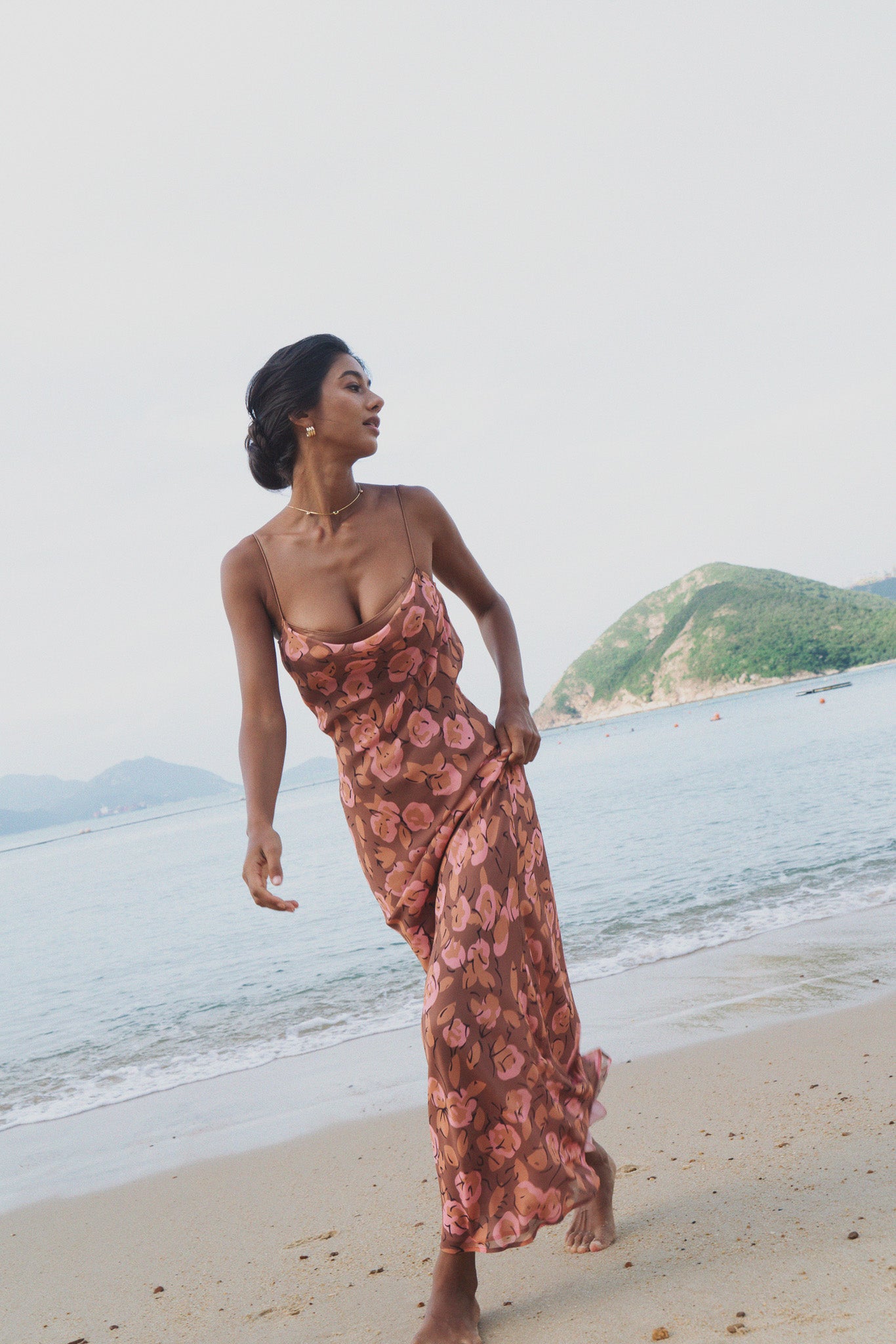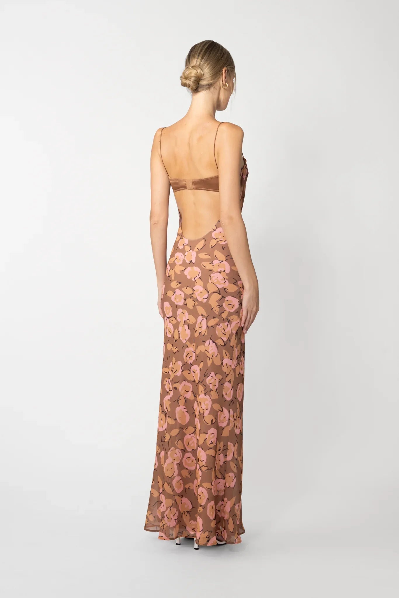 Chiffon printed slip dress in bias-cut fit with attached contrast color satin bralette