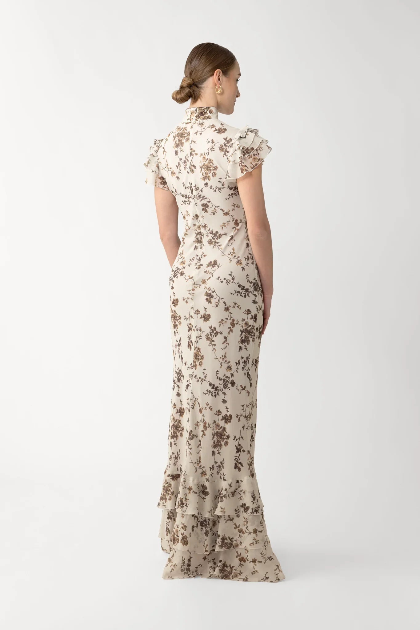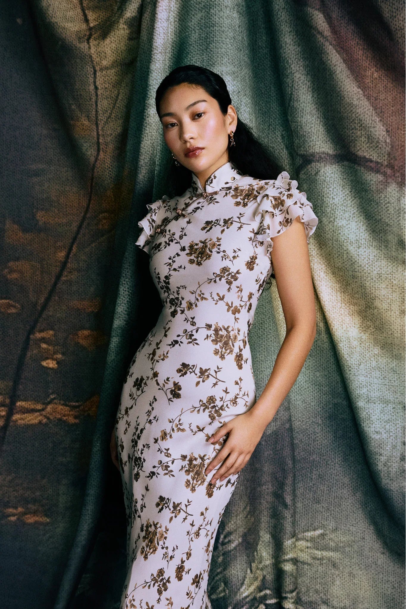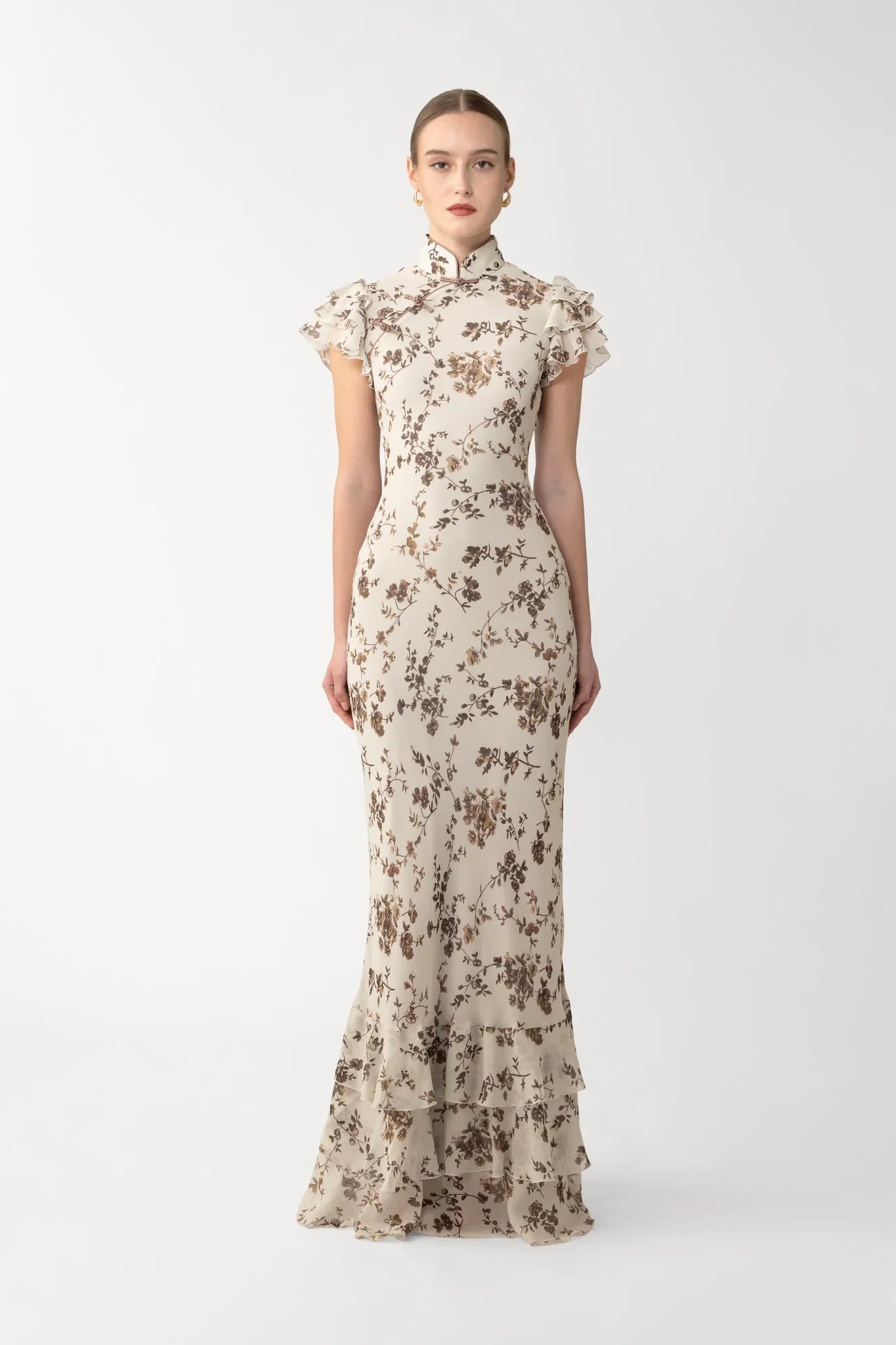 The Gemma Dress is cut from flowing chiffon in a vintage cream floral print. A subtle nod to the cheongsam featuring a mandarin collar, contrast piping, and hand-tied pipa knots.