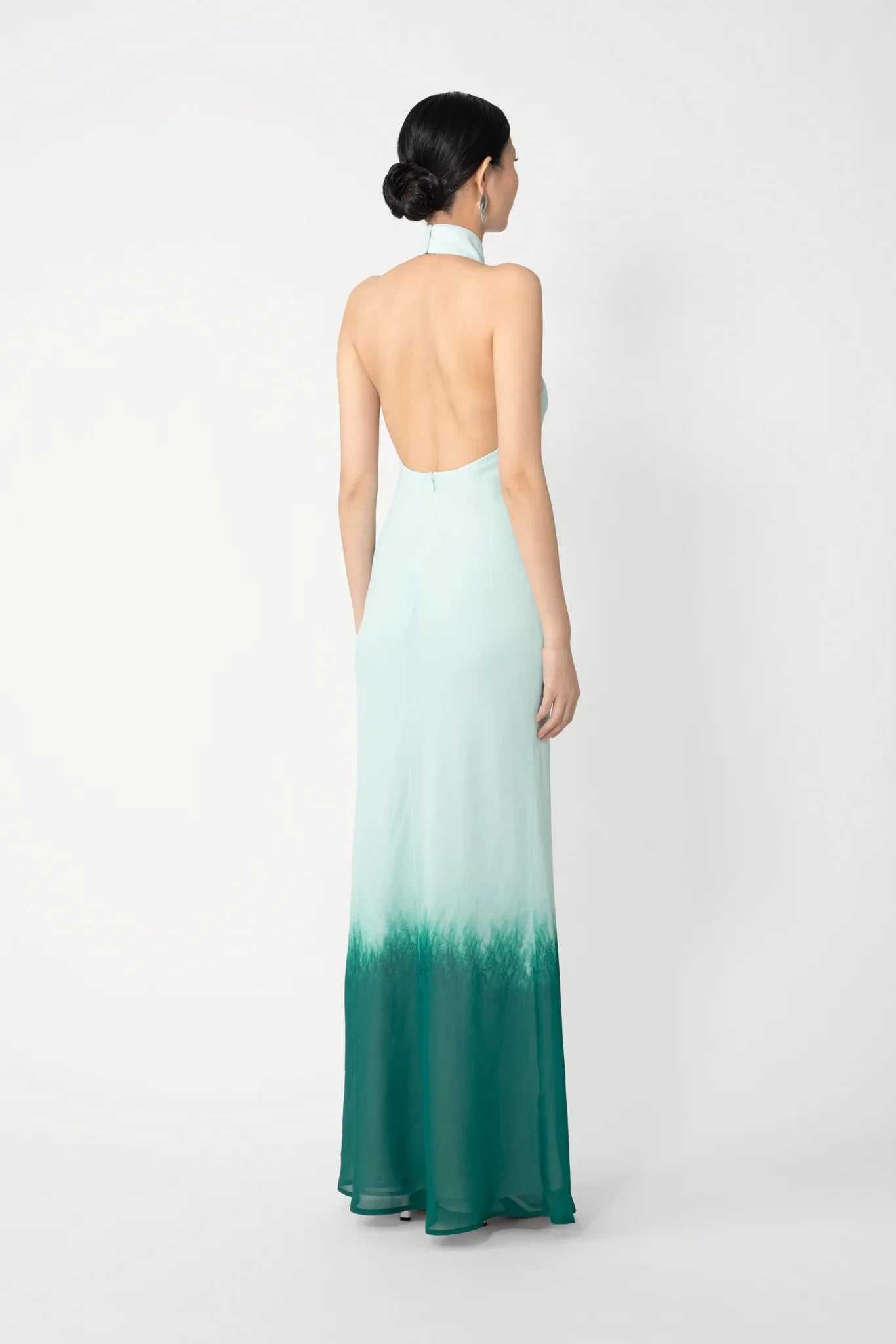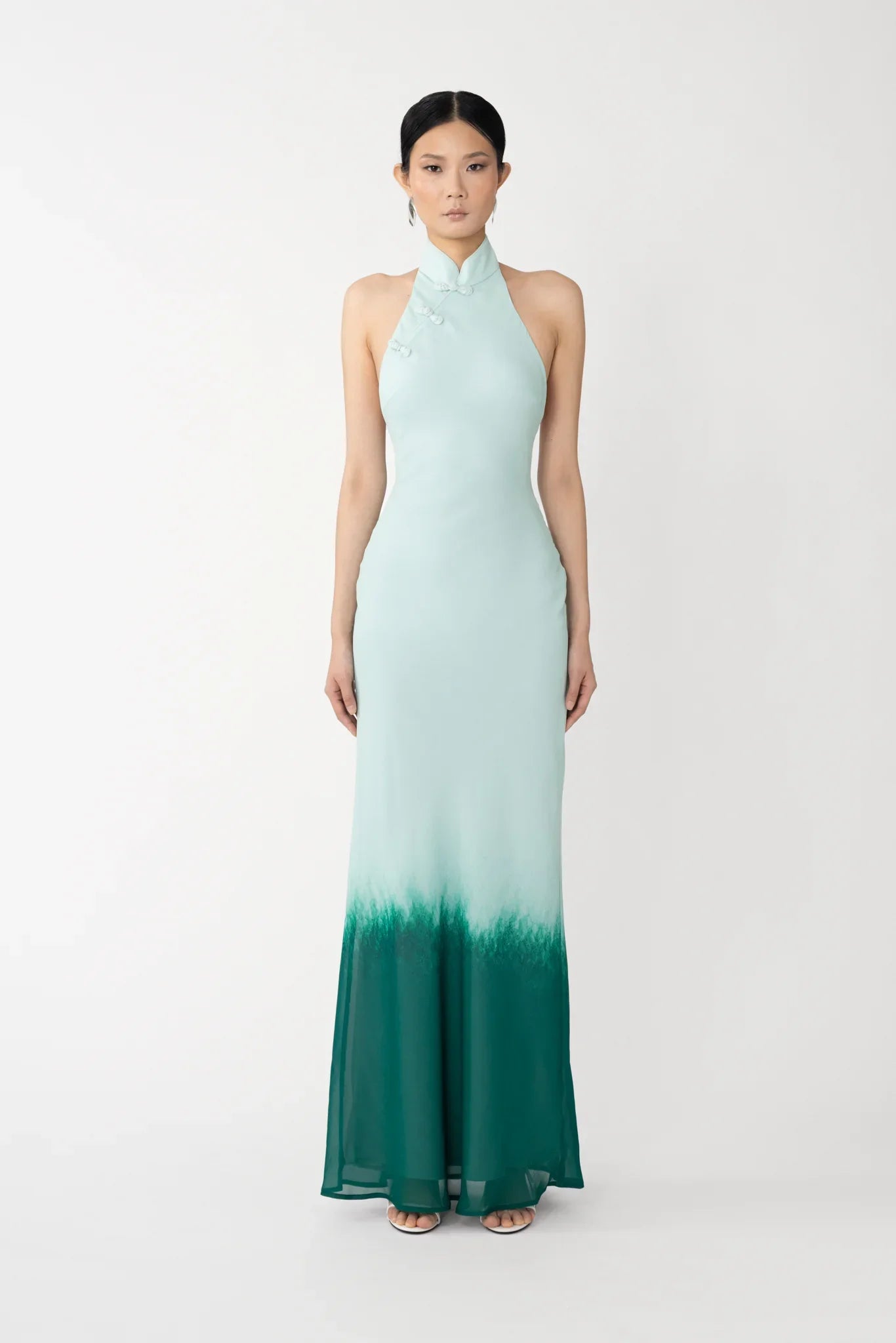 Chiffon maxi dress in bias-cut fit with high neckline featuring signature mandarin collar and pipa knot detail
