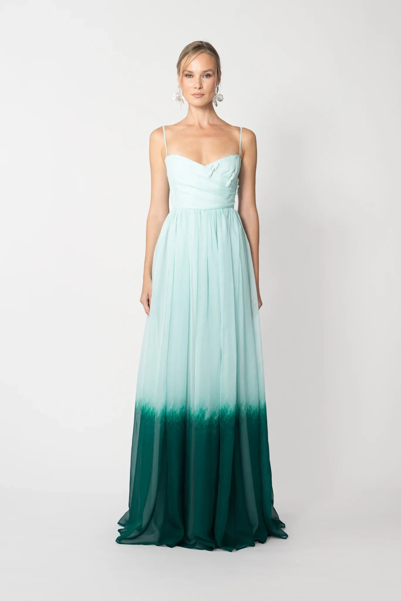 Chiffon maxi dress with pleated sweetheart neckline, fully-boned bodice, and signature hand-tied pipa knot detail
