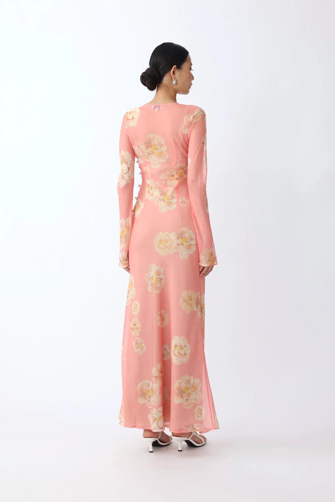 Chiffon maxi dress with long sleeves over a removable slip featuring our signature rose print pattern