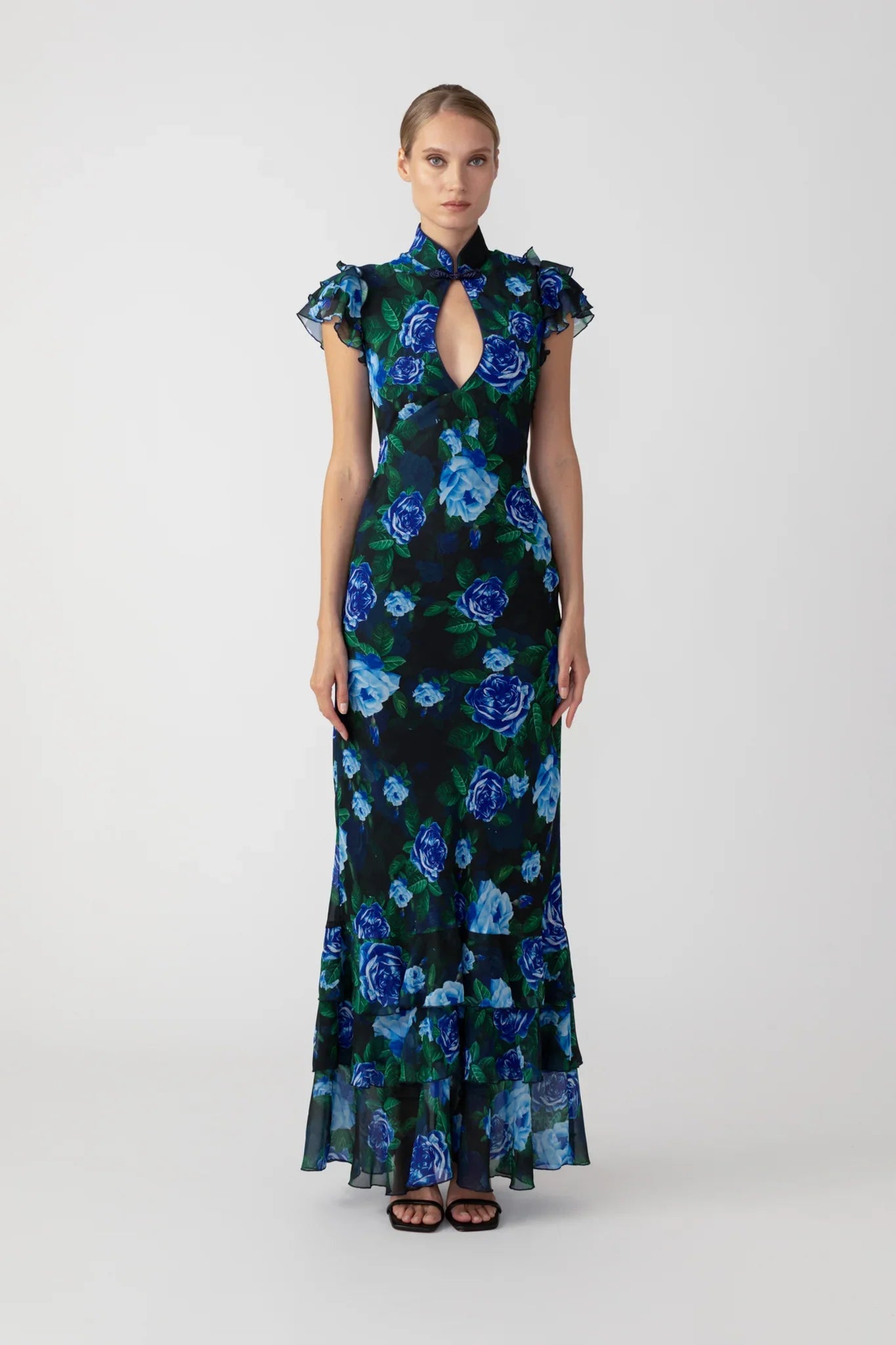 Gracie is a bias-cut chiffon maxi dress featuring an original blooming floral layered print with a tiered ruffled hem. Fabricated with our classic Mandarin collar, pipa knot, and ruffled capped sleeve details as well as a new playful keyhole front cut-out.