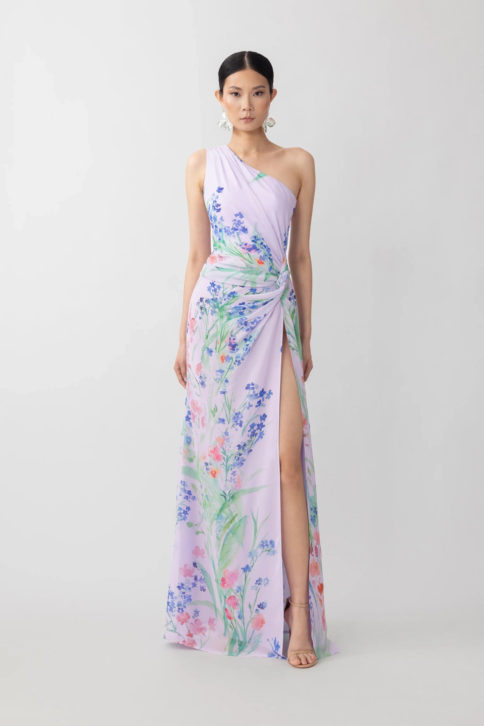 One-shoulder chiffon maxi dress with a thigh-high slit featuring a knot detail at the front