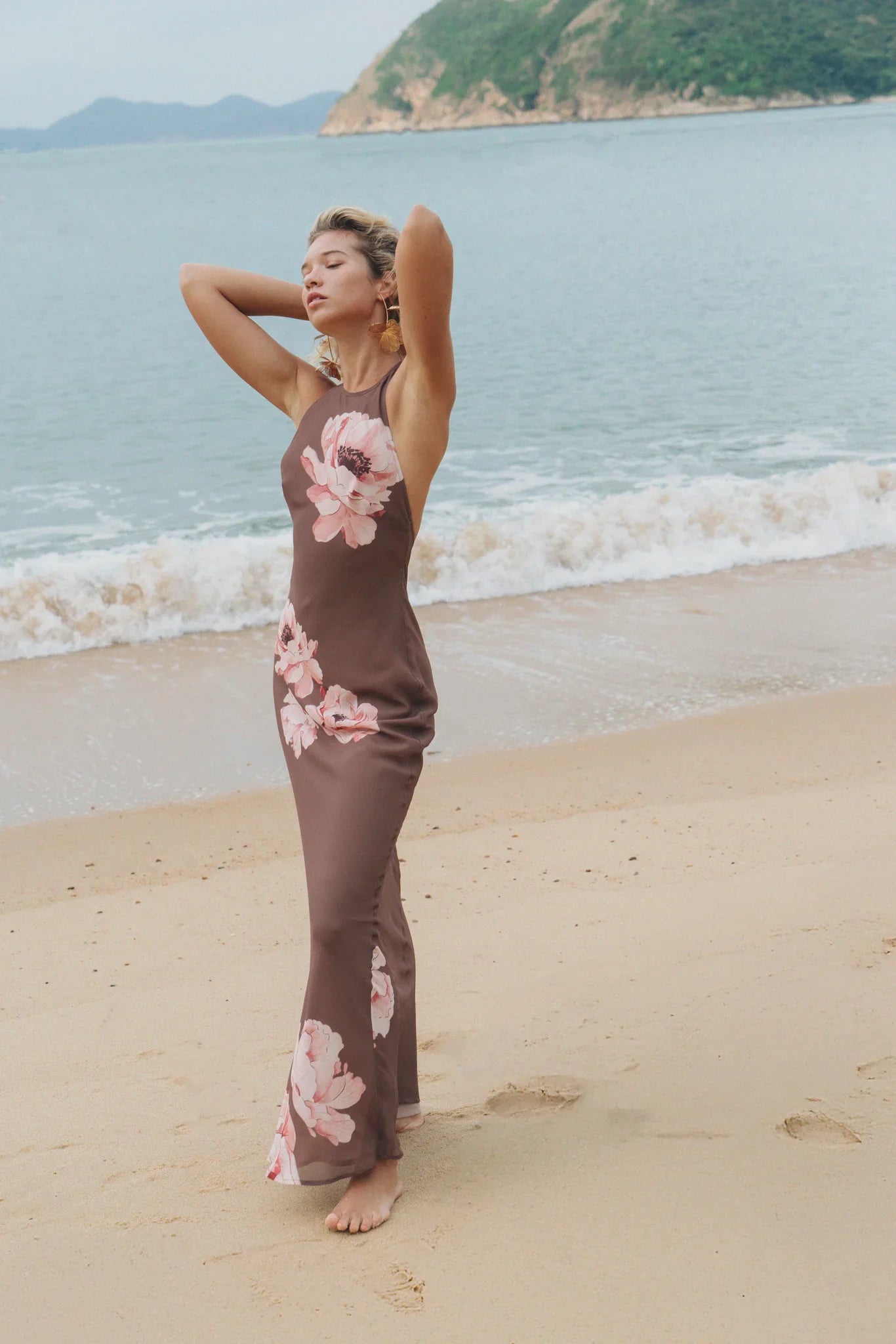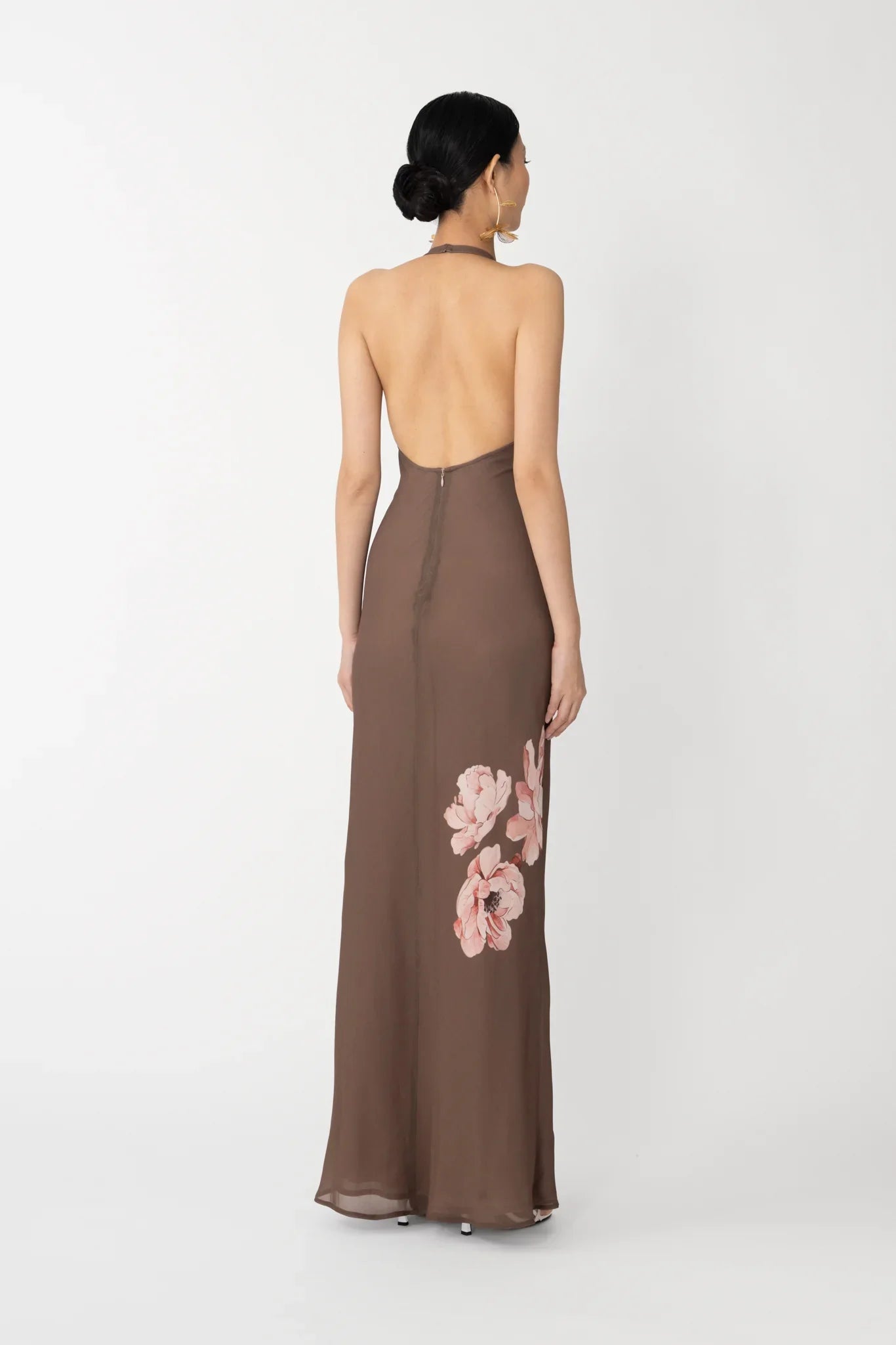 Chiffon printed maxi dress in bias-cut fit with high neckline featuring hand-painted peonies