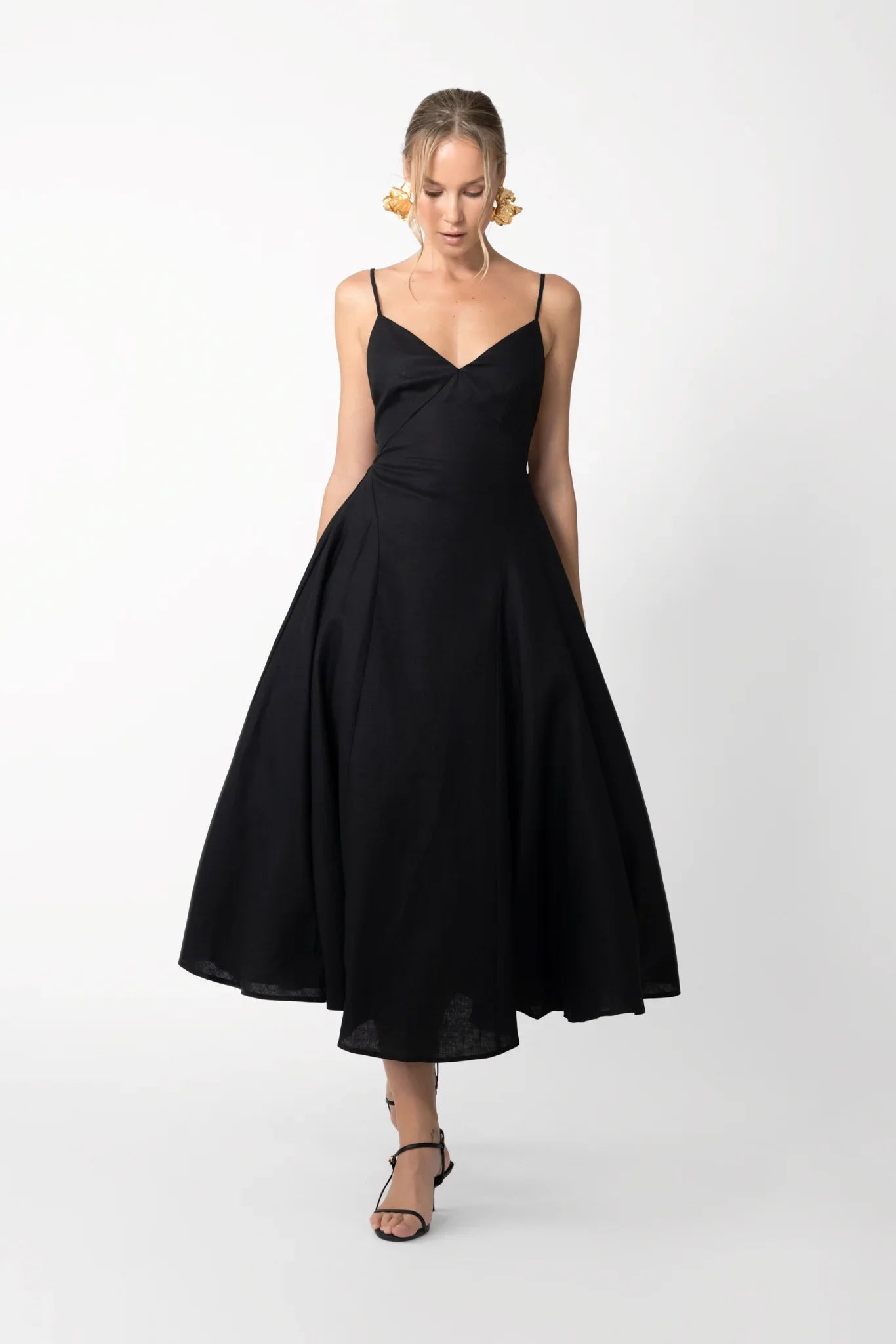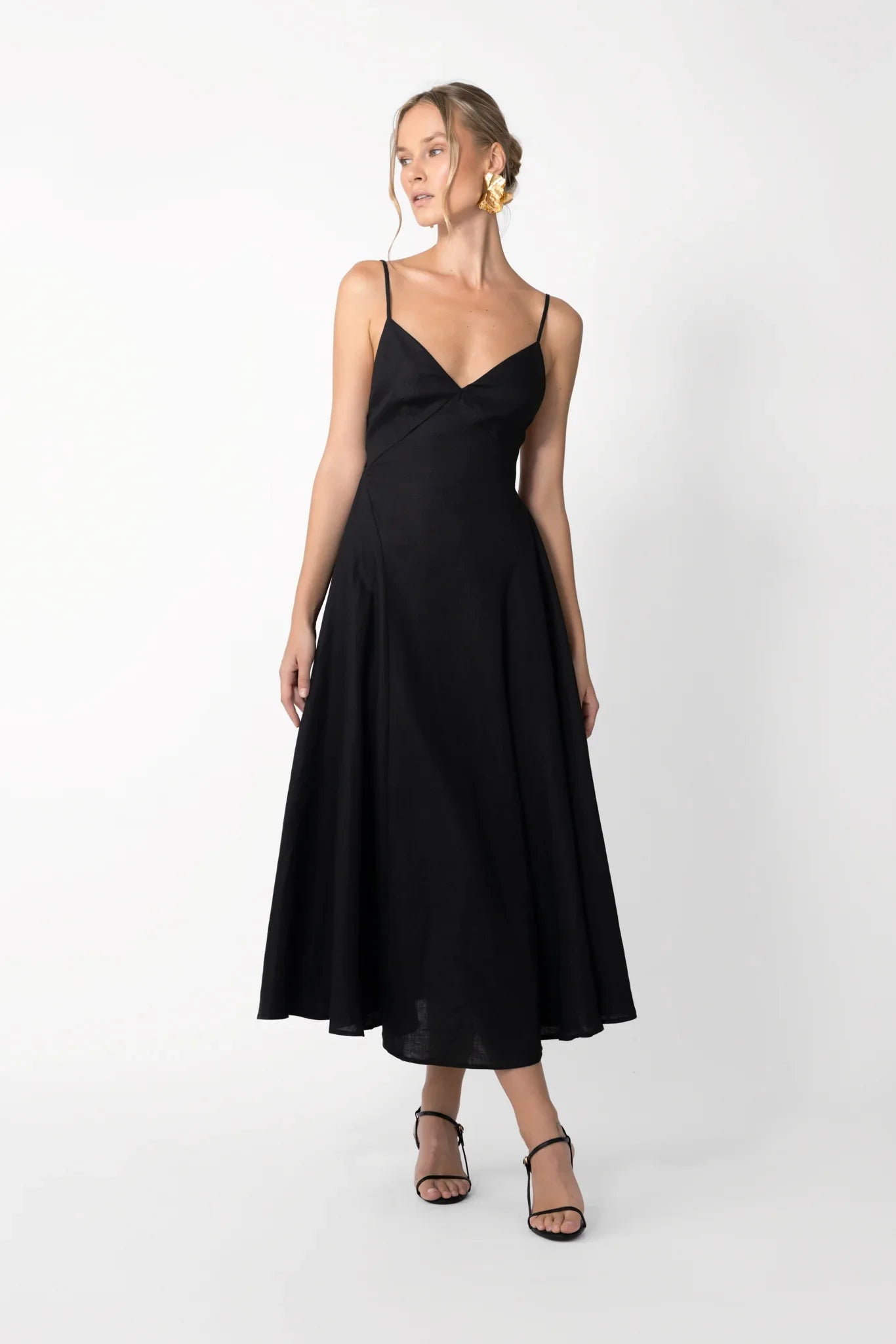 Backless linen midi sundress featuring deep V-neckline