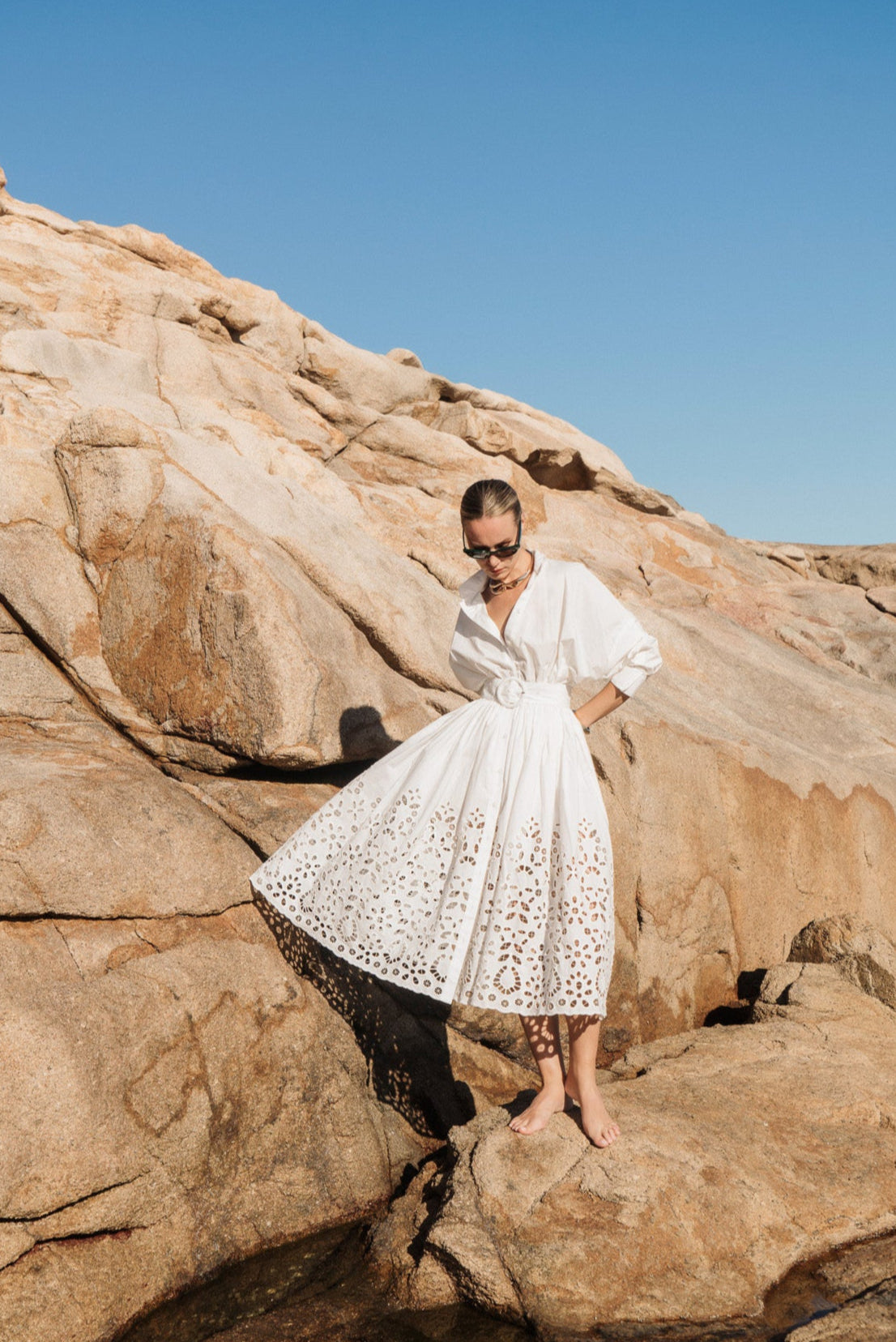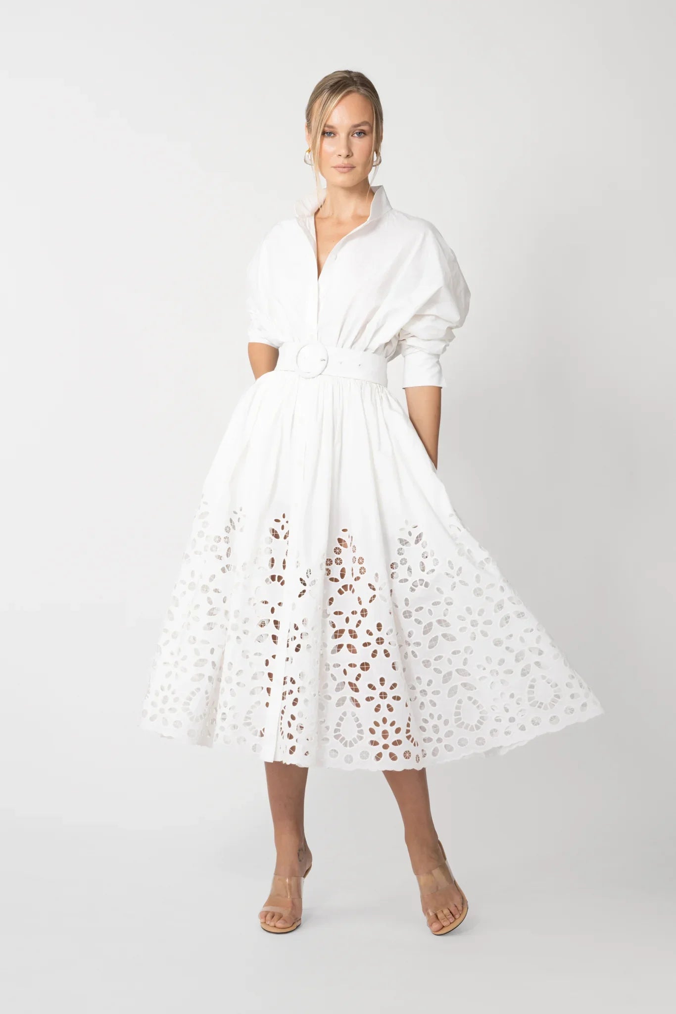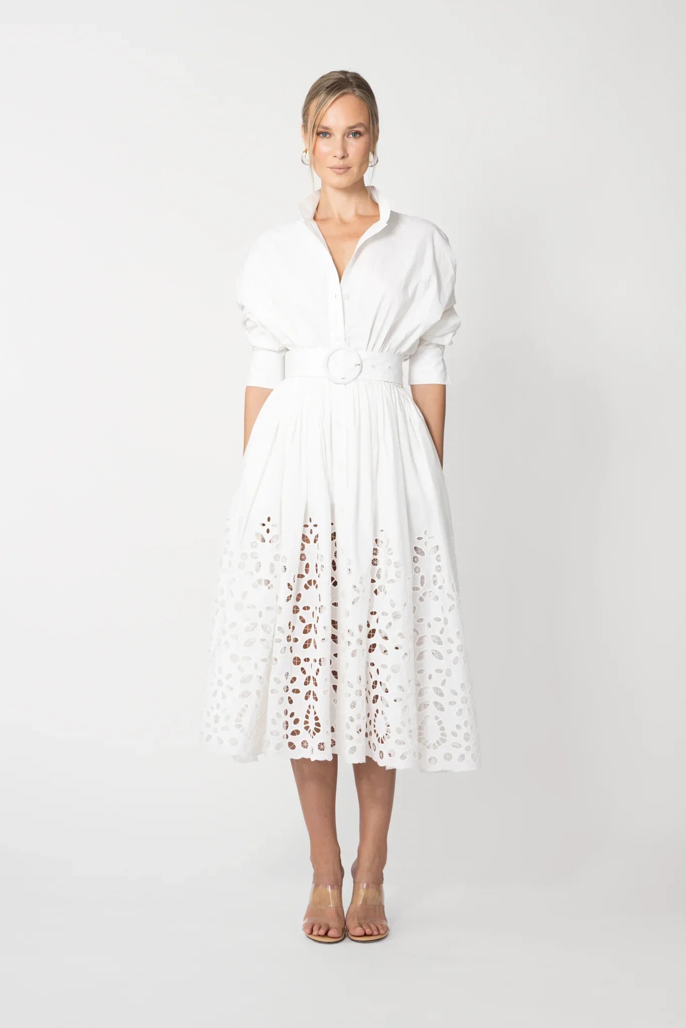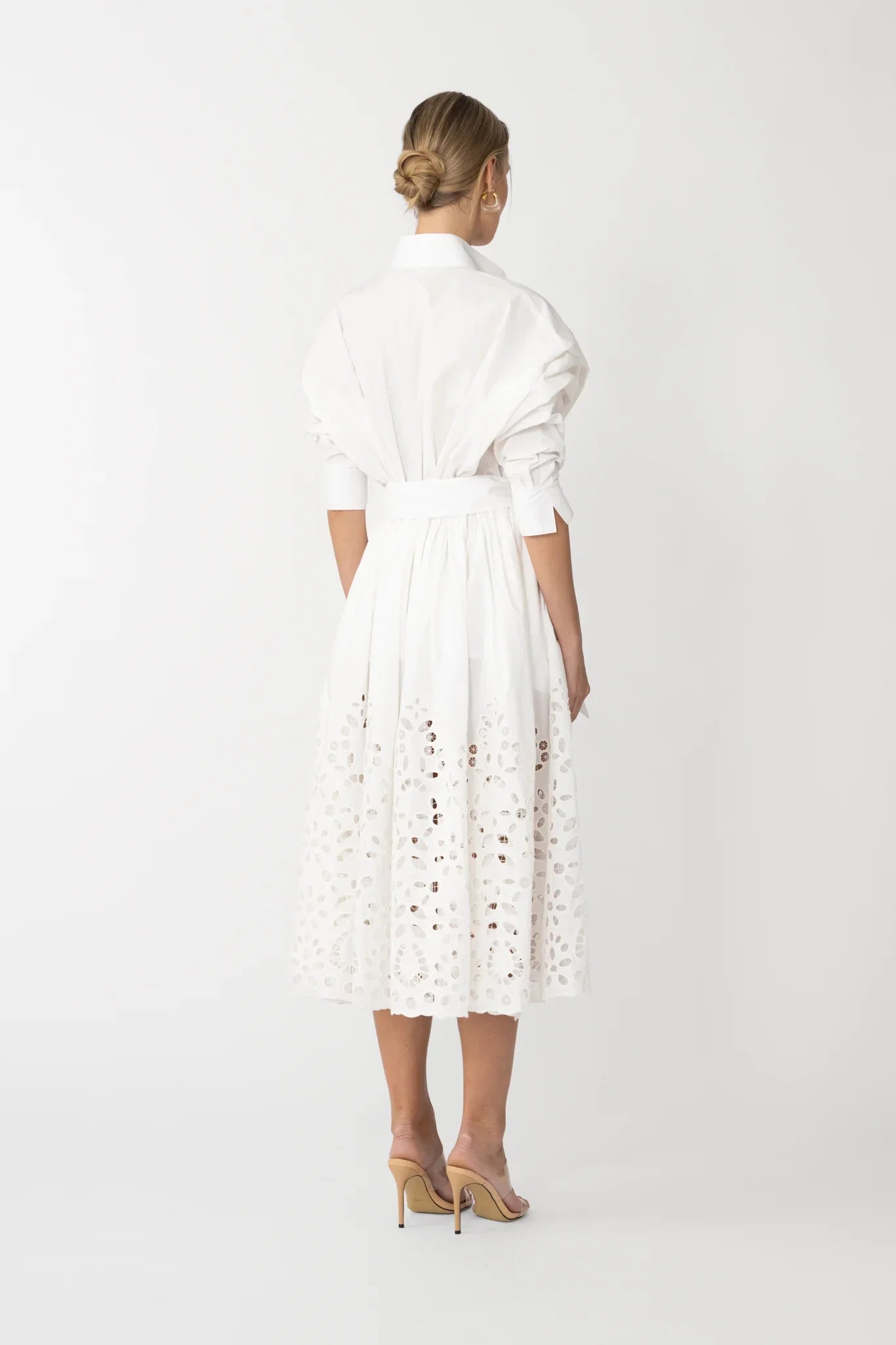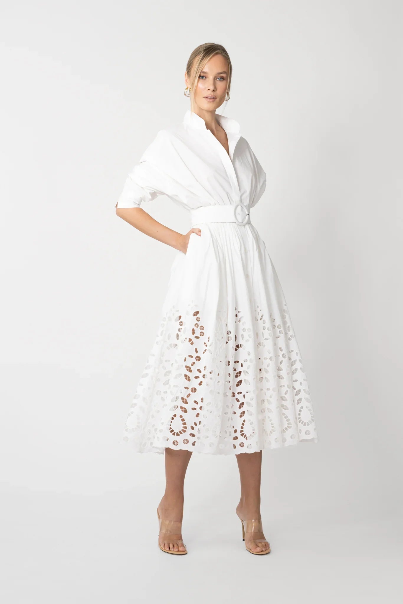 Cotton poplin midi shirtdress with classic mandarin collar, embroidered eyelet detail, and scalloped hem