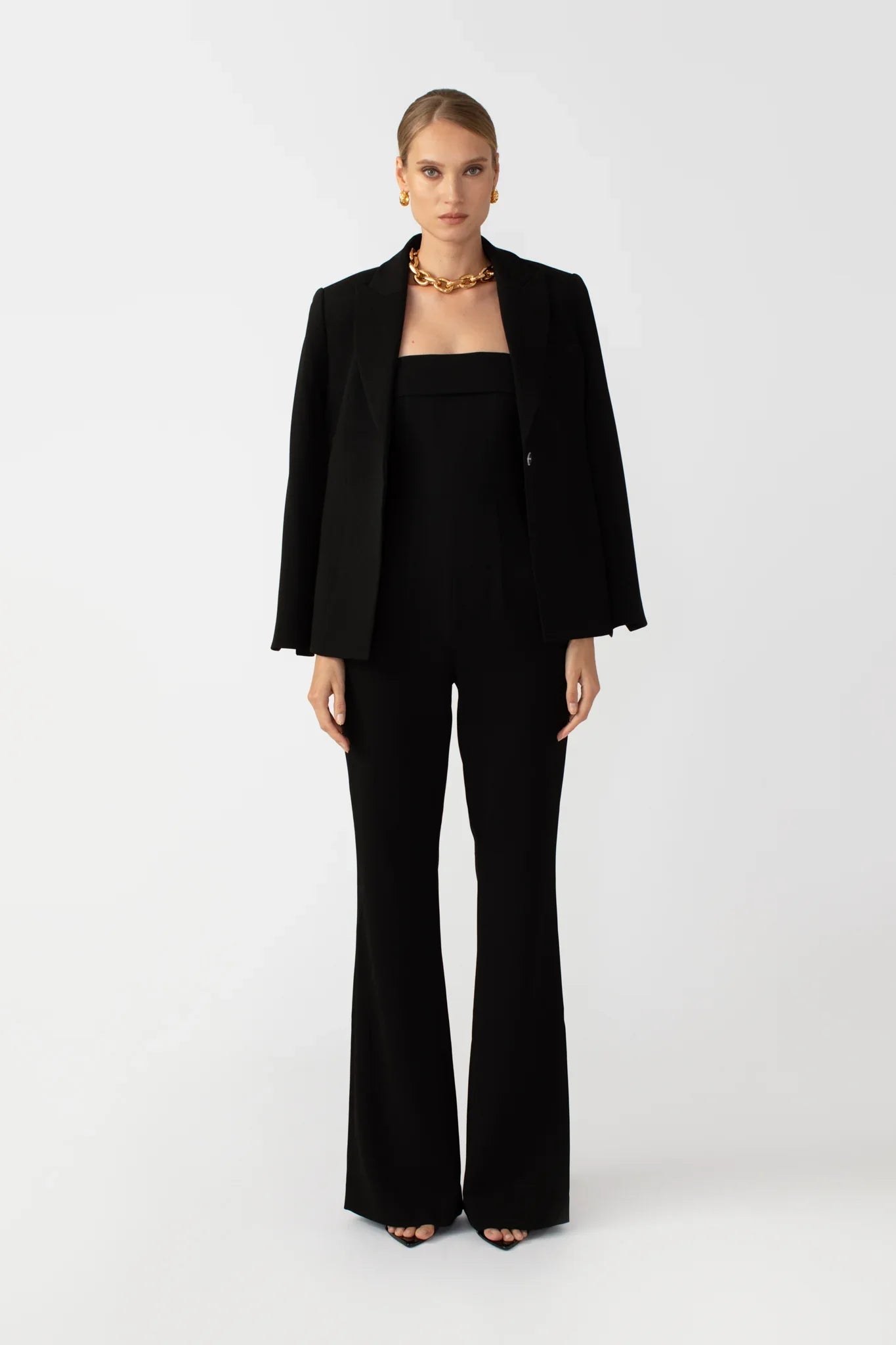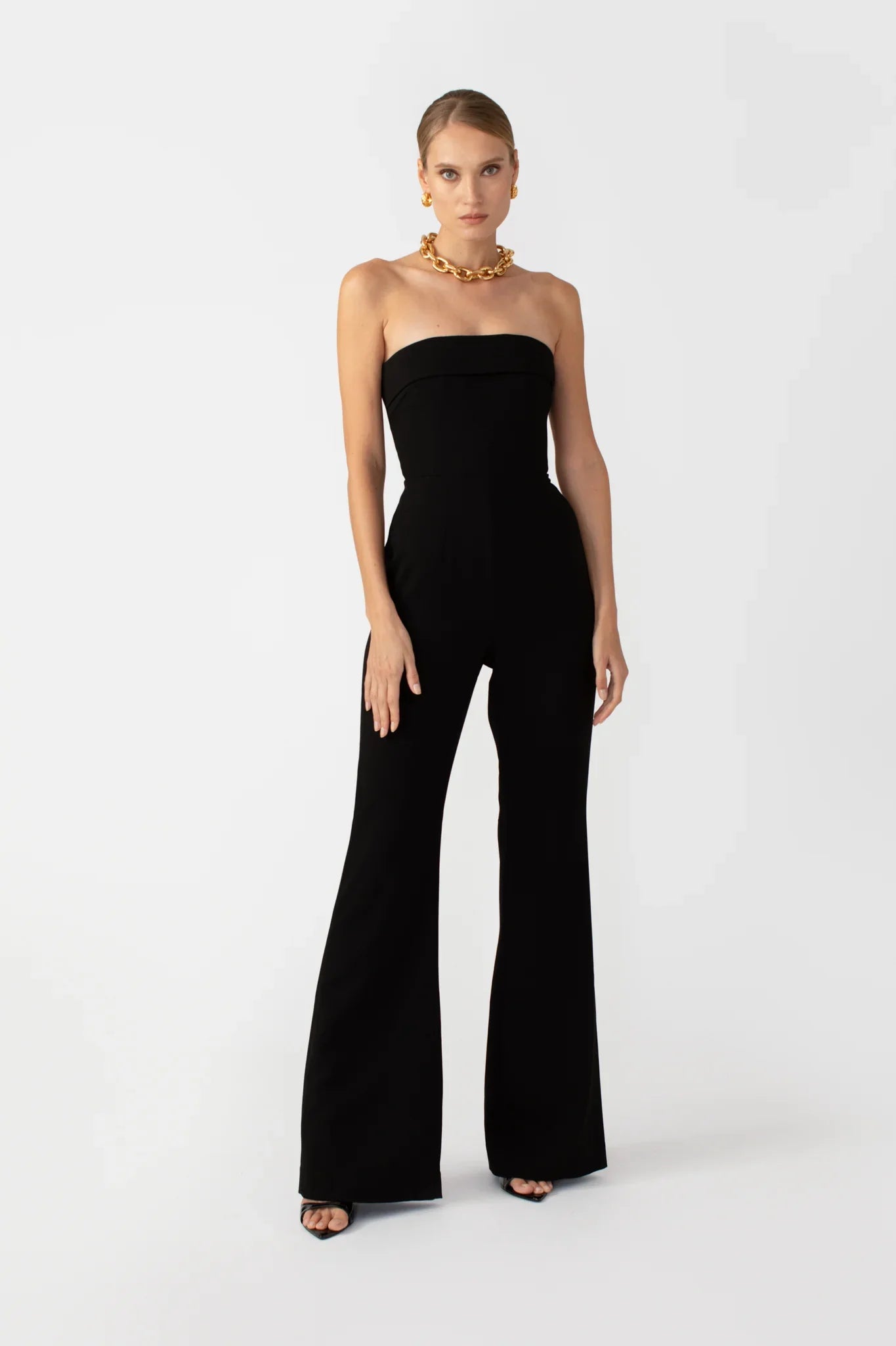 Imogen is a flattering strapless jumpsuit cut from smooth crepe. A modern silhouette with a boned bodice for a snug fit on top while hugging the hips comfortably with a modestly flared leg.