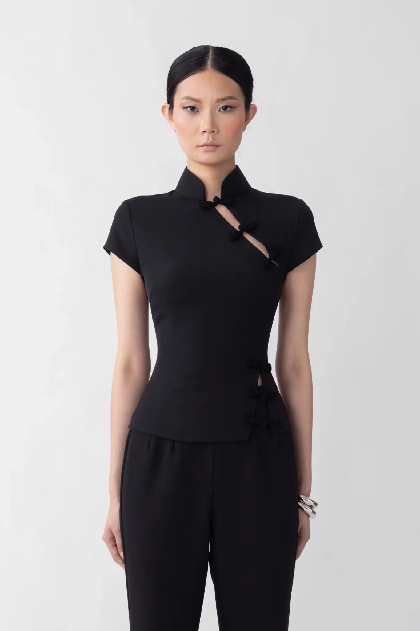 Crepe Cheongsam-inspired top featuring our hand-tied pipa knot buttons