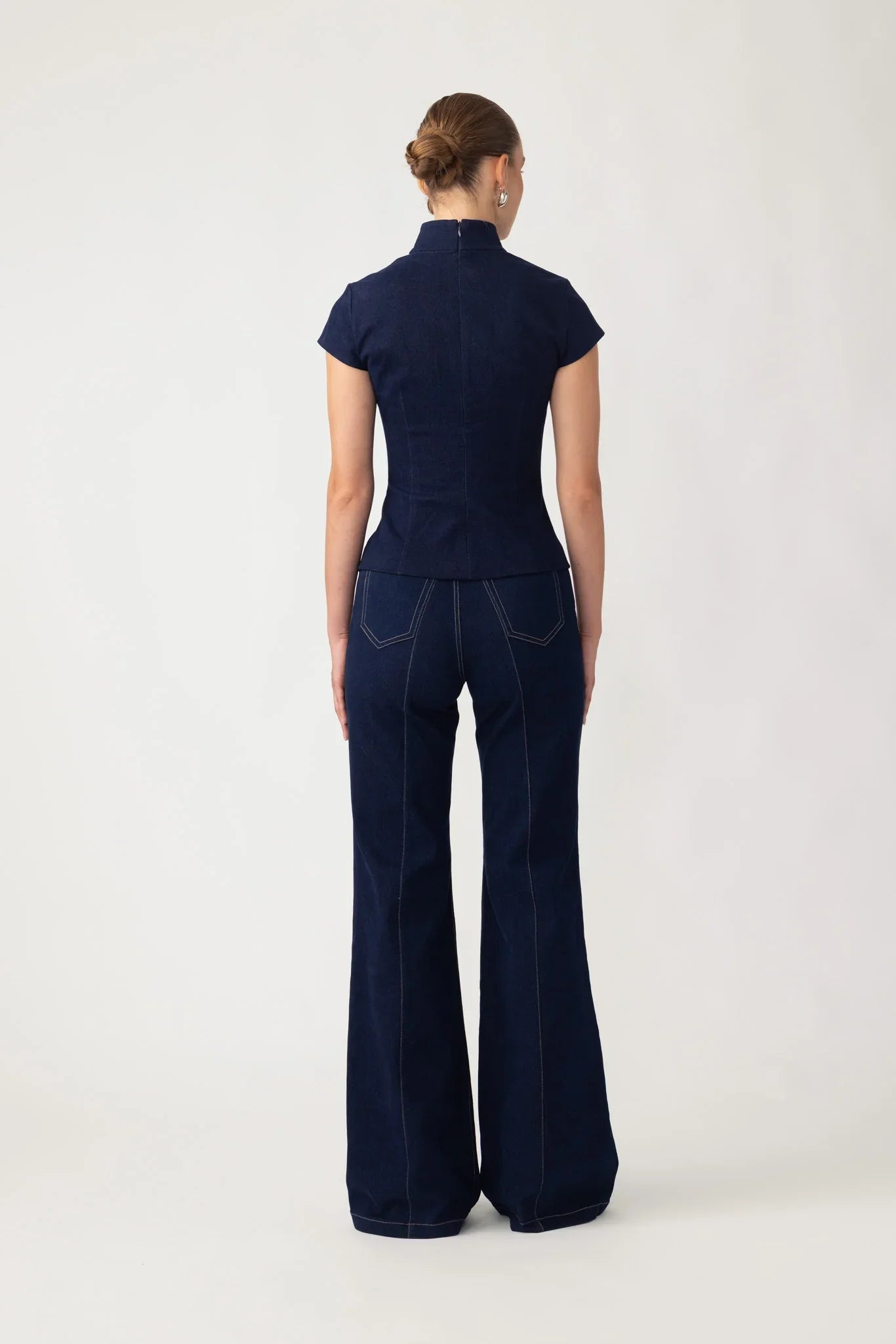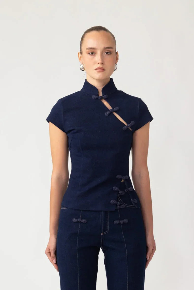 The Iris Denim Top is a fitted, cheongsam-inspired cut crafted from soft denim and finished with decorative hand-tied pipa knots.