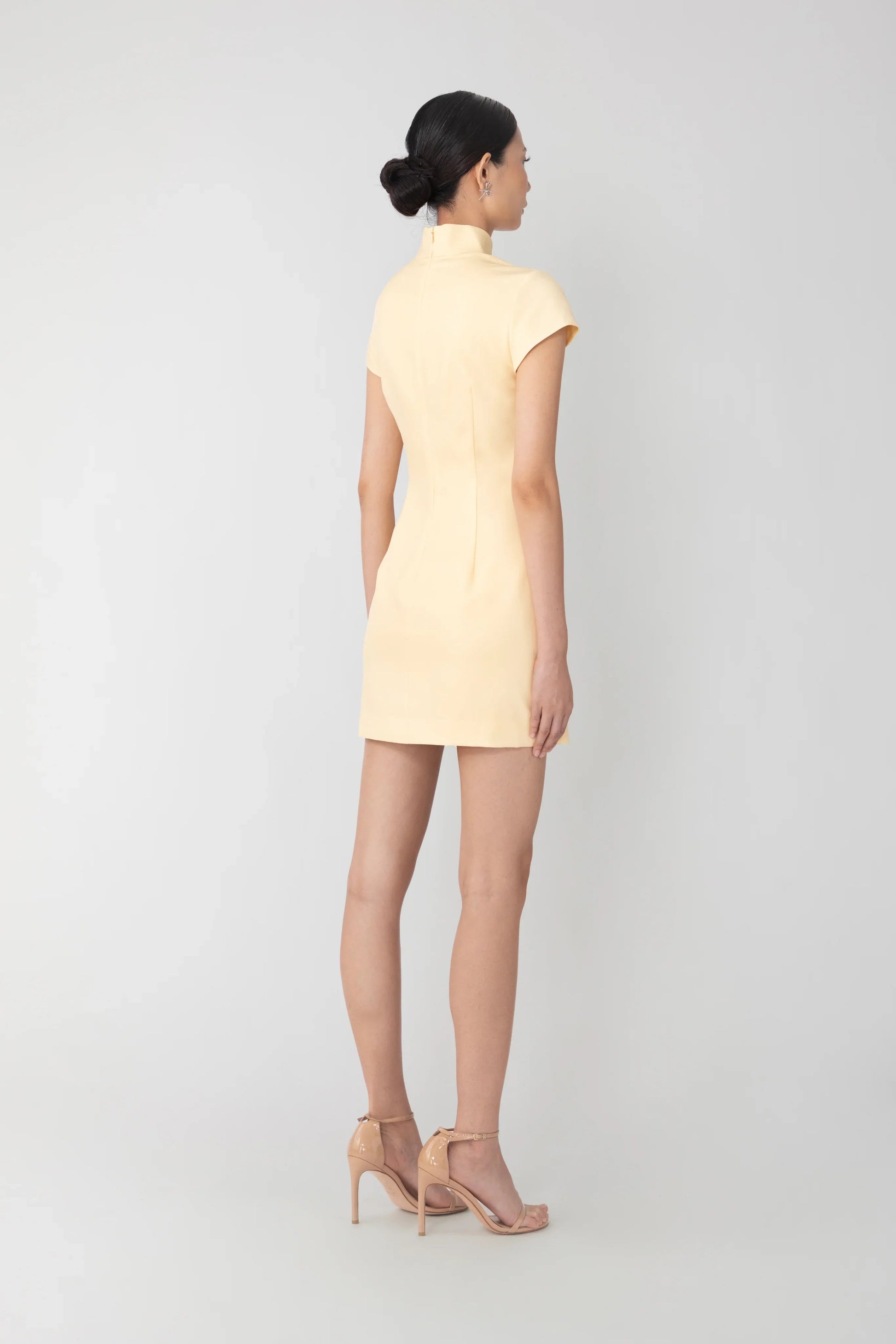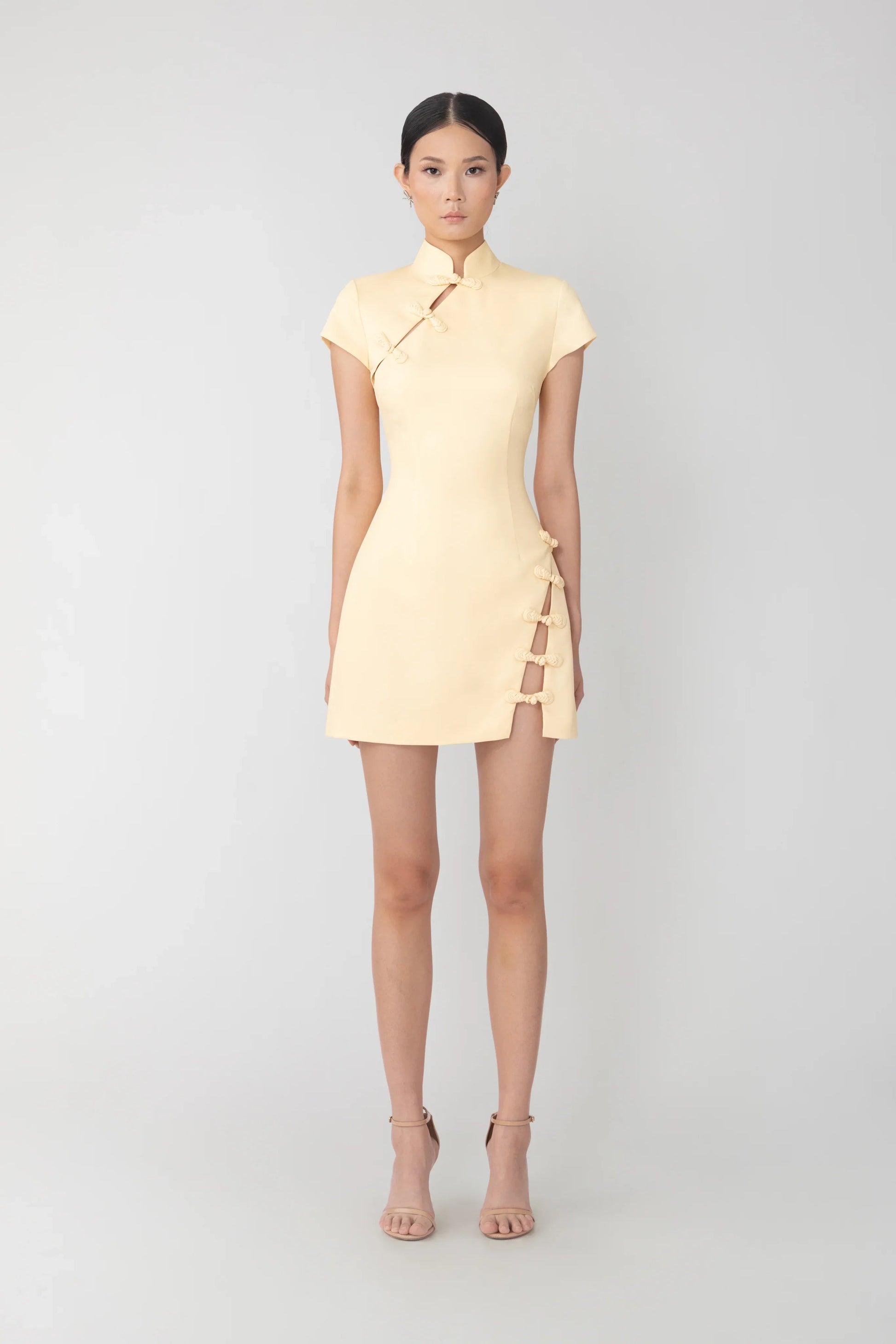 The Iris Mini Dress is a bold reinterpretation of the cheongsam, cut in crepe. Featuring hand-tied pipa knots at the neckline, it’s a striking silhouette with modern edge.