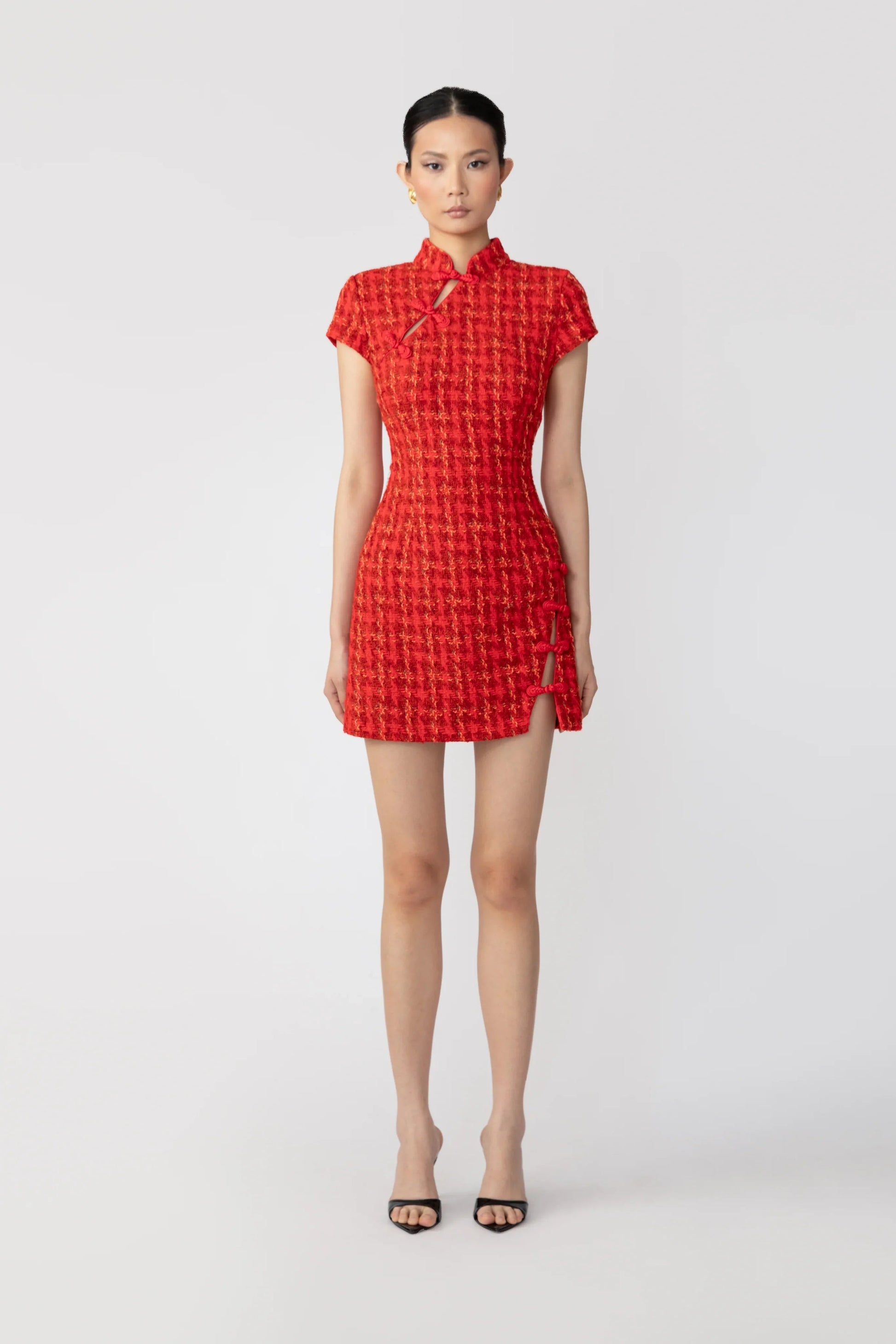 Modern Cheongsam mini dress featuring our signature hand-tied pipa knot button detail