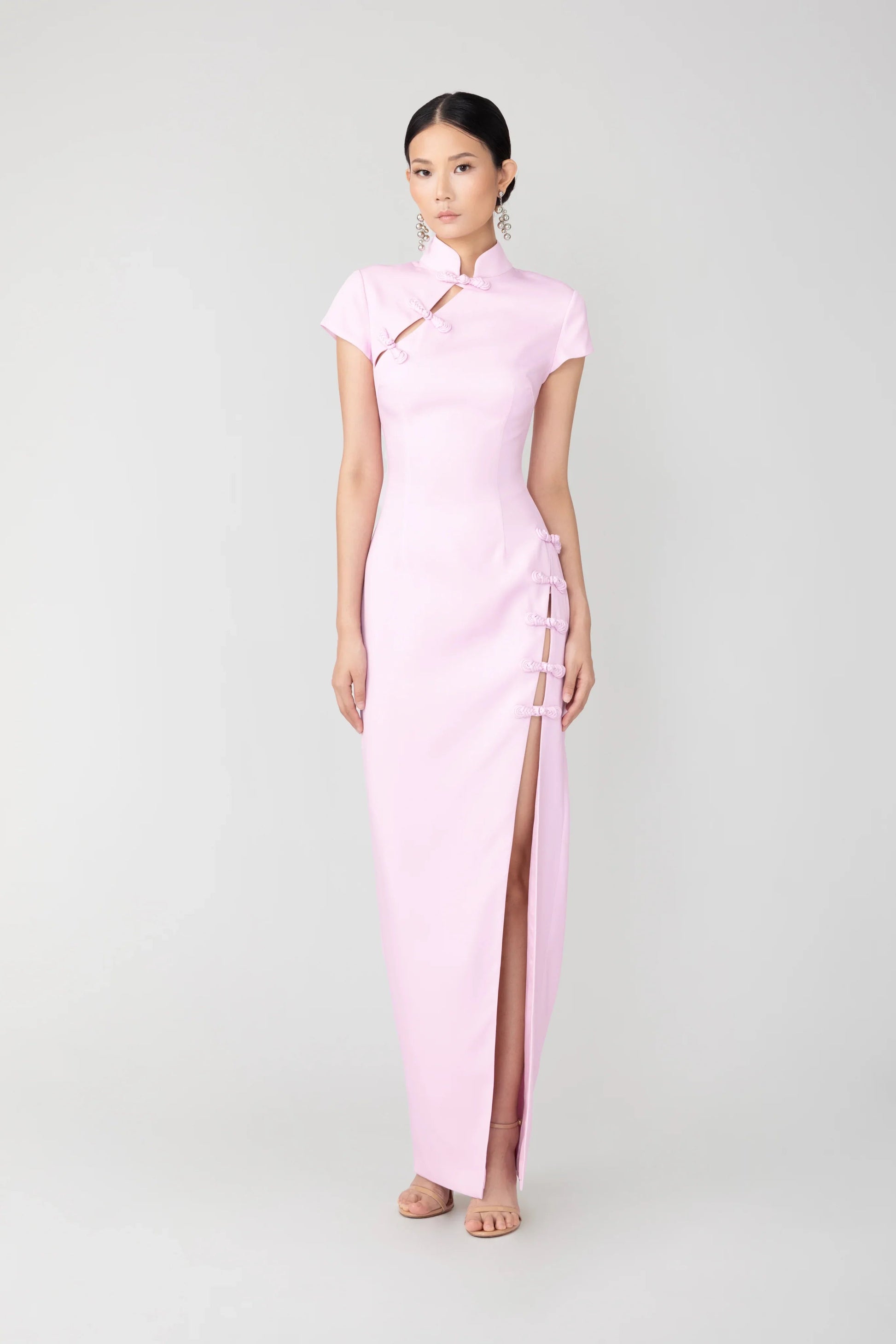 Modern Cheongsam maxi dress made of crepe for a flattering fit. Featuring a Mandarin collar with asymmetrical slits and larger signature hand-tied pipa knot button detail.