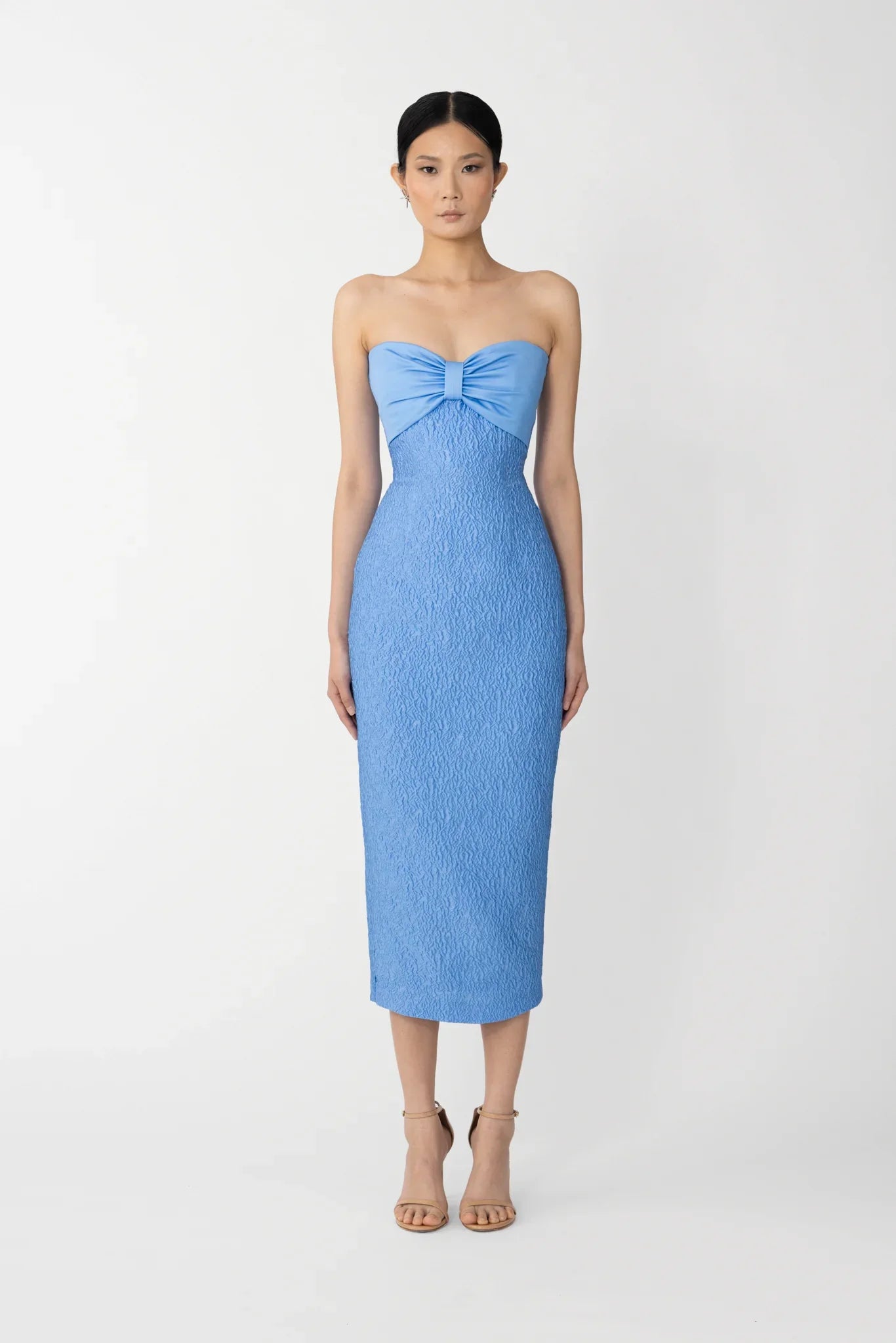 Cloqué jacquard A-line midi dress with slight stretch featuring satin bow-shaped bust