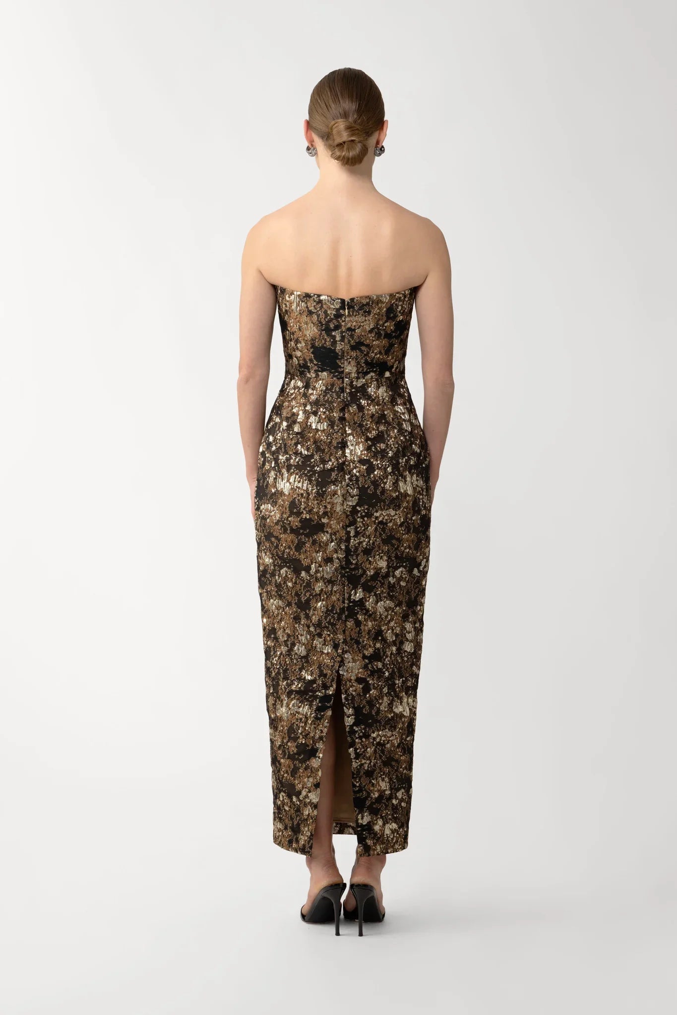 The Jackie Dress is a fitted column dress in black and gold jacquard. Finished with a solid velvet black bow for contrast to highlight the bustline.