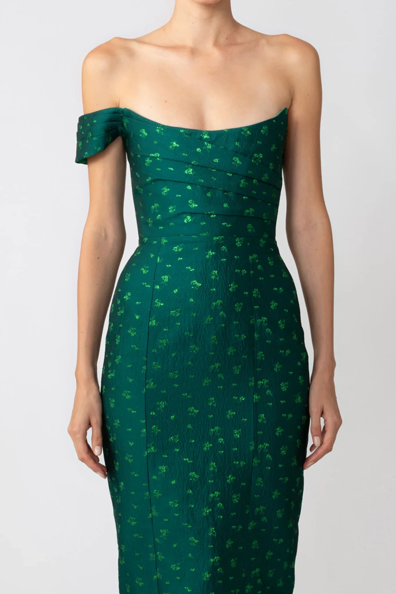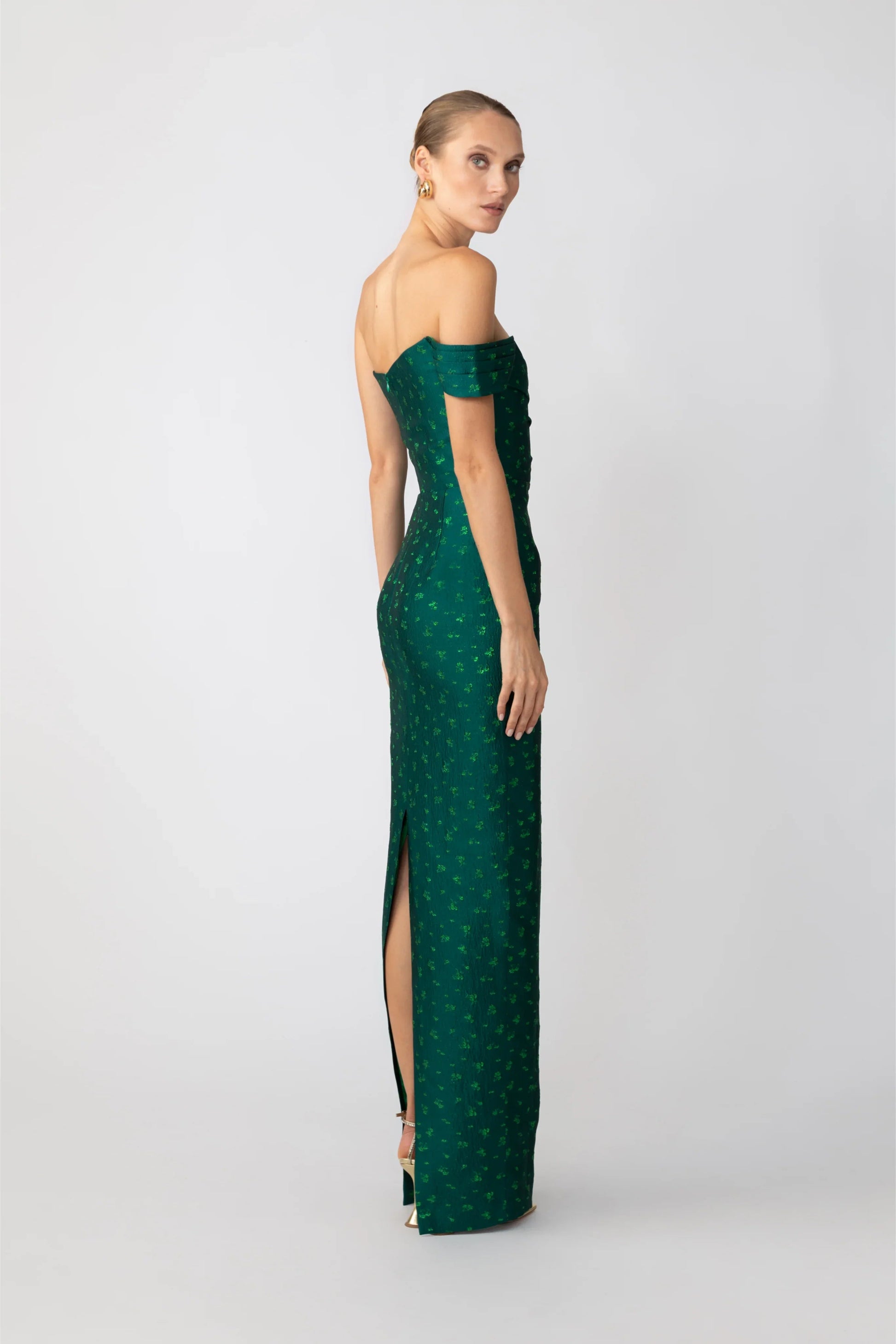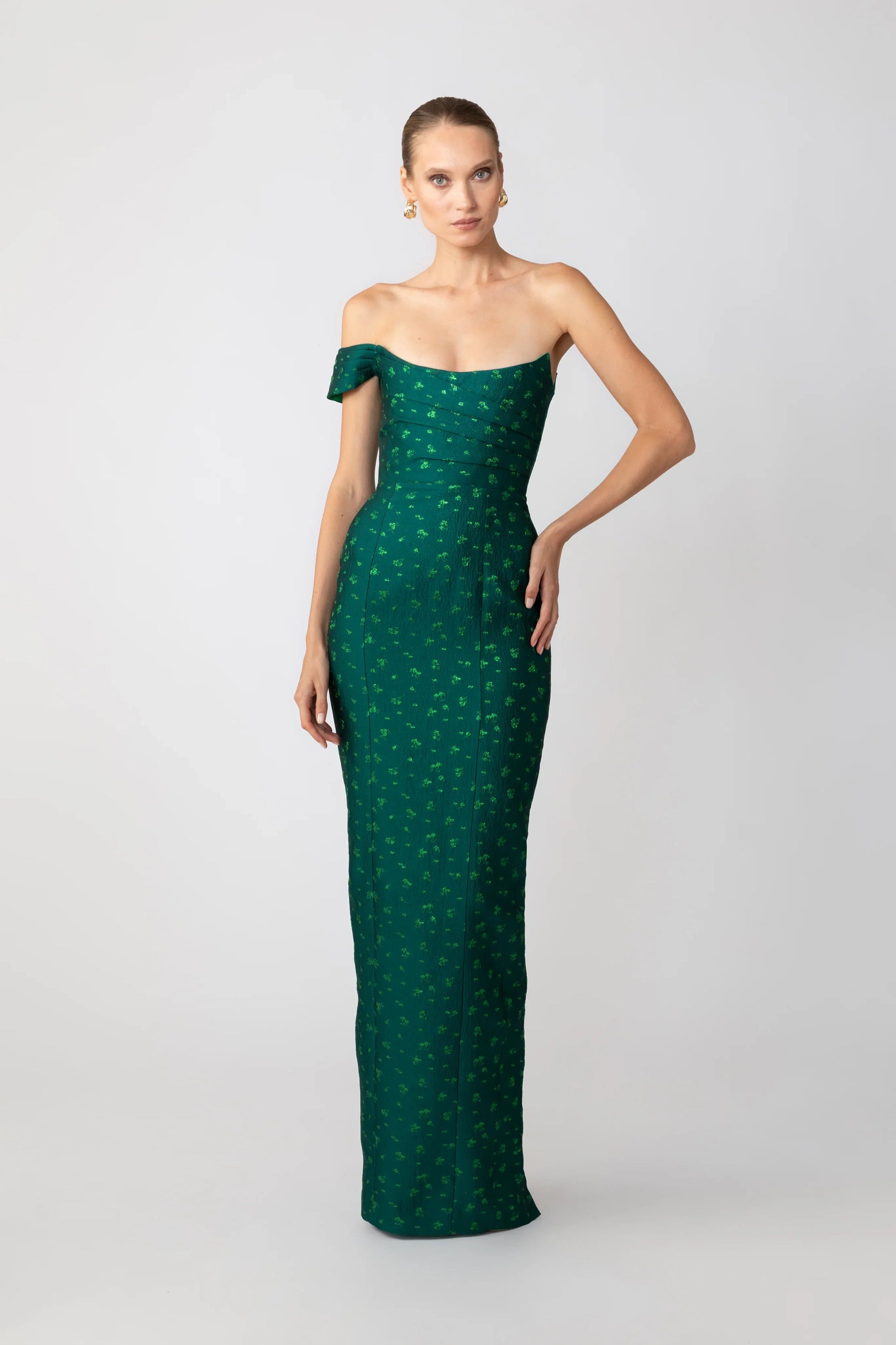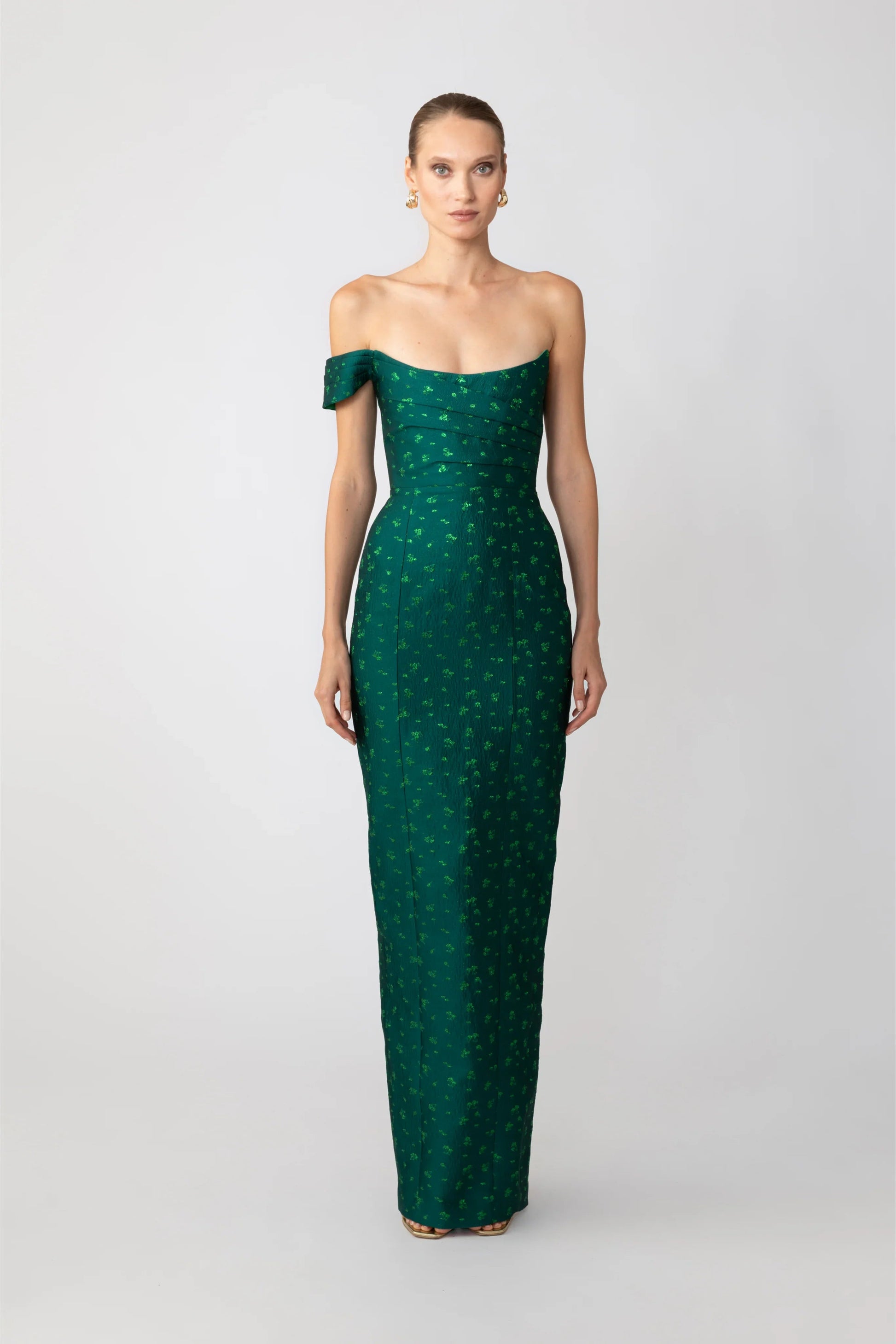 One-shoulder jacquard column gown with a fully-boned corset top featuring a ruched design