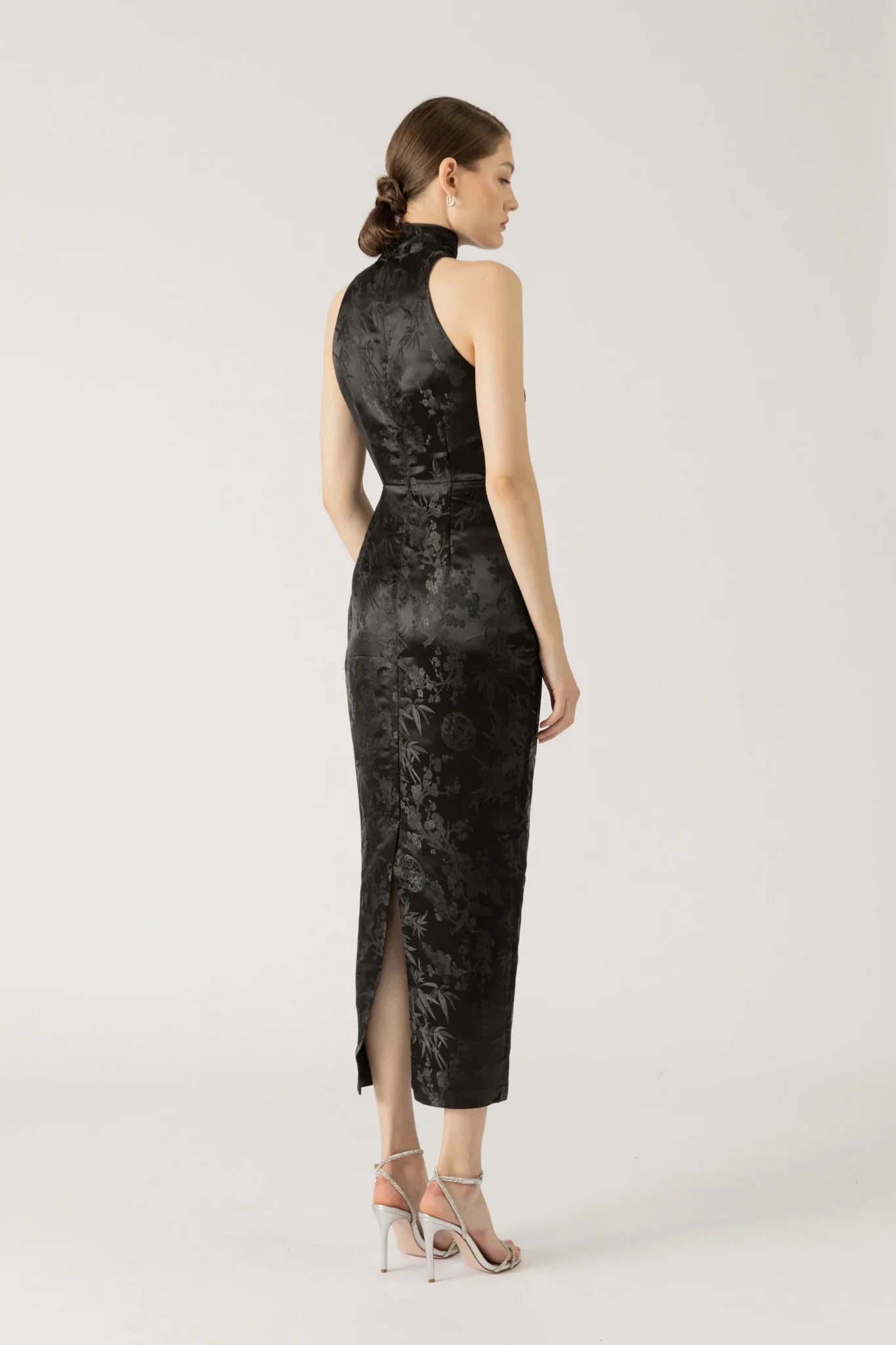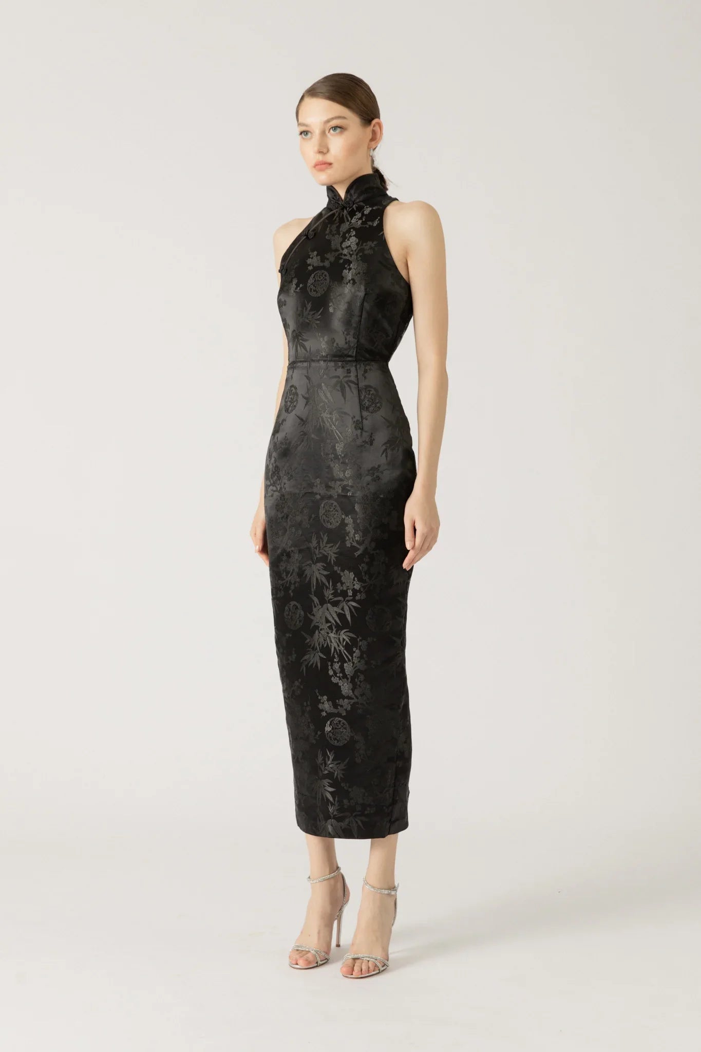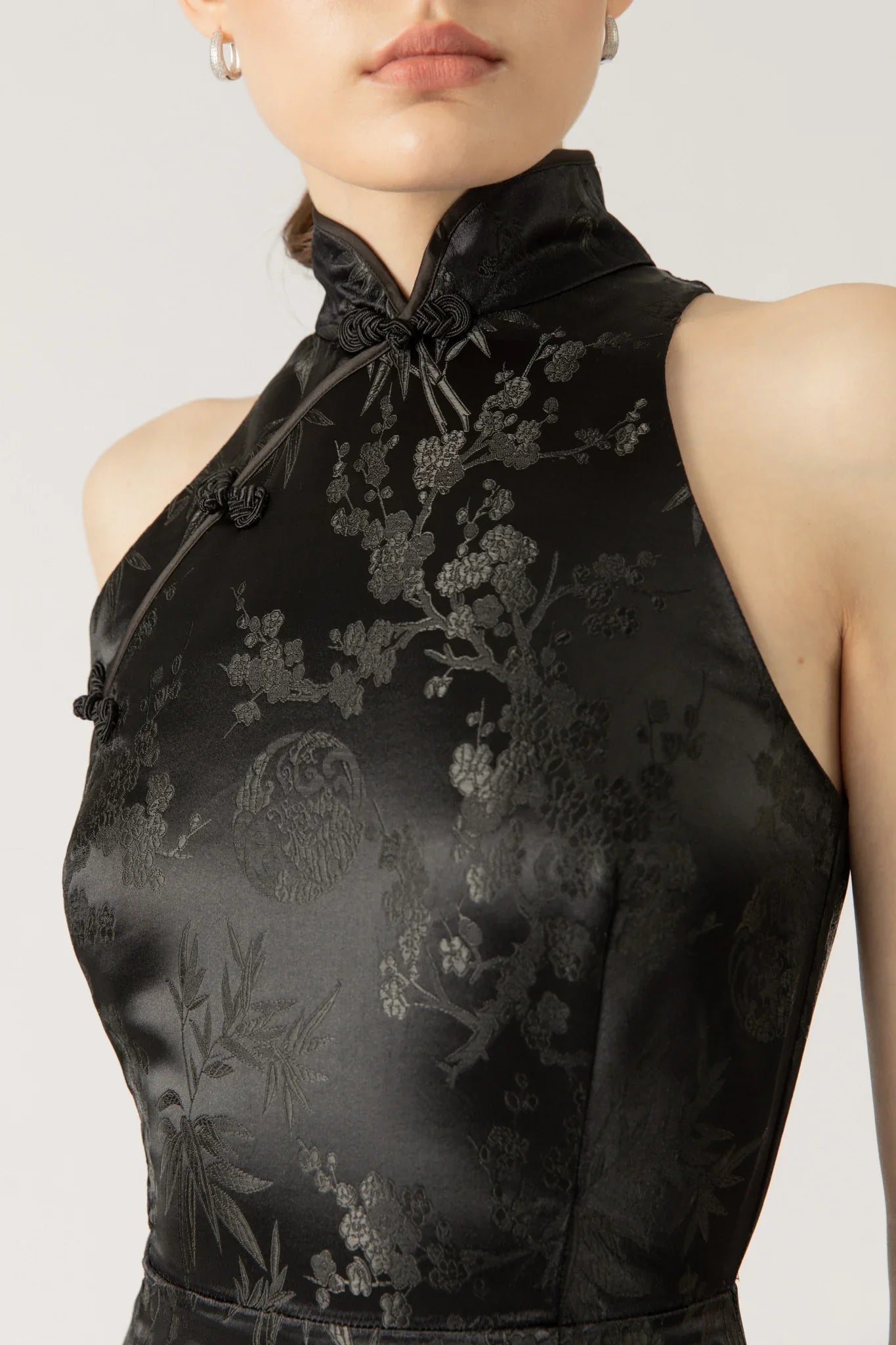Jill is a modern interpretation of the traditional Cheongsam style dress. Cut from Chinese jacquard fabric with a bamboo and cherry blossom design. Featuring a tailored racer style top with exposed shoulders, a traditional Mandarin collar with a shoulder seam fastened with Chinese frog buttons, and an ankle-grazing pencil skirt with a center-back vent.