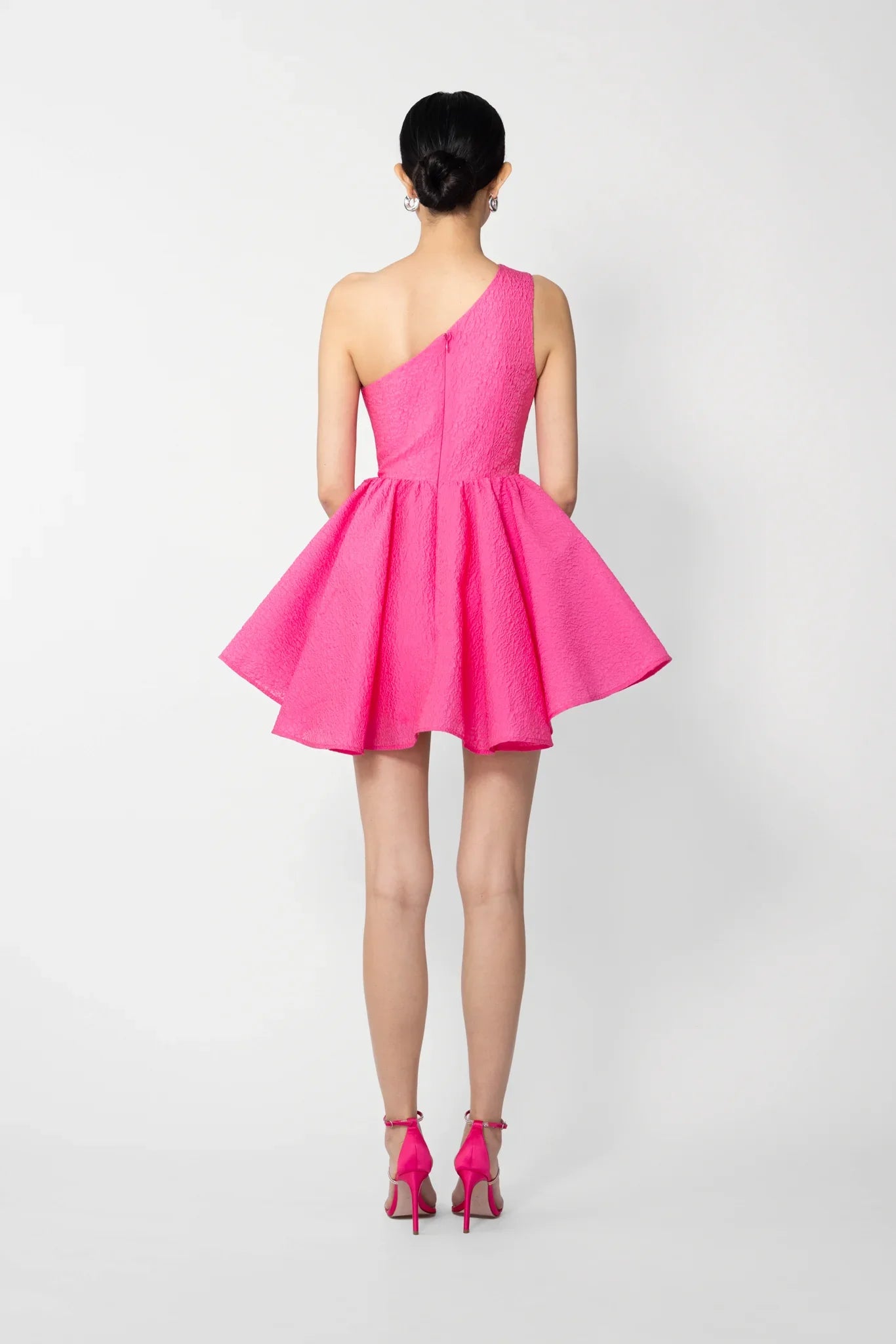 One-shoulder fit-and-flare mini dress in cloque jacquard with satin top trim