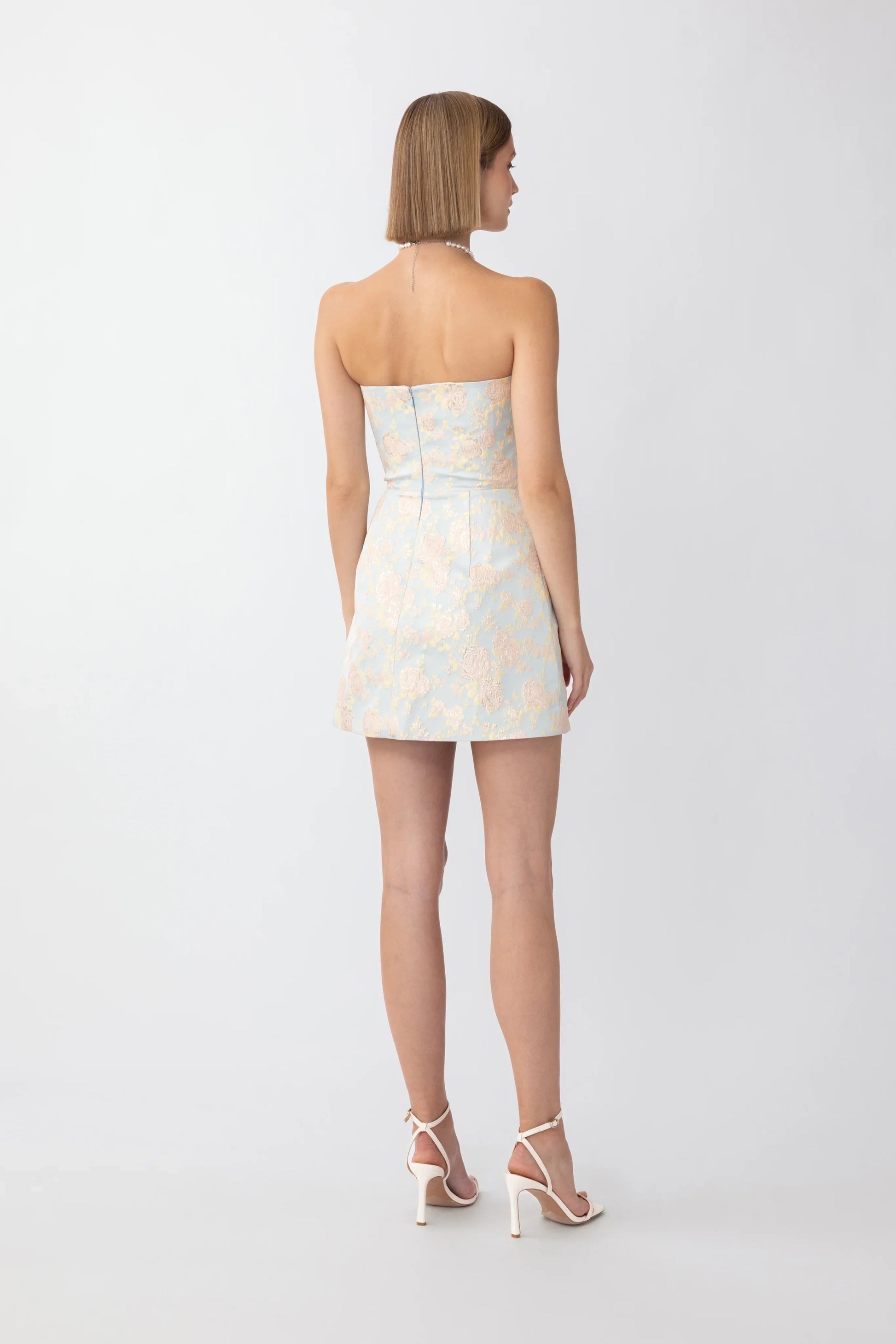 Strapless jacquard mini dress with fully-boned corset and a slight A-line skirt