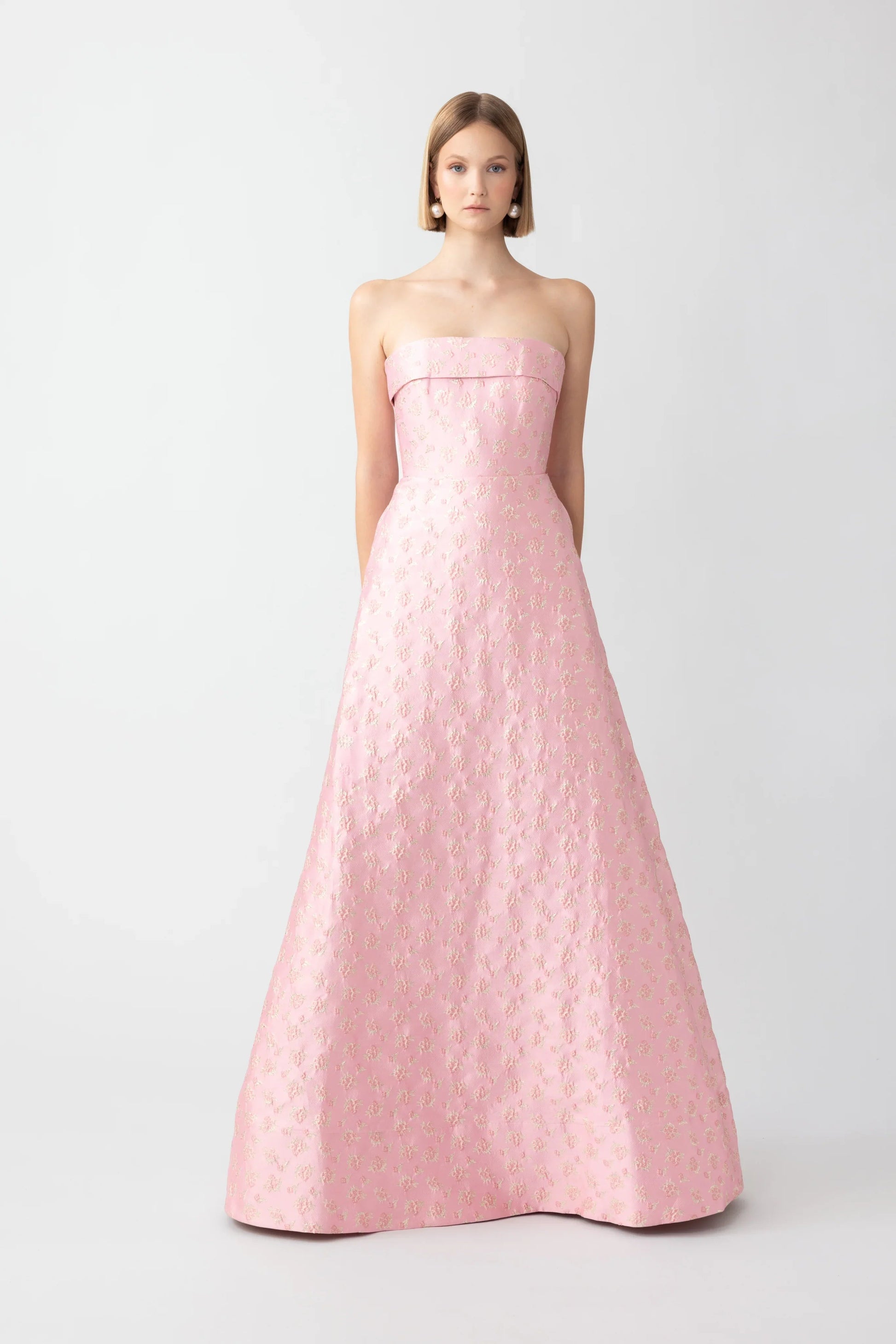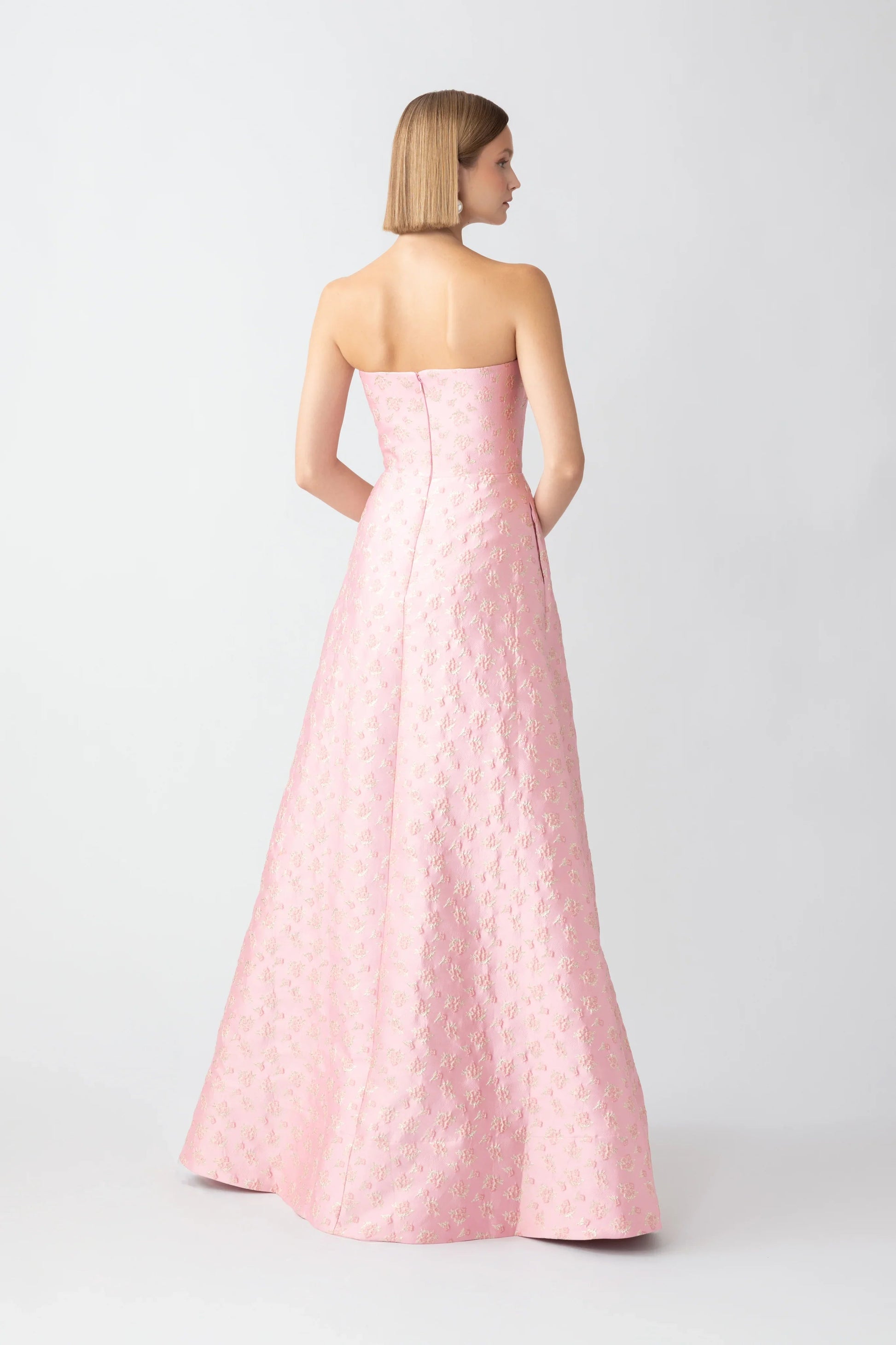 Strapless A-line jacquard gown with fully-boned corset and pockets on the sides