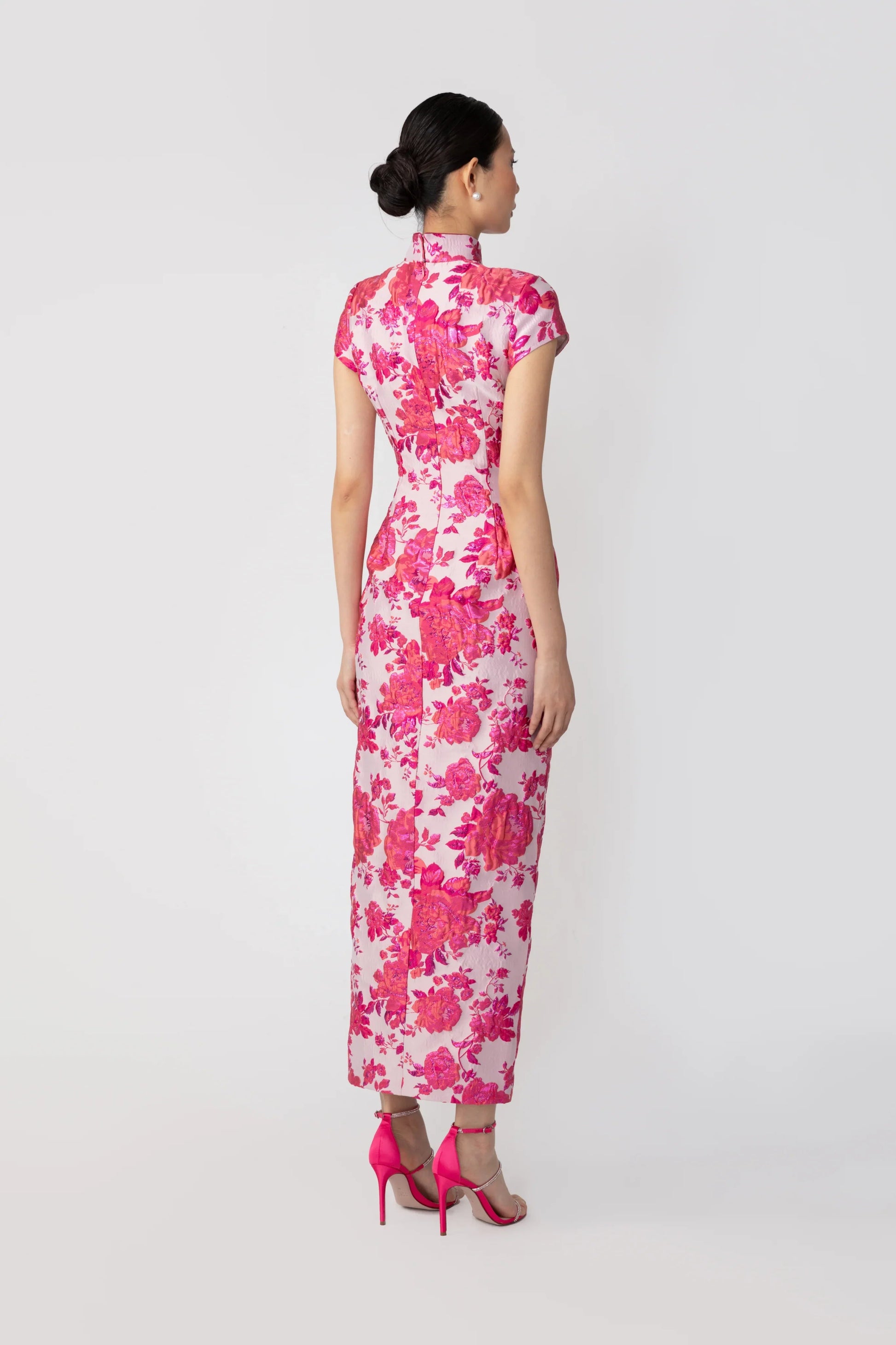Modern Cheongsam jacquard midi dress with a Mandarin collar and cap sleeves featuring our signature hand-tied pipa knot detail