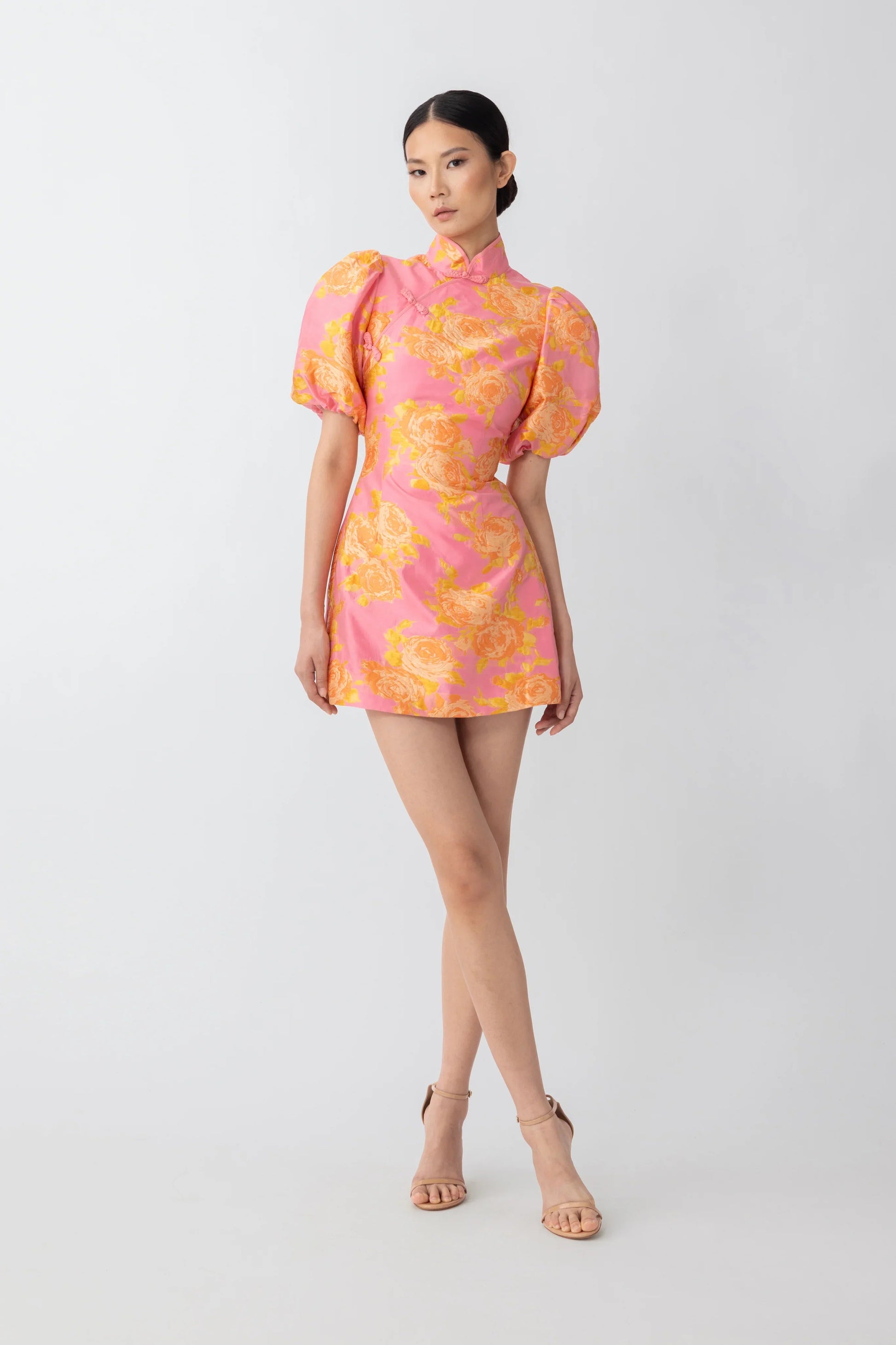 Jacquard mini dress with puffed sleeves and a Mandarin collar featuring our signature hand-tied pipa knot detail