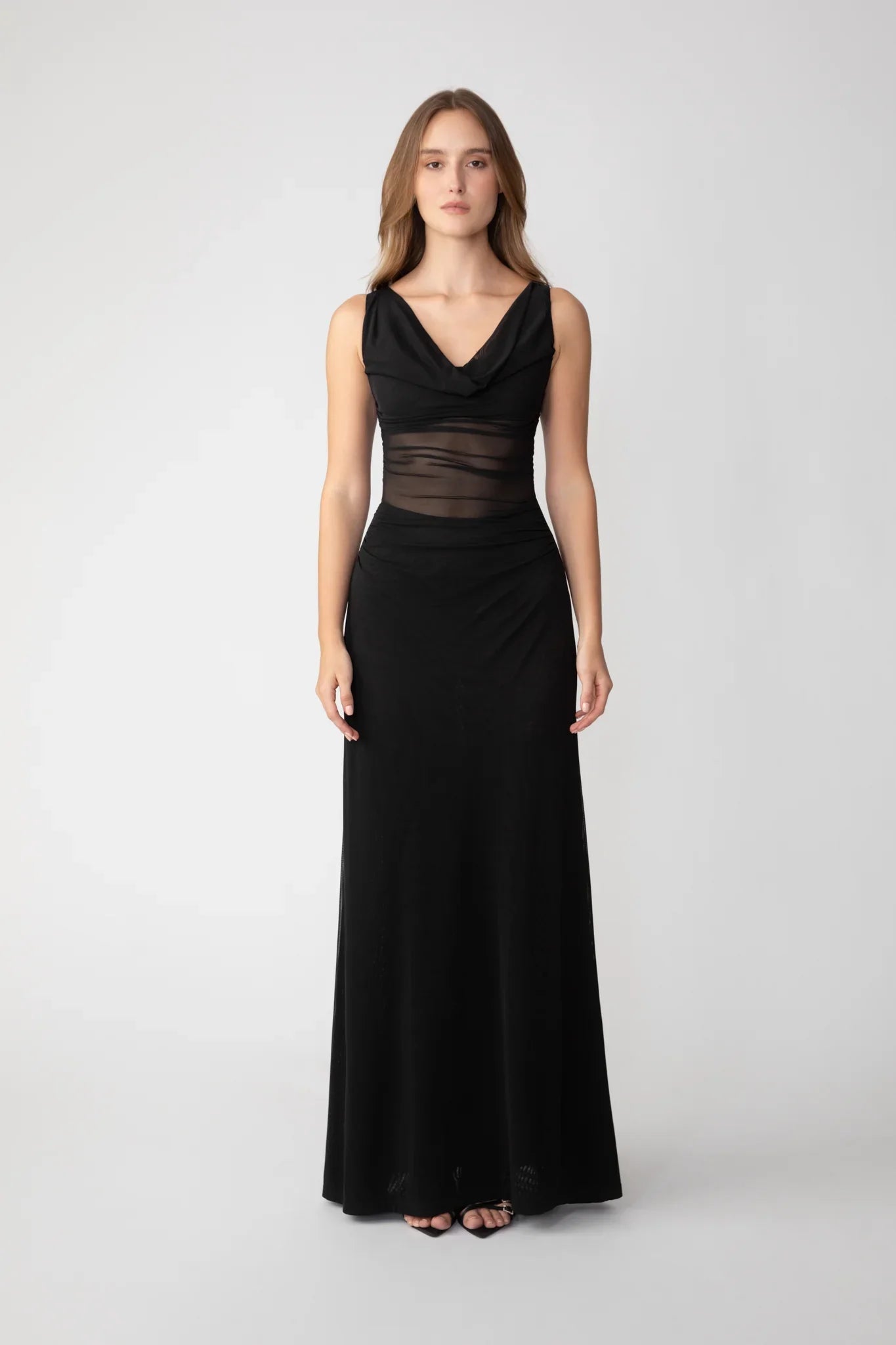 Kelsey Dress is a romantic bold beauty of black mesh featuring a playful cowl neck with a sheer mid-section that hugs the figure and softly drapes into a maxi skirt for an effortlessly sensual look.