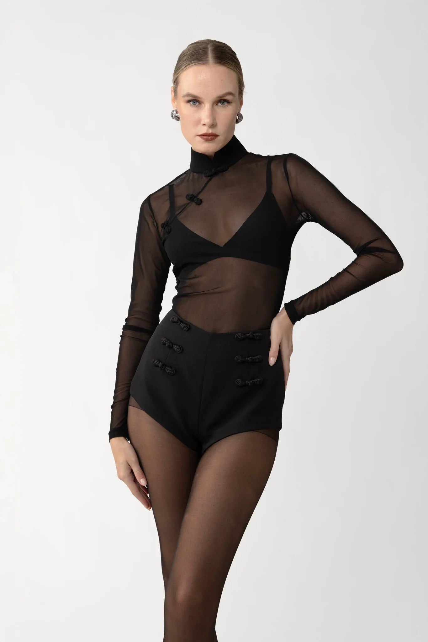 The Kia Top is crafted from lightweight sheer knit, featuring a mandarin collar and hand-tied pipa knots at the neckline. Its sheer finish makes it ideal for layered evening looks.